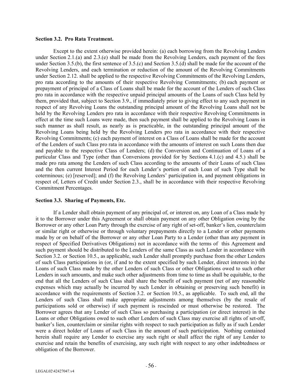 Section 3.2. Pro Rata Treatment. Except to the extent otherwise provided herein: (a) each borrowing from the Revolving Lenders under Section 2.1.(a) and 2.3.(e) shall be made from the Revolving Lenders, each payment of the fees under Section 3.5.(b), the first sentence of 3.5.(c) and Section 3.5.(d) shall be made for the account of the Revolving Lenders, and each termination or reduction of the amount of the Revolving Commitments under Section 2.12. shall be applied to the respective Revolving Commitments of the Revolving Lenders, pro rata according to the amounts of their respective Revolving Commitments; (b) each payment or prepayment of principal of a Class of Loans shall be made for the account of the Lenders of such Class pro rata in accordance with the respective unpaid principal amounts of the Loans of such Class held by them, provided that, subject to Section 3.9., if immediately prior to giving effect to any such payment in respect of any Revolving Loans the outstanding principal amount of the Revolving Loans shall not be held by the Revolving Lenders pro rata in accordance with their respective Revolving Commitments in effect at the time such Loans were made, then such payment shall be applied to the Revolving Loans in such manner as shall result, as nearly as is practicable, in the outstanding principal amount of the Revolving Loans being held by the Revolving Lenders pro rata in accordance with their respective Revolving Commitments; (c) each payment of interest on a Class of Loans shall be made for the account of the Lenders of such Class pro rata in accordance with the amounts of interest on such Loans then due and payable to the respective Class of Lenders; (d) the Conversion and Continuation of Loans of a particular Class and Type (other than Conversions provided for by Sections 4.1.(c) and 4.5.) shall be made pro rata among the Lenders of such Class according to the amounts of their Loans of such Class and the then current Interest Period for each Lender’s portion of each Loan of such Type shall be coterminous; (e) [reserved]; and (f) the Revolving Lenders’ participation in, and payment obligations in respect of, Letters of Credit under Section 2.3., shall be in accordance with their respective Revolving Commitment Percentages. Section 3.3. Sharing of Payments, Etc. If a Lender shall obtain payment of any principal of, or interest on, any Loan of a Class made by it to the Borrower under this Agreement or shall obtain payment on any other Obligation owing by the Borrower or any other Loan Party through the exercise of any right of set-off, banker’s lien, counterclaim or similar right or otherwise or through voluntary prepayments directly to a Lender or other payments made by or on behalf of the Borrower or any other Loan Party to a Lender (other than any payment in respect of Specified Derivatives Obligations) not in accordance with the terms of this Agreement and such payment should be distributed to the Lenders of the same Class as such Lender in accordance with Section 3.2. or Section 10.5., as applicable, such Lender shall promptly purchase from the other Lenders of such Class participations in (or, if and to the extent specified by such Lender, direct interests in) the Loans of such Class made by the other Lenders of such Class or other Obligations owed to such other Lenders in such amounts, and make such other adjustments from time to time as shall be equitable, to the end that all the Lenders of such Class shall share the benefit of such payment (net of any reasonable expenses which may actually be incurred by such Lender in obtaining or preserving such benefit) in accordance with the requirements of Section 3.2. or Section 10.5., as applicable. To such end, all the Lenders of such Class shall make appropriate adjustments among themselves (by the resale of participations sold or otherwise) if such payment is rescinded or must otherwise be restored. The Borrower agrees that any Lender of such Class so purchasing a participation (or direct interest) in the Loans or other Obligations owed to such other Lenders of such Class may exercise all rights of set-off, banker’s lien, counterclaim or similar rights with respect to such participation as fully as if such Lender were a direct holder of Loans of such Class in the amount of such participation. Nothing contained herein shall require any Lender to exercise any such right or shall affect the right of any Lender to exercise and retain the benefits of exercising, any such right with respect to any other indebtedness or obligation of the Borrower. - 56 - LEGAL02\42427047.v4