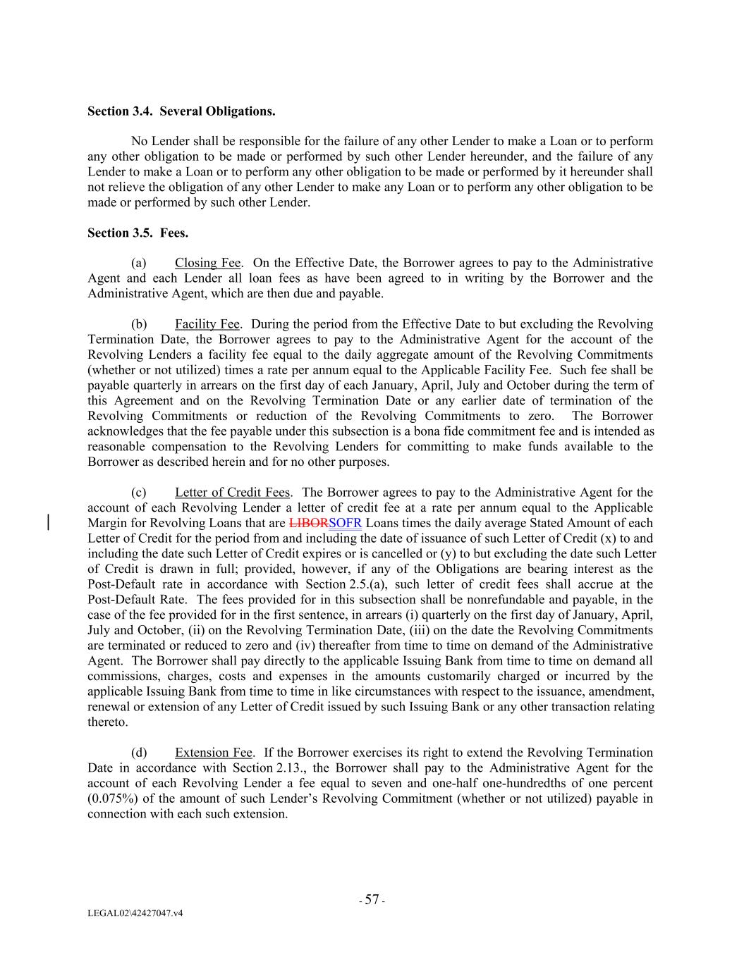 Section 3.4. Several Obligations. No Lender shall be responsible for the failure of any other Lender to make a Loan or to perform any other obligation to be made or performed by such other Lender hereunder, and the failure of any Lender to make a Loan or to perform any other obligation to be made or performed by it hereunder shall not relieve the obligation of any other Lender to make any Loan or to perform any other obligation to be made or performed by such other Lender. Section 3.5. Fees. (a) Closing Fee. On the Effective Date, the Borrower agrees to pay to the Administrative Agent and each Lender all loan fees as have been agreed to in writing by the Borrower and the Administrative Agent, which are then due and payable. (b) Facility Fee. During the period from the Effective Date to but excluding the Revolving Termination Date, the Borrower agrees to pay to the Administrative Agent for the account of the Revolving Lenders a facility fee equal to the daily aggregate amount of the Revolving Commitments (whether or not utilized) times a rate per annum equal to the Applicable Facility Fee. Such fee shall be payable quarterly in arrears on the first day of each January, April, July and October during the term of this Agreement and on the Revolving Termination Date or any earlier date of termination of the Revolving Commitments or reduction of the Revolving Commitments to zero. The Borrower acknowledges that the fee payable under this subsection is a bona fide commitment fee and is intended as reasonable compensation to the Revolving Lenders for committing to make funds available to the Borrower as described herein and for no other purposes. (c) Letter of Credit Fees. The Borrower agrees to pay to the Administrative Agent for the account of each Revolving Lender a letter of credit fee at a rate per annum equal to the Applicable Margin for Revolving Loans that are LIBORSOFR Loans times the daily average Stated Amount of each Letter of Credit for the period from and including the date of issuance of such Letter of Credit (x) to and including the date such Letter of Credit expires or is cancelled or (y) to but excluding the date such Letter of Credit is drawn in full; provided, however, if any of the Obligations are bearing interest as the Post-Default rate in accordance with Section 2.5.(a), such letter of credit fees shall accrue at the Post-Default Rate. The fees provided for in this subsection shall be nonrefundable and payable, in the case of the fee provided for in the first sentence, in arrears (i) quarterly on the first day of January, April, July and October, (ii) on the Revolving Termination Date, (iii) on the date the Revolving Commitments are terminated or reduced to zero and (iv) thereafter from time to time on demand of the Administrative Agent. The Borrower shall pay directly to the applicable Issuing Bank from time to time on demand all commissions, charges, costs and expenses in the amounts customarily charged or incurred by the applicable Issuing Bank from time to time in like circumstances with respect to the issuance, amendment, renewal or extension of any Letter of Credit issued by such Issuing Bank or any other transaction relating thereto. (d) Extension Fee. If the Borrower exercises its right to extend the Revolving Termination Date in accordance with Section 2.13., the Borrower shall pay to the Administrative Agent for the account of each Revolving Lender a fee equal to seven and one-half one-hundredths of one percent (0.075%) of the amount of such Lender’s Revolving Commitment (whether or not utilized) payable in connection with each such extension. - 57 - LEGAL02\42427047.v4