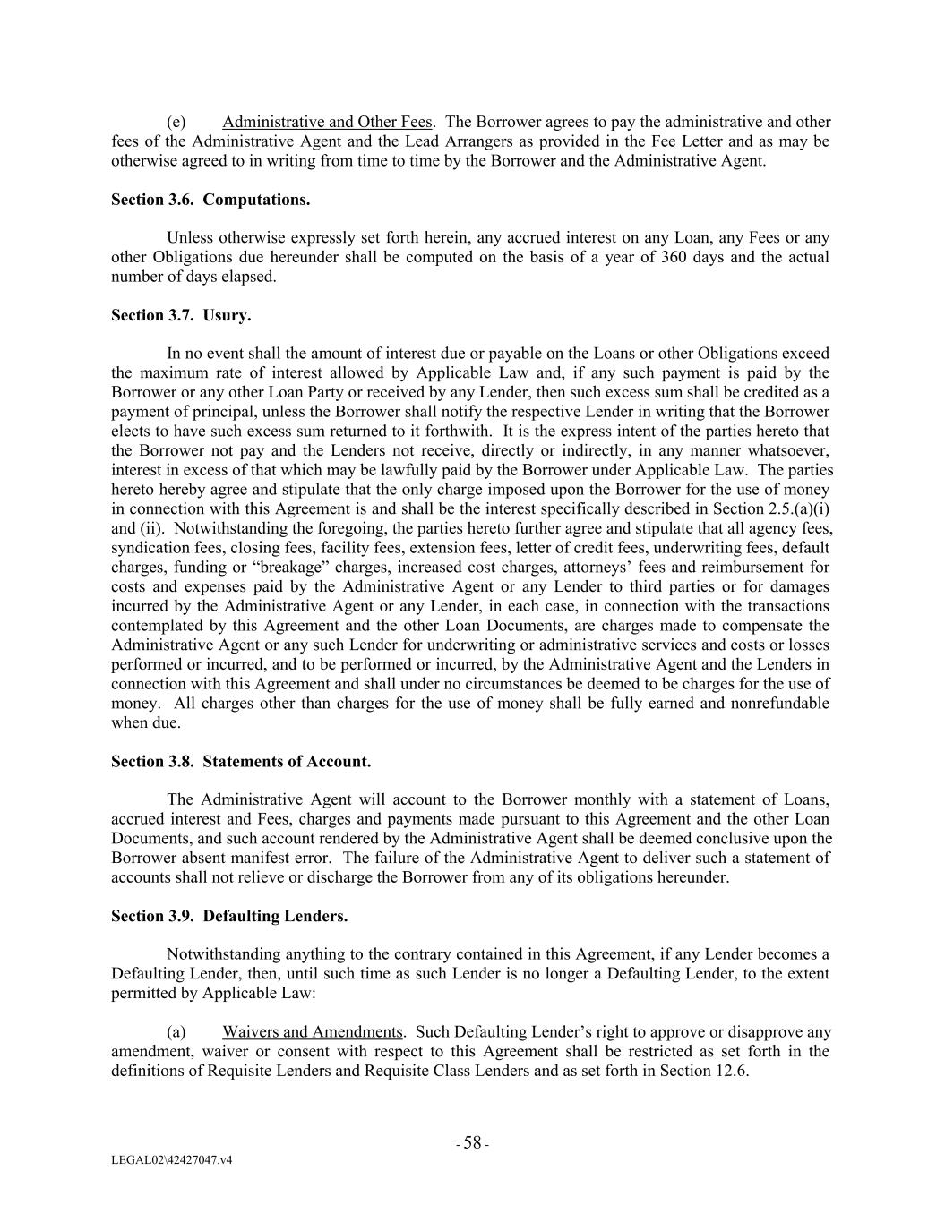 (e) Administrative and Other Fees. The Borrower agrees to pay the administrative and other fees of the Administrative Agent and the Lead Arrangers as provided in the Fee Letter and as may be otherwise agreed to in writing from time to time by the Borrower and the Administrative Agent. Section 3.6. Computations. Unless otherwise expressly set forth herein, any accrued interest on any Loan, any Fees or any other Obligations due hereunder shall be computed on the basis of a year of 360 days and the actual number of days elapsed. Section 3.7. Usury. In no event shall the amount of interest due or payable on the Loans or other Obligations exceed the maximum rate of interest allowed by Applicable Law and, if any such payment is paid by the Borrower or any other Loan Party or received by any Lender, then such excess sum shall be credited as a payment of principal, unless the Borrower shall notify the respective Lender in writing that the Borrower elects to have such excess sum returned to it forthwith. It is the express intent of the parties hereto that the Borrower not pay and the Lenders not receive, directly or indirectly, in any manner whatsoever, interest in excess of that which may be lawfully paid by the Borrower under Applicable Law. The parties hereto hereby agree and stipulate that the only charge imposed upon the Borrower for the use of money in connection with this Agreement is and shall be the interest specifically described in Section 2.5.(a)(i) and (ii). Notwithstanding the foregoing, the parties hereto further agree and stipulate that all agency fees, syndication fees, closing fees, facility fees, extension fees, letter of credit fees, underwriting fees, default charges, funding or “breakage” charges, increased cost charges, attorneys’ fees and reimbursement for costs and expenses paid by the Administrative Agent or any Lender to third parties or for damages incurred by the Administrative Agent or any Lender, in each case, in connection with the transactions contemplated by this Agreement and the other Loan Documents, are charges made to compensate the Administrative Agent or any such Lender for underwriting or administrative services and costs or losses performed or incurred, and to be performed or incurred, by the Administrative Agent and the Lenders in connection with this Agreement and shall under no circumstances be deemed to be charges for the use of money. All charges other than charges for the use of money shall be fully earned and nonrefundable when due. Section 3.8. Statements of Account. The Administrative Agent will account to the Borrower monthly with a statement of Loans, accrued interest and Fees, charges and payments made pursuant to this Agreement and the other Loan Documents, and such account rendered by the Administrative Agent shall be deemed conclusive upon the Borrower absent manifest error. The failure of the Administrative Agent to deliver such a statement of accounts shall not relieve or discharge the Borrower from any of its obligations hereunder. Section 3.9. Defaulting Lenders. Notwithstanding anything to the contrary contained in this Agreement, if any Lender becomes a Defaulting Lender, then, until such time as such Lender is no longer a Defaulting Lender, to the extent permitted by Applicable Law: (a) Waivers and Amendments. Such Defaulting Lender’s right to approve or disapprove any amendment, waiver or consent with respect to this Agreement shall be restricted as set forth in the definitions of Requisite Lenders and Requisite Class Lenders and as set forth in Section 12.6. - 58 - LEGAL02\42427047.v4