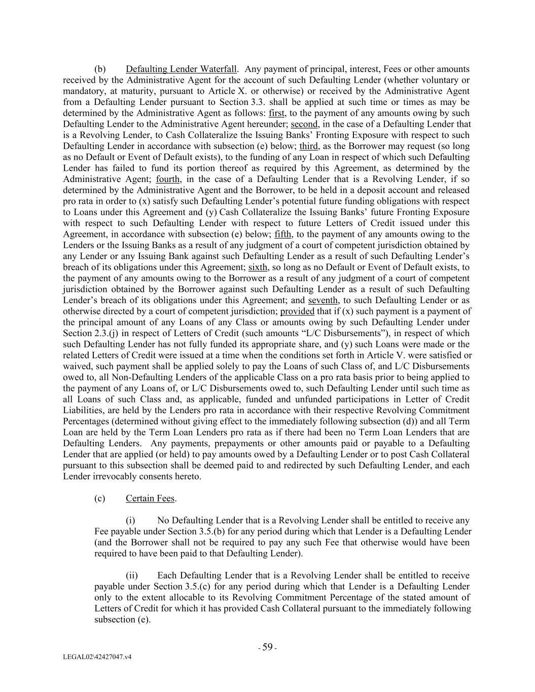 (b) Defaulting Lender Waterfall. Any payment of principal, interest, Fees or other amounts received by the Administrative Agent for the account of such Defaulting Lender (whether voluntary or mandatory, at maturity, pursuant to Article X. or otherwise) or received by the Administrative Agent from a Defaulting Lender pursuant to Section 3.3. shall be applied at such time or times as may be determined by the Administrative Agent as follows: first, to the payment of any amounts owing by such Defaulting Lender to the Administrative Agent hereunder; second, in the case of a Defaulting Lender that is a Revolving Lender, to Cash Collateralize the Issuing Banks’ Fronting Exposure with respect to such Defaulting Lender in accordance with subsection (e) below; third, as the Borrower may request (so long as no Default or Event of Default exists), to the funding of any Loan in respect of which such Defaulting Lender has failed to fund its portion thereof as required by this Agreement, as determined by the Administrative Agent; fourth, in the case of a Defaulting Lender that is a Revolving Lender, if so determined by the Administrative Agent and the Borrower, to be held in a deposit account and released pro rata in order to (x) satisfy such Defaulting Lender’s potential future funding obligations with respect to Loans under this Agreement and (y) Cash Collateralize the Issuing Banks’ future Fronting Exposure with respect to such Defaulting Lender with respect to future Letters of Credit issued under this Agreement, in accordance with subsection (e) below; fifth, to the payment of any amounts owing to the Lenders or the Issuing Banks as a result of any judgment of a court of competent jurisdiction obtained by any Lender or any Issuing Bank against such Defaulting Lender as a result of such Defaulting Lender’s breach of its obligations under this Agreement; sixth, so long as no Default or Event of Default exists, to the payment of any amounts owing to the Borrower as a result of any judgment of a court of competent jurisdiction obtained by the Borrower against such Defaulting Lender as a result of such Defaulting Lender’s breach of its obligations under this Agreement; and seventh, to such Defaulting Lender or as otherwise directed by a court of competent jurisdiction; provided that if (x) such payment is a payment of the principal amount of any Loans of any Class or amounts owing by such Defaulting Lender under Section 2.3.(j) in respect of Letters of Credit (such amounts “L/C Disbursements”), in respect of which such Defaulting Lender has not fully funded its appropriate share, and (y) such Loans were made or the related Letters of Credit were issued at a time when the conditions set forth in Article V. were satisfied or waived, such payment shall be applied solely to pay the Loans of such Class of, and L/C Disbursements owed to, all Non-Defaulting Lenders of the applicable Class on a pro rata basis prior to being applied to the payment of any Loans of, or L/C Disbursements owed to, such Defaulting Lender until such time as all Loans of such Class and, as applicable, funded and unfunded participations in Letter of Credit Liabilities, are held by the Lenders pro rata in accordance with their respective Revolving Commitment Percentages (determined without giving effect to the immediately following subsection (d)) and all Term Loan are held by the Term Loan Lenders pro rata as if there had been no Term Loan Lenders that are Defaulting Lenders. Any payments, prepayments or other amounts paid or payable to a Defaulting Lender that are applied (or held) to pay amounts owed by a Defaulting Lender or to post Cash Collateral pursuant to this subsection shall be deemed paid to and redirected by such Defaulting Lender, and each Lender irrevocably consents hereto. (c) Certain Fees. (i) No Defaulting Lender that is a Revolving Lender shall be entitled to receive any Fee payable under Section 3.5.(b) for any period during which that Lender is a Defaulting Lender (and the Borrower shall not be required to pay any such Fee that otherwise would have been required to have been paid to that Defaulting Lender). (ii) Each Defaulting Lender that is a Revolving Lender shall be entitled to receive payable under Section 3.5.(c) for any period during which that Lender is a Defaulting Lender only to the extent allocable to its Revolving Commitment Percentage of the stated amount of Letters of Credit for which it has provided Cash Collateral pursuant to the immediately following subsection (e). - 59 - LEGAL02\42427047.v4