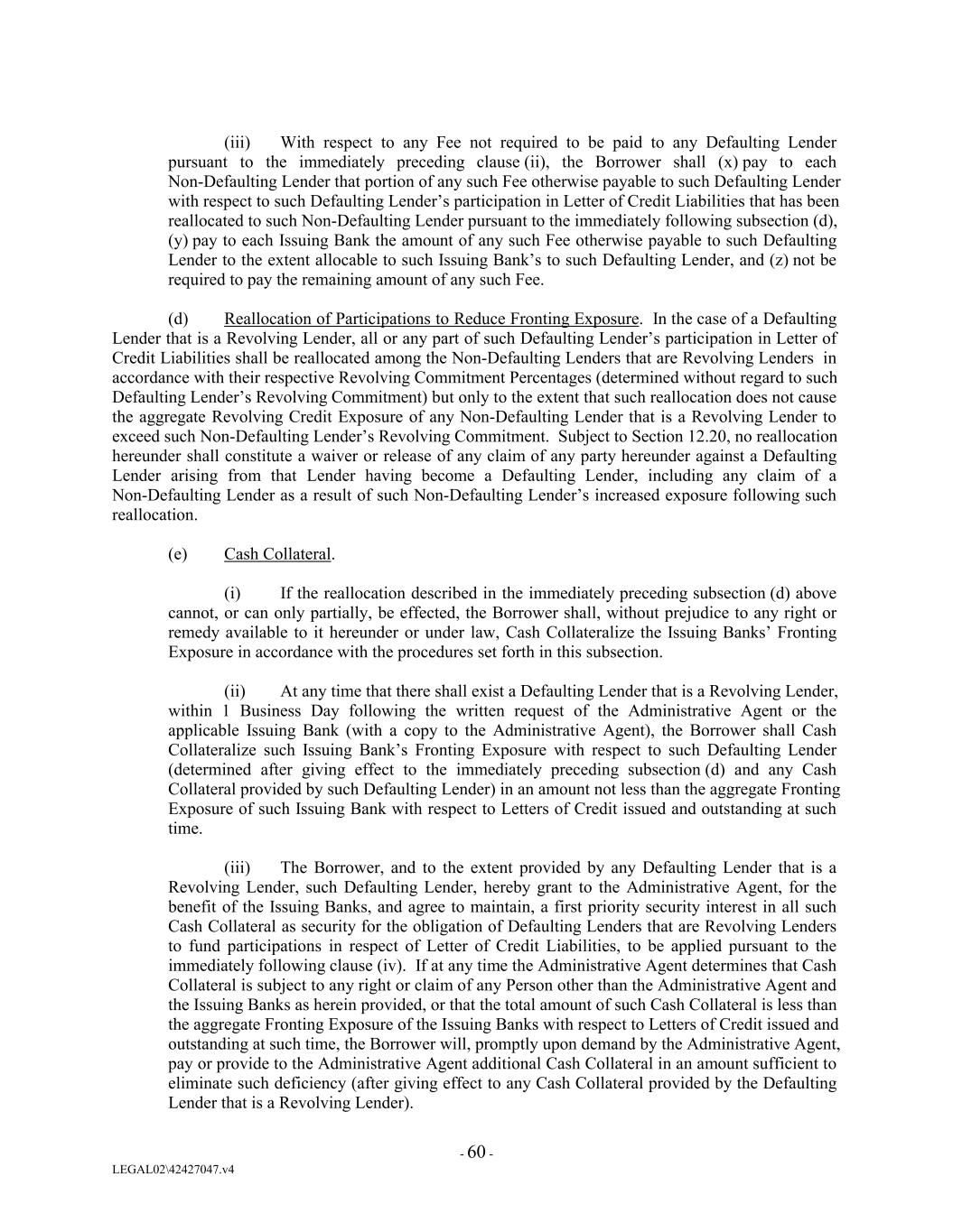 (iii) With respect to any Fee not required to be paid to any Defaulting Lender pursuant to the immediately preceding clause (ii), the Borrower shall (x) pay to each Non-Defaulting Lender that portion of any such Fee otherwise payable to such Defaulting Lender with respect to such Defaulting Lender’s participation in Letter of Credit Liabilities that has been reallocated to such Non-Defaulting Lender pursuant to the immediately following subsection (d), (y) pay to each Issuing Bank the amount of any such Fee otherwise payable to such Defaulting Lender to the extent allocable to such Issuing Bank’s to such Defaulting Lender, and (z) not be required to pay the remaining amount of any such Fee. (d) Reallocation of Participations to Reduce Fronting Exposure. In the case of a Defaulting Lender that is a Revolving Lender, all or any part of such Defaulting Lender’s participation in Letter of Credit Liabilities shall be reallocated among the Non-Defaulting Lenders that are Revolving Lenders in accordance with their respective Revolving Commitment Percentages (determined without regard to such Defaulting Lender’s Revolving Commitment) but only to the extent that such reallocation does not cause the aggregate Revolving Credit Exposure of any Non-Defaulting Lender that is a Revolving Lender to exceed such Non-Defaulting Lender’s Revolving Commitment. Subject to Section 12.20, no reallocation hereunder shall constitute a waiver or release of any claim of any party hereunder against a Defaulting Lender arising from that Lender having become a Defaulting Lender, including any claim of a Non-Defaulting Lender as a result of such Non-Defaulting Lender’s increased exposure following such reallocation. (e) Cash Collateral. (i) If the reallocation described in the immediately preceding subsection (d) above cannot, or can only partially, be effected, the Borrower shall, without prejudice to any right or remedy available to it hereunder or under law, Cash Collateralize the Issuing Banks’ Fronting Exposure in accordance with the procedures set forth in this subsection. (ii) At any time that there shall exist a Defaulting Lender that is a Revolving Lender, within 1 Business Day following the written request of the Administrative Agent or the applicable Issuing Bank (with a copy to the Administrative Agent), the Borrower shall Cash Collateralize such Issuing Bank’s Fronting Exposure with respect to such Defaulting Lender (determined after giving effect to the immediately preceding subsection (d) and any Cash Collateral provided by such Defaulting Lender) in an amount not less than the aggregate Fronting Exposure of such Issuing Bank with respect to Letters of Credit issued and outstanding at such time. (iii) The Borrower, and to the extent provided by any Defaulting Lender that is a Revolving Lender, such Defaulting Lender, hereby grant to the Administrative Agent, for the benefit of the Issuing Banks, and agree to maintain, a first priority security interest in all such Cash Collateral as security for the obligation of Defaulting Lenders that are Revolving Lenders to fund participations in respect of Letter of Credit Liabilities, to be applied pursuant to the immediately following clause (iv). If at any time the Administrative Agent determines that Cash Collateral is subject to any right or claim of any Person other than the Administrative Agent and the Issuing Banks as herein provided, or that the total amount of such Cash Collateral is less than the aggregate Fronting Exposure of the Issuing Banks with respect to Letters of Credit issued and outstanding at such time, the Borrower will, promptly upon demand by the Administrative Agent, pay or provide to the Administrative Agent additional Cash Collateral in an amount sufficient to eliminate such deficiency (after giving effect to any Cash Collateral provided by the Defaulting Lender that is a Revolving Lender). - 60 - LEGAL02\42427047.v4