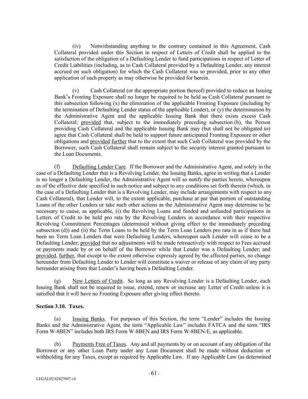 (iv) Notwithstanding anything to the contrary contained in this Agreement, Cash Collateral provided under this Section in respect of Letters of Credit shall be applied to the satisfaction of the obligation of a Defaulting Lender to fund participations in respect of Letter of Credit Liabilities (including, as to Cash Collateral provided by a Defaulting Lender, any interest accrued on such obligation) for which the Cash Collateral was so provided, prior to any other application of such property as may otherwise be provided for herein. (v) Cash Collateral (or the appropriate portion thereof) provided to reduce an Issuing Bank’s Fronting Exposure shall no longer be required to be held as Cash Collateral pursuant to this subsection following (x) the elimination of the applicable Fronting Exposure (including by the termination of Defaulting Lender status of the applicable Lender), or (y) the determination by the Administrative Agent and the applicable Issuing Bank that there exists excess Cash Collateral; provided that, subject to the immediately preceding subsection (b), the Person providing Cash Collateral and the applicable Issuing Bank may (but shall not be obligated to) agree that Cash Collateral shall be held to support future anticipated Fronting Exposure or other obligations and provided further that to the extent that such Cash Collateral was provided by the Borrower, such Cash Collateral shall remain subject to the security interest granted pursuant to the Loan Documents. (f) Defaulting Lender Cure. If the Borrower and the Administrative Agent, and solely in the case of a Defaulting Lender that is a Revolving Lender, the Issuing Banks, agree in writing that a Lender is no longer a Defaulting Lender, the Administrative Agent will so notify the parties hereto, whereupon as of the effective date specified in such notice and subject to any conditions set forth therein (which, in the case of a Defaulting Lender that is a Revolving Lender, may include arrangements with respect to any Cash Collateral), that Lender will, to the extent applicable, purchase at par that portion of outstanding Loans of the other Lenders or take such other actions as the Administrative Agent may determine to be necessary to cause, as applicable, (i) the Revolving Loans and funded and unfunded participations in Letters of Credit to be held pro rata by the Revolving Lenders in accordance with their respective Revolving Commitment Percentages (determined without giving effect to the immediately preceding subsection (d)) and (ii) the Term Loans to be held by the Term Loan Lenders pro rata in as if there had been no Term Loan Lenders that were Defaulting Lenders, whereupon such Lender will cease to be a Defaulting Lender; provided that no adjustments will be made retroactively with respect to Fees accrued or payments made by or on behalf of the Borrower while that Lender was a Defaulting Lender; and provided, further, that except to the extent otherwise expressly agreed by the affected parties, no change hereunder from Defaulting Lender to Lender will constitute a waiver or release of any claim of any party hereunder arising from that Lender’s having been a Defaulting Lender. (g) New Letters of Credit. So long as any Revolving Lender is a Defaulting Lender, each Issuing Bank shall not be required to issue, extend, renew or increase any Letter of Credit unless it is satisfied that it will have no Fronting Exposure after giving effect thereto. Section 3.10. Taxes. (a) Issuing Banks. For purposes of this Section, the term “Lender” includes the Issuing Banks and the Administrative Agent, the term “Applicable Law” includes FATCA and the term “IRS Form W-8BEN” includes both IRS Form W-8BEN and IRS Form W-8BEN-E, as applicable. (b) Payments Free of Taxes. Any and all payments by or on account of any obligation of the Borrower or any other Loan Party under any Loan Document shall be made without deduction or withholding for any Taxes, except as required by Applicable Law. If any Applicable Law (as determined - 61 - LEGAL02\42427047.v4