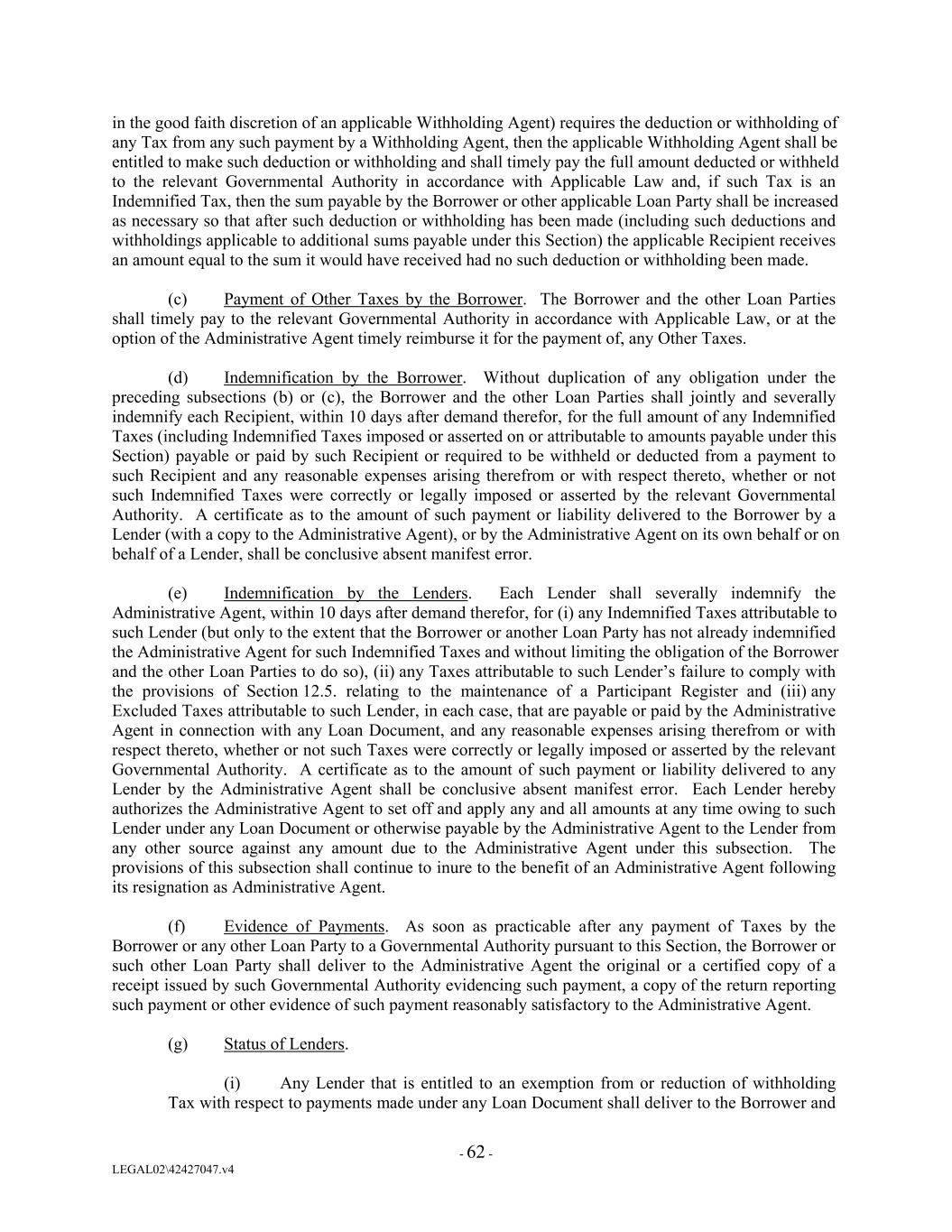 in the good faith discretion of an applicable Withholding Agent) requires the deduction or withholding of any Tax from any such payment by a Withholding Agent, then the applicable Withholding Agent shall be entitled to make such deduction or withholding and shall timely pay the full amount deducted or withheld to the relevant Governmental Authority in accordance with Applicable Law and, if such Tax is an Indemnified Tax, then the sum payable by the Borrower or other applicable Loan Party shall be increased as necessary so that after such deduction or withholding has been made (including such deductions and withholdings applicable to additional sums payable under this Section) the applicable Recipient receives an amount equal to the sum it would have received had no such deduction or withholding been made. (c) Payment of Other Taxes by the Borrower. The Borrower and the other Loan Parties shall timely pay to the relevant Governmental Authority in accordance with Applicable Law, or at the option of the Administrative Agent timely reimburse it for the payment of, any Other Taxes. (d) Indemnification by the Borrower. Without duplication of any obligation under the preceding subsections (b) or (c), the Borrower and the other Loan Parties shall jointly and severally indemnify each Recipient, within 10 days after demand therefor, for the full amount of any Indemnified Taxes (including Indemnified Taxes imposed or asserted on or attributable to amounts payable under this Section) payable or paid by such Recipient or required to be withheld or deducted from a payment to such Recipient and any reasonable expenses arising therefrom or with respect thereto, whether or not such Indemnified Taxes were correctly or legally imposed or asserted by the relevant Governmental Authority. A certificate as to the amount of such payment or liability delivered to the Borrower by a Lender (with a copy to the Administrative Agent), or by the Administrative Agent on its own behalf or on behalf of a Lender, shall be conclusive absent manifest error. (e) Indemnification by the Lenders. Each Lender shall severally indemnify the Administrative Agent, within 10 days after demand therefor, for (i) any Indemnified Taxes attributable to such Lender (but only to the extent that the Borrower or another Loan Party has not already indemnified the Administrative Agent for such Indemnified Taxes and without limiting the obligation of the Borrower and the other Loan Parties to do so), (ii) any Taxes attributable to such Lender’s failure to comply with the provisions of Section 12.5. relating to the maintenance of a Participant Register and (iii) any Excluded Taxes attributable to such Lender, in each case, that are payable or paid by the Administrative Agent in connection with any Loan Document, and any reasonable expenses arising therefrom or with respect thereto, whether or not such Taxes were correctly or legally imposed or asserted by the relevant Governmental Authority. A certificate as to the amount of such payment or liability delivered to any Lender by the Administrative Agent shall be conclusive absent manifest error. Each Lender hereby authorizes the Administrative Agent to set off and apply any and all amounts at any time owing to such Lender under any Loan Document or otherwise payable by the Administrative Agent to the Lender from any other source against any amount due to the Administrative Agent under this subsection. The provisions of this subsection shall continue to inure to the benefit of an Administrative Agent following its resignation as Administrative Agent. (f) Evidence of Payments. As soon as practicable after any payment of Taxes by the Borrower or any other Loan Party to a Governmental Authority pursuant to this Section, the Borrower or such other Loan Party shall deliver to the Administrative Agent the original or a certified copy of a receipt issued by such Governmental Authority evidencing such payment, a copy of the return reporting such payment or other evidence of such payment reasonably satisfactory to the Administrative Agent. (g) Status of Lenders. (i) Any Lender that is entitled to an exemption from or reduction of withholding Tax with respect to payments made under any Loan Document shall deliver to the Borrower and - 62 - LEGAL02\42427047.v4