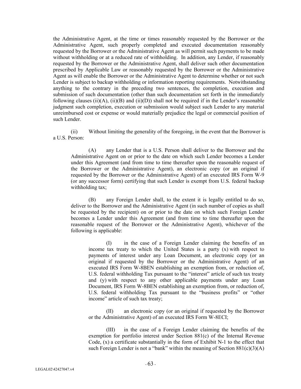 the Administrative Agent, at the time or times reasonably requested by the Borrower or the Administrative Agent, such properly completed and executed documentation reasonably requested by the Borrower or the Administrative Agent as will permit such payments to be made without withholding or at a reduced rate of withholding. In addition, any Lender, if reasonably requested by the Borrower or the Administrative Agent, shall deliver such other documentation prescribed by Applicable Law or reasonably requested by the Borrower or the Administrative Agent as will enable the Borrower or the Administrative Agent to determine whether or not such Lender is subject to backup withholding or information reporting requirements. Notwithstanding anything to the contrary in the preceding two sentences, the completion, execution and submission of such documentation (other than such documentation set forth in the immediately following clauses (ii)(A), (ii)(B) and (ii)(D)) shall not be required if in the Lender’s reasonable judgment such completion, execution or submission would subject such Lender to any material unreimbursed cost or expense or would materially prejudice the legal or commercial position of such Lender. (ii) Without limiting the generality of the foregoing, in the event that the Borrower is a U.S. Person: (A) any Lender that is a U.S. Person shall deliver to the Borrower and the Administrative Agent on or prior to the date on which such Lender becomes a Lender under this Agreement (and from time to time thereafter upon the reasonable request of the Borrower or the Administrative Agent), an electronic copy (or an original if requested by the Borrower or the Administrative Agent) of an executed IRS Form W-9 (or any successor form) certifying that such Lender is exempt from U.S. federal backup withholding tax; (B) any Foreign Lender shall, to the extent it is legally entitled to do so, deliver to the Borrower and the Administrative Agent (in such number of copies as shall be requested by the recipient) on or prior to the date on which such Foreign Lender becomes a Lender under this Agreement (and from time to time thereafter upon the reasonable request of the Borrower or the Administrative Agent), whichever of the following is applicable: (I) in the case of a Foreign Lender claiming the benefits of an income tax treaty to which the United States is a party (x) with respect to payments of interest under any Loan Document, an electronic copy (or an original if requested by the Borrower or the Administrative Agent) of an executed IRS Form W-8BEN establishing an exemption from, or reduction of, U.S. federal withholding Tax pursuant to the “interest” article of such tax treaty and (y) with respect to any other applicable payments under any Loan Document, IRS Form W-8BEN establishing an exemption from, or reduction of, U.S. federal withholding Tax pursuant to the “business profits” or “other income” article of such tax treaty; (II) an electronic copy (or an original if requested by the Borrower or the Administrative Agent) of an executed IRS Form W-8ECI; (III) in the case of a Foreign Lender claiming the benefits of the exemption for portfolio interest under Section 881(c) of the Internal Revenue Code, (x) a certificate substantially in the form of Exhibit N-1 to the effect that such Foreign Lender is not a “bank” within the meaning of Section 881(c)(3)(A) - 63 - LEGAL02\42427047.v4