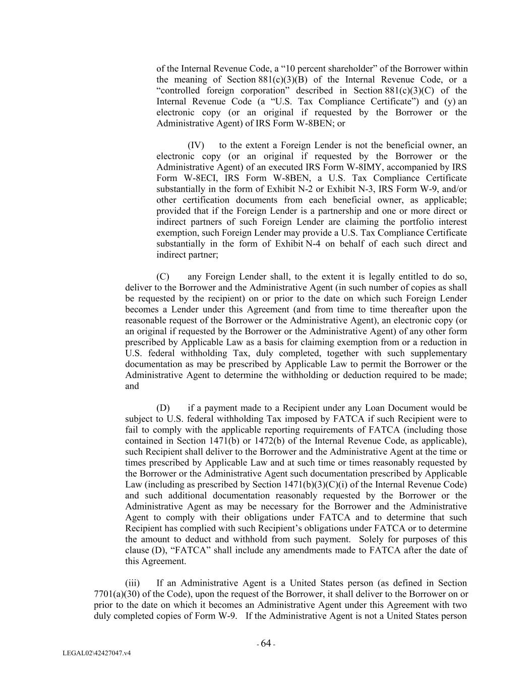 of the Internal Revenue Code, a “10 percent shareholder” of the Borrower within the meaning of Section 881(c)(3)(B) of the Internal Revenue Code, or a “controlled foreign corporation” described in Section 881(c)(3)(C) of the Internal Revenue Code (a “U.S. Tax Compliance Certificate”) and (y) an electronic copy (or an original if requested by the Borrower or the Administrative Agent) of IRS Form W-8BEN; or (IV) to the extent a Foreign Lender is not the beneficial owner, an electronic copy (or an original if requested by the Borrower or the Administrative Agent) of an executed IRS Form W-8IMY, accompanied by IRS Form W-8ECI, IRS Form W-8BEN, a U.S. Tax Compliance Certificate substantially in the form of Exhibit N-2 or Exhibit N-3, IRS Form W-9, and/or other certification documents from each beneficial owner, as applicable; provided that if the Foreign Lender is a partnership and one or more direct or indirect partners of such Foreign Lender are claiming the portfolio interest exemption, such Foreign Lender may provide a U.S. Tax Compliance Certificate substantially in the form of Exhibit N-4 on behalf of each such direct and indirect partner; (C) any Foreign Lender shall, to the extent it is legally entitled to do so, deliver to the Borrower and the Administrative Agent (in such number of copies as shall be requested by the recipient) on or prior to the date on which such Foreign Lender becomes a Lender under this Agreement (and from time to time thereafter upon the reasonable request of the Borrower or the Administrative Agent), an electronic copy (or an original if requested by the Borrower or the Administrative Agent) of any other form prescribed by Applicable Law as a basis for claiming exemption from or a reduction in U.S. federal withholding Tax, duly completed, together with such supplementary documentation as may be prescribed by Applicable Law to permit the Borrower or the Administrative Agent to determine the withholding or deduction required to be made; and (D) if a payment made to a Recipient under any Loan Document would be subject to U.S. federal withholding Tax imposed by FATCA if such Recipient were to fail to comply with the applicable reporting requirements of FATCA (including those contained in Section 1471(b) or 1472(b) of the Internal Revenue Code, as applicable), such Recipient shall deliver to the Borrower and the Administrative Agent at the time or times prescribed by Applicable Law and at such time or times reasonably requested by the Borrower or the Administrative Agent such documentation prescribed by Applicable Law (including as prescribed by Section 1471(b)(3)(C)(i) of the Internal Revenue Code) and such additional documentation reasonably requested by the Borrower or the Administrative Agent as may be necessary for the Borrower and the Administrative Agent to comply with their obligations under FATCA and to determine that such Recipient has complied with such Recipient’s obligations under FATCA or to determine the amount to deduct and withhold from such payment. Solely for purposes of this clause (D), “FATCA” shall include any amendments made to FATCA after the date of this Agreement. (iii) If an Administrative Agent is a United States person (as defined in Section 7701(a)(30) of the Code), upon the request of the Borrower, it shall deliver to the Borrower on or prior to the date on which it becomes an Administrative Agent under this Agreement with two duly completed copies of Form W-9. If the Administrative Agent is not a United States person - 64 - LEGAL02\42427047.v4