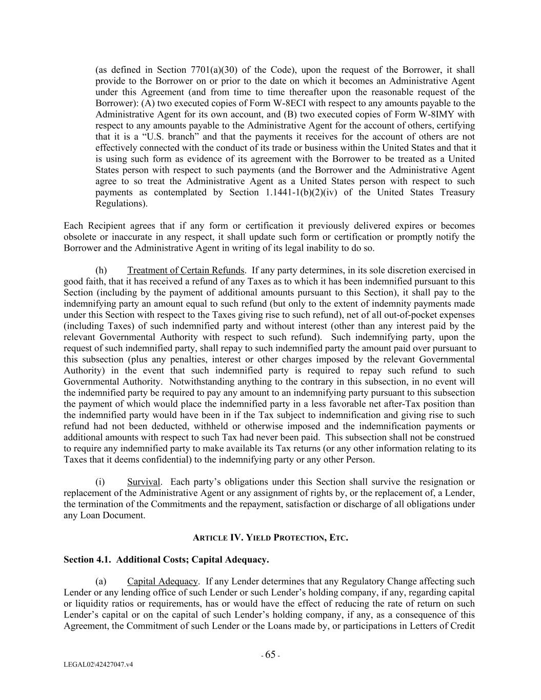 (as defined in Section 7701(a)(30) of the Code), upon the request of the Borrower, it shall provide to the Borrower on or prior to the date on which it becomes an Administrative Agent under this Agreement (and from time to time thereafter upon the reasonable request of the Borrower): (A) two executed copies of Form W-8ECI with respect to any amounts payable to the Administrative Agent for its own account, and (B) two executed copies of Form W-8IMY with respect to any amounts payable to the Administrative Agent for the account of others, certifying that it is a “U.S. branch” and that the payments it receives for the account of others are not effectively connected with the conduct of its trade or business within the United States and that it is using such form as evidence of its agreement with the Borrower to be treated as a United States person with respect to such payments (and the Borrower and the Administrative Agent agree to so treat the Administrative Agent as a United States person with respect to such payments as contemplated by Section 1.1441-1(b)(2)(iv) of the United States Treasury Regulations). Each Recipient agrees that if any form or certification it previously delivered expires or becomes obsolete or inaccurate in any respect, it shall update such form or certification or promptly notify the Borrower and the Administrative Agent in writing of its legal inability to do so. (h) Treatment of Certain Refunds. If any party determines, in its sole discretion exercised in good faith, that it has received a refund of any Taxes as to which it has been indemnified pursuant to this Section (including by the payment of additional amounts pursuant to this Section), it shall pay to the indemnifying party an amount equal to such refund (but only to the extent of indemnity payments made under this Section with respect to the Taxes giving rise to such refund), net of all out-of-pocket expenses (including Taxes) of such indemnified party and without interest (other than any interest paid by the relevant Governmental Authority with respect to such refund). Such indemnifying party, upon the request of such indemnified party, shall repay to such indemnified party the amount paid over pursuant to this subsection (plus any penalties, interest or other charges imposed by the relevant Governmental Authority) in the event that such indemnified party is required to repay such refund to such Governmental Authority. Notwithstanding anything to the contrary in this subsection, in no event will the indemnified party be required to pay any amount to an indemnifying party pursuant to this subsection the payment of which would place the indemnified party in a less favorable net after-Tax position than the indemnified party would have been in if the Tax subject to indemnification and giving rise to such refund had not been deducted, withheld or otherwise imposed and the indemnification payments or additional amounts with respect to such Tax had never been paid. This subsection shall not be construed to require any indemnified party to make available its Tax returns (or any other information relating to its Taxes that it deems confidential) to the indemnifying party or any other Person. (i) Survival. Each party’s obligations under this Section shall survive the resignation or replacement of the Administrative Agent or any assignment of rights by, or the replacement of, a Lender, the termination of the Commitments and the repayment, satisfaction or discharge of all obligations under any Loan Document. ARTICLE IV. YIELD PROTECTION, ETC. Section 4.1. Additional Costs; Capital Adequacy. (a) Capital Adequacy. If any Lender determines that any Regulatory Change affecting such Lender or any lending office of such Lender or such Lender’s holding company, if any, regarding capital or liquidity ratios or requirements, has or would have the effect of reducing the rate of return on such Lender’s capital or on the capital of such Lender’s holding company, if any, as a consequence of this Agreement, the Commitment of such Lender or the Loans made by, or participations in Letters of Credit - 65 - LEGAL02\42427047.v4