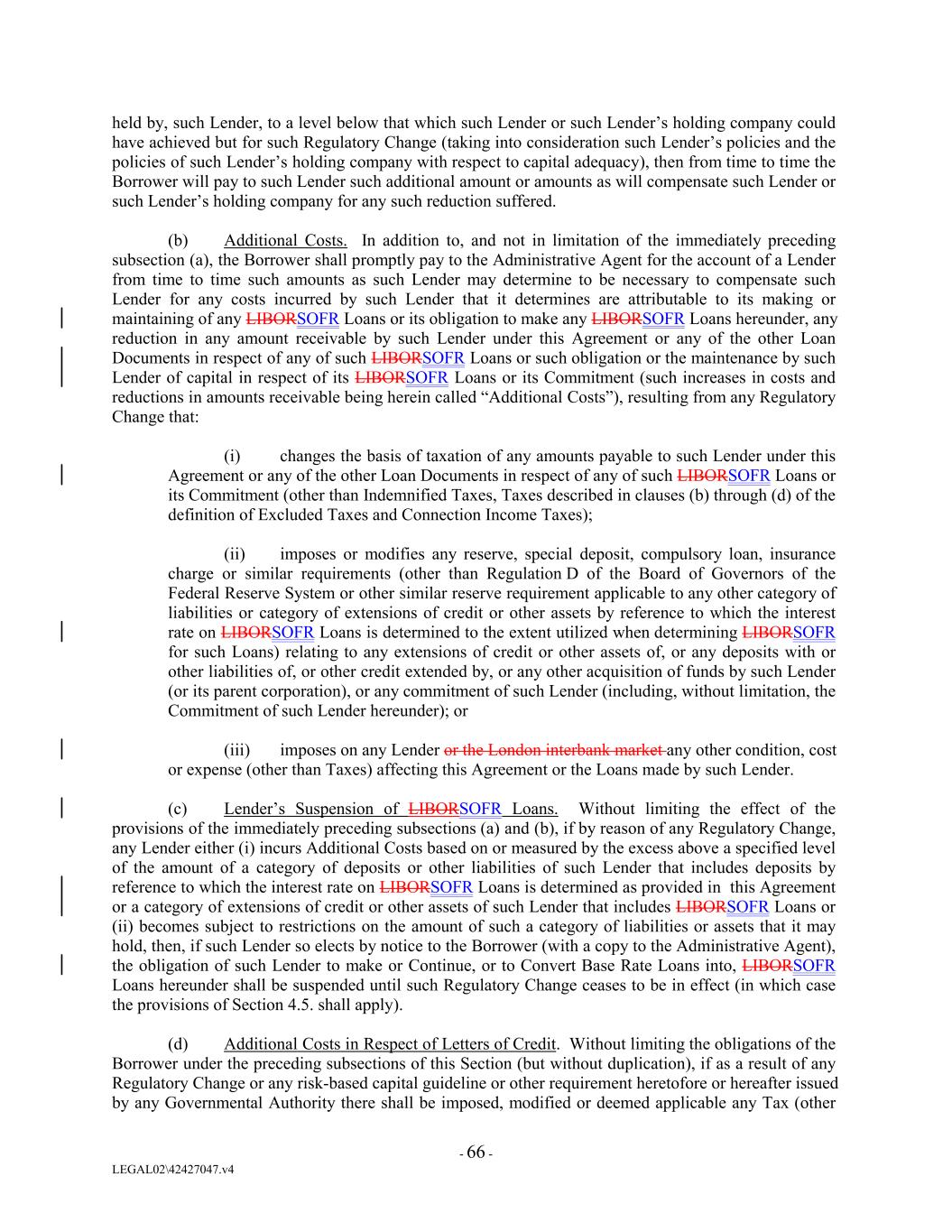 held by, such Lender, to a level below that which such Lender or such Lender’s holding company could have achieved but for such Regulatory Change (taking into consideration such Lender’s policies and the policies of such Lender’s holding company with respect to capital adequacy), then from time to time the Borrower will pay to such Lender such additional amount or amounts as will compensate such Lender or such Lender’s holding company for any such reduction suffered. (b) Additional Costs. In addition to, and not in limitation of the immediately preceding subsection (a), the Borrower shall promptly pay to the Administrative Agent for the account of a Lender from time to time such amounts as such Lender may determine to be necessary to compensate such Lender for any costs incurred by such Lender that it determines are attributable to its making or maintaining of any LIBORSOFR Loans or its obligation to make any LIBORSOFR Loans hereunder, any reduction in any amount receivable by such Lender under this Agreement or any of the other Loan Documents in respect of any of such LIBORSOFR Loans or such obligation or the maintenance by such Lender of capital in respect of its LIBORSOFR Loans or its Commitment (such increases in costs and reductions in amounts receivable being herein called “Additional Costs”), resulting from any Regulatory Change that: (i) changes the basis of taxation of any amounts payable to such Lender under this Agreement or any of the other Loan Documents in respect of any of such LIBORSOFR Loans or its Commitment (other than Indemnified Taxes, Taxes described in clauses (b) through (d) of the definition of Excluded Taxes and Connection Income Taxes); (ii) imposes or modifies any reserve, special deposit, compulsory loan, insurance charge or similar requirements (other than Regulation D of the Board of Governors of the Federal Reserve System or other similar reserve requirement applicable to any other category of liabilities or category of extensions of credit or other assets by reference to which the interest rate on LIBORSOFR Loans is determined to the extent utilized when determining LIBORSOFR for such Loans) relating to any extensions of credit or other assets of, or any deposits with or other liabilities of, or other credit extended by, or any other acquisition of funds by such Lender (or its parent corporation), or any commitment of such Lender (including, without limitation, the Commitment of such Lender hereunder); or (iii) imposes on any Lender or the London interbank market any other condition, cost or expense (other than Taxes) affecting this Agreement or the Loans made by such Lender. (c) Lender’s Suspension of LIBORSOFR Loans. Without limiting the effect of the provisions of the immediately preceding subsections (a) and (b), if by reason of any Regulatory Change, any Lender either (i) incurs Additional Costs based on or measured by the excess above a specified level of the amount of a category of deposits or other liabilities of such Lender that includes deposits by reference to which the interest rate on LIBORSOFR Loans is determined as provided in this Agreement or a category of extensions of credit or other assets of such Lender that includes LIBORSOFR Loans or (ii) becomes subject to restrictions on the amount of such a category of liabilities or assets that it may hold, then, if such Lender so elects by notice to the Borrower (with a copy to the Administrative Agent), the obligation of such Lender to make or Continue, or to Convert Base Rate Loans into, LIBORSOFR Loans hereunder shall be suspended until such Regulatory Change ceases to be in effect (in which case the provisions of Section 4.5. shall apply). (d) Additional Costs in Respect of Letters of Credit. Without limiting the obligations of the Borrower under the preceding subsections of this Section (but without duplication), if as a result of any Regulatory Change or any risk-based capital guideline or other requirement heretofore or hereafter issued by any Governmental Authority there shall be imposed, modified or deemed applicable any Tax (other - 66 - LEGAL02\42427047.v4