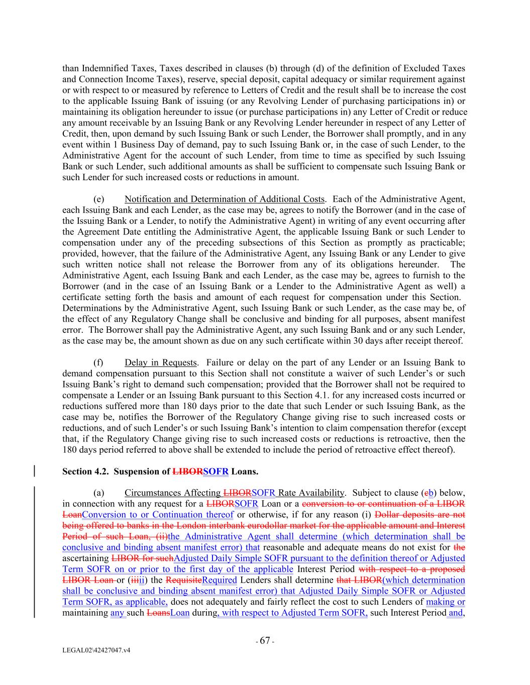 than Indemnified Taxes, Taxes described in clauses (b) through (d) of the definition of Excluded Taxes and Connection Income Taxes), reserve, special deposit, capital adequacy or similar requirement against or with respect to or measured by reference to Letters of Credit and the result shall be to increase the cost to the applicable Issuing Bank of issuing (or any Revolving Lender of purchasing participations in) or maintaining its obligation hereunder to issue (or purchase participations in) any Letter of Credit or reduce any amount receivable by an Issuing Bank or any Revolving Lender hereunder in respect of any Letter of Credit, then, upon demand by such Issuing Bank or such Lender, the Borrower shall promptly, and in any event within 1 Business Day of demand, pay to such Issuing Bank or, in the case of such Lender, to the Administrative Agent for the account of such Lender, from time to time as specified by such Issuing Bank or such Lender, such additional amounts as shall be sufficient to compensate such Issuing Bank or such Lender for such increased costs or reductions in amount. (e) Notification and Determination of Additional Costs. Each of the Administrative Agent, each Issuing Bank and each Lender, as the case may be, agrees to notify the Borrower (and in the case of the Issuing Bank or a Lender, to notify the Administrative Agent) in writing of any event occurring after the Agreement Date entitling the Administrative Agent, the applicable Issuing Bank or such Lender to compensation under any of the preceding subsections of this Section as promptly as practicable; provided, however, that the failure of the Administrative Agent, any Issuing Bank or any Lender to give such written notice shall not release the Borrower from any of its obligations hereunder. The Administrative Agent, each Issuing Bank and each Lender, as the case may be, agrees to furnish to the Borrower (and in the case of an Issuing Bank or a Lender to the Administrative Agent as well) a certificate setting forth the basis and amount of each request for compensation under this Section. Determinations by the Administrative Agent, such Issuing Bank or such Lender, as the case may be, of the effect of any Regulatory Change shall be conclusive and binding for all purposes, absent manifest error. The Borrower shall pay the Administrative Agent, any such Issuing Bank and or any such Lender, as the case may be, the amount shown as due on any such certificate within 30 days after receipt thereof. (f) Delay in Requests. Failure or delay on the part of any Lender or an Issuing Bank to demand compensation pursuant to this Section shall not constitute a waiver of such Lender’s or such Issuing Bank’s right to demand such compensation; provided that the Borrower shall not be required to compensate a Lender or an Issuing Bank pursuant to this Section 4.1. for any increased costs incurred or reductions suffered more than 180 days prior to the date that such Lender or such Issuing Bank, as the case may be, notifies the Borrower of the Regulatory Change giving rise to such increased costs or reductions, and of such Lender’s or such Issuing Bank’s intention to claim compensation therefor (except that, if the Regulatory Change giving rise to such increased costs or reductions is retroactive, then the 180 days period referred to above shall be extended to include the period of retroactive effect thereof). Section 4.2. Suspension of LIBORSOFR Loans. (a) Circumstances Affecting LIBORSOFR Rate Availability. Subject to clause (cb) below, in connection with any request for a LIBORSOFR Loan or a conversion to or continuation of a LIBOR LoanConversion to or Continuation thereof or otherwise, if for any reason (i) Dollar deposits are not being offered to banks in the London interbank eurodollar market for the applicable amount and Interest Period of such Loan, (ii)the Administrative Agent shall determine (which determination shall be conclusive and binding absent manifest error) that reasonable and adequate means do not exist for the ascertaining LIBOR for suchAdjusted Daily Simple SOFR pursuant to the definition thereof or Adjusted Term SOFR on or prior to the first day of the applicable Interest Period with respect to a proposed LIBOR Loan or (iiiii) the RequisiteRequired Lenders shall determine that LIBOR(which determination shall be conclusive and binding absent manifest error) that Adjusted Daily Simple SOFR or Adjusted Term SOFR, as applicable, does not adequately and fairly reflect the cost to such Lenders of making or maintaining any such LoansLoan during, with respect to Adjusted Term SOFR, such Interest Period and, - 67 - LEGAL02\42427047.v4