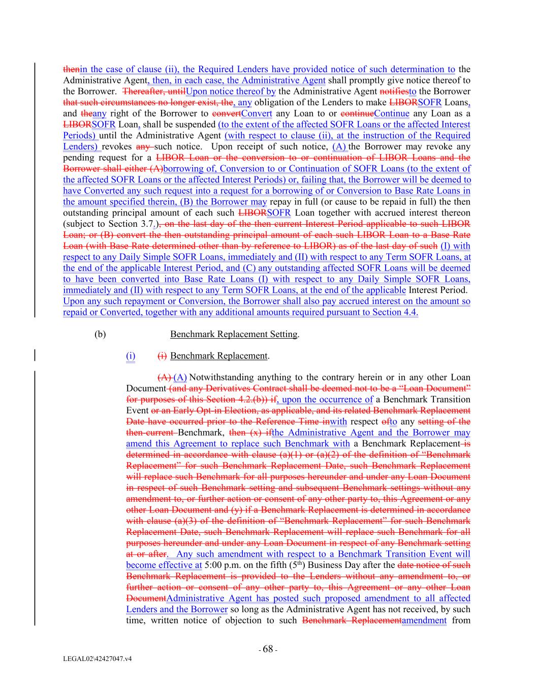 thenin the case of clause (ii), the Required Lenders have provided notice of such determination to the Administrative Agent, then, in each case, the Administrative Agent shall promptly give notice thereof to the Borrower. Thereafter, untilUpon notice thereof by the Administrative Agent notifiesto the Borrower that such circumstances no longer exist, the, any obligation of the Lenders to make LIBORSOFR Loans, and theany right of the Borrower to convertConvert any Loan to or continueContinue any Loan as a LIBORSOFR Loan, shall be suspended (to the extent of the affected SOFR Loans or the affected Interest Periods) until the Administrative Agent (with respect to clause (ii), at the instruction of the Required Lenders) revokes any such notice. Upon receipt of such notice, (A) the Borrower may revoke any pending request for a LIBOR Loan or the conversion to or continuation of LIBOR Loans and the Borrower shall either (A)borrowing of, Conversion to or Continuation of SOFR Loans (to the extent of the affected SOFR Loans or the affected Interest Periods) or, failing that, the Borrower will be deemed to have Converted any such request into a request for a borrowing of or Conversion to Base Rate Loans in the amount specified therein, (B) the Borrower may repay in full (or cause to be repaid in full) the then outstanding principal amount of each such LIBORSOFR Loan together with accrued interest thereon (subject to Section 3.7.), on the last day of the then current Interest Period applicable to such LIBOR Loan; or (B) convert the then outstanding principal amount of each such LIBOR Loan to a Base Rate Loan (with Base Rate determined other than by reference to LIBOR) as of the last day of such (I) with respect to any Daily Simple SOFR Loans, immediately and (II) with respect to any Term SOFR Loans, at the end of the applicable Interest Period, and (C) any outstanding affected SOFR Loans will be deemed to have been converted into Base Rate Loans (I) with respect to any Daily Simple SOFR Loans, immediately and (II) with respect to any Term SOFR Loans, at the end of the applicable Interest Period. Upon any such repayment or Conversion, the Borrower shall also pay accrued interest on the amount so repaid or Converted, together with any additional amounts required pursuant to Section 4.4. (b) Benchmark Replacement Setting. (i) (i) Benchmark Replacement. (A) (A) Notwithstanding anything to the contrary herein or in any other Loan Document (and any Derivatives Contract shall be deemed not to be a “Loan Document” for purposes of this Section 4.2.(b)) if, upon the occurrence of a Benchmark Transition Event or an Early Opt-in Election, as applicable, and its related Benchmark Replacement Date have occurred prior to the Reference Time inwith respect ofto any setting of the then-current Benchmark, then (x) ifthe Administrative Agent and the Borrower may amend this Agreement to replace such Benchmark with a Benchmark Replacement is determined in accordance with clause (a)(1) or (a)(2) of the definition of “Benchmark Replacement” for such Benchmark Replacement Date, such Benchmark Replacement will replace such Benchmark for all purposes hereunder and under any Loan Document in respect of such Benchmark setting and subsequent Benchmark settings without any amendment to, or further action or consent of any other party to, this Agreement or any other Loan Document and (y) if a Benchmark Replacement is determined in accordance with clause (a)(3) of the definition of “Benchmark Replacement” for such Benchmark Replacement Date, such Benchmark Replacement will replace such Benchmark for all purposes hereunder and under any Loan Document in respect of any Benchmark setting at or after. Any such amendment with respect to a Benchmark Transition Event will become effective at 5:00 p.m. on the fifth (5th) Business Day after the date notice of such Benchmark Replacement is provided to the Lenders without any amendment to, or further action or consent of any other party to, this Agreement or any other Loan DocumentAdministrative Agent has posted such proposed amendment to all affected Lenders and the Borrower so long as the Administrative Agent has not received, by such time, written notice of objection to such Benchmark Replacementamendment from - 68 - LEGAL02\42427047.v4