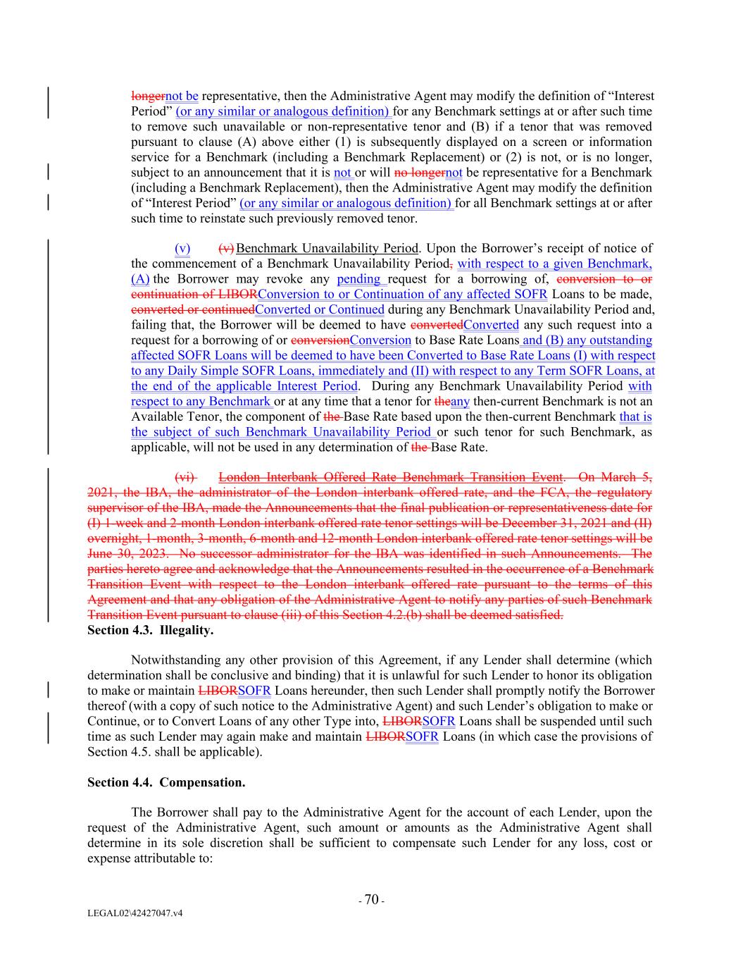 longernot be representative, then the Administrative Agent may modify the definition of “Interest Period” (or any similar or analogous definition) for any Benchmark settings at or after such time to remove such unavailable or non-representative tenor and (B) if a tenor that was removed pursuant to clause (A) above either (1) is subsequently displayed on a screen or information service for a Benchmark (including a Benchmark Replacement) or (2) is not, or is no longer, subject to an announcement that it is not or will no longernot be representative for a Benchmark (including a Benchmark Replacement), then the Administrative Agent may modify the definition of “Interest Period” (or any similar or analogous definition) for all Benchmark settings at or after such time to reinstate such previously removed tenor. (v) (v) Benchmark Unavailability Period. Upon the Borrower’s receipt of notice of the commencement of a Benchmark Unavailability Period, with respect to a given Benchmark, (A) the Borrower may revoke any pending request for a borrowing of, conversion to or continuation of LIBORConversion to or Continuation of any affected SOFR Loans to be made, converted or continuedConverted or Continued during any Benchmark Unavailability Period and, failing that, the Borrower will be deemed to have convertedConverted any such request into a request for a borrowing of or conversionConversion to Base Rate Loans and (B) any outstanding affected SOFR Loans will be deemed to have been Converted to Base Rate Loans (I) with respect to any Daily Simple SOFR Loans, immediately and (II) with respect to any Term SOFR Loans, at the end of the applicable Interest Period. During any Benchmark Unavailability Period with respect to any Benchmark or at any time that a tenor for theany then-current Benchmark is not an Available Tenor, the component of the Base Rate based upon the then-current Benchmark that is the subject of such Benchmark Unavailability Period or such tenor for such Benchmark, as applicable, will not be used in any determination of the Base Rate. (vi) London Interbank Offered Rate Benchmark Transition Event. On March 5, 2021, the IBA, the administrator of the London interbank offered rate, and the FCA, the regulatory supervisor of the IBA, made the Announcements that the final publication or representativeness date for (I) 1-week and 2-month London interbank offered rate tenor settings will be December 31, 2021 and (II) overnight, 1-month, 3-month, 6-month and 12-month London interbank offered rate tenor settings will be June 30, 2023. No successor administrator for the IBA was identified in such Announcements. The parties hereto agree and acknowledge that the Announcements resulted in the occurrence of a Benchmark Transition Event with respect to the London interbank offered rate pursuant to the terms of this Agreement and that any obligation of the Administrative Agent to notify any parties of such Benchmark Transition Event pursuant to clause (iii) of this Section 4.2.(b) shall be deemed satisfied. Section 4.3. Illegality. Notwithstanding any other provision of this Agreement, if any Lender shall determine (which determination shall be conclusive and binding) that it is unlawful for such Lender to honor its obligation to make or maintain LIBORSOFR Loans hereunder, then such Lender shall promptly notify the Borrower thereof (with a copy of such notice to the Administrative Agent) and such Lender’s obligation to make or Continue, or to Convert Loans of any other Type into, LIBORSOFR Loans shall be suspended until such time as such Lender may again make and maintain LIBORSOFR Loans (in which case the provisions of Section 4.5. shall be applicable). Section 4.4. Compensation. The Borrower shall pay to the Administrative Agent for the account of each Lender, upon the request of the Administrative Agent, such amount or amounts as the Administrative Agent shall determine in its sole discretion shall be sufficient to compensate such Lender for any loss, cost or expense attributable to: - 70 - LEGAL02\42427047.v4