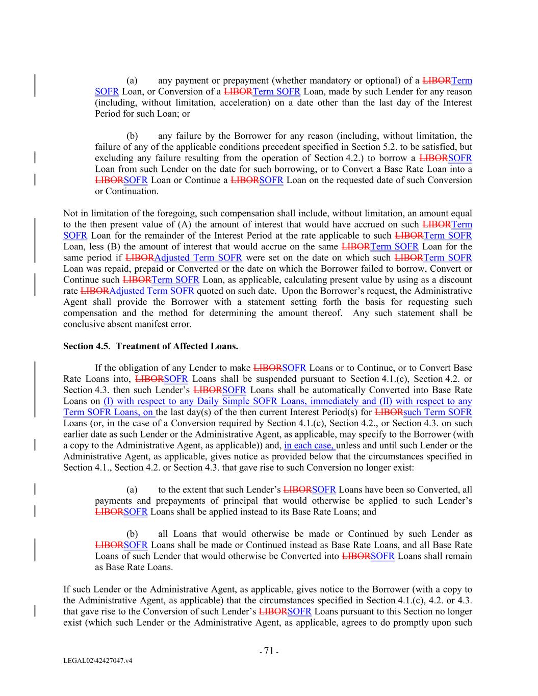 (a) any payment or prepayment (whether mandatory or optional) of a LIBORTerm SOFR Loan, or Conversion of a LIBORTerm SOFR Loan, made by such Lender for any reason (including, without limitation, acceleration) on a date other than the last day of the Interest Period for such Loan; or (b) any failure by the Borrower for any reason (including, without limitation, the failure of any of the applicable conditions precedent specified in Section 5.2. to be satisfied, but excluding any failure resulting from the operation of Section 4.2.) to borrow a LIBORSOFR Loan from such Lender on the date for such borrowing, or to Convert a Base Rate Loan into a LIBORSOFR Loan or Continue a LIBORSOFR Loan on the requested date of such Conversion or Continuation. Not in limitation of the foregoing, such compensation shall include, without limitation, an amount equal to the then present value of (A) the amount of interest that would have accrued on such LIBORTerm SOFR Loan for the remainder of the Interest Period at the rate applicable to such LIBORTerm SOFR Loan, less (B) the amount of interest that would accrue on the same LIBORTerm SOFR Loan for the same period if LIBORAdjusted Term SOFR were set on the date on which such LIBORTerm SOFR Loan was repaid, prepaid or Converted or the date on which the Borrower failed to borrow, Convert or Continue such LIBORTerm SOFR Loan, as applicable, calculating present value by using as a discount rate LIBORAdjusted Term SOFR quoted on such date. Upon the Borrower’s request, the Administrative Agent shall provide the Borrower with a statement setting forth the basis for requesting such compensation and the method for determining the amount thereof. Any such statement shall be conclusive absent manifest error. Section 4.5. Treatment of Affected Loans. If the obligation of any Lender to make LIBORSOFR Loans or to Continue, or to Convert Base Rate Loans into, LIBORSOFR Loans shall be suspended pursuant to Section 4.1.(c), Section 4.2. or Section 4.3. then such Lender’s LIBORSOFR Loans shall be automatically Converted into Base Rate Loans on (I) with respect to any Daily Simple SOFR Loans, immediately and (II) with respect to any Term SOFR Loans, on the last day(s) of the then current Interest Period(s) for LIBORsuch Term SOFR Loans (or, in the case of a Conversion required by Section 4.1.(c), Section 4.2., or Section 4.3. on such earlier date as such Lender or the Administrative Agent, as applicable, may specify to the Borrower (with a copy to the Administrative Agent, as applicable)) and, in each case, unless and until such Lender or the Administrative Agent, as applicable, gives notice as provided below that the circumstances specified in Section 4.1., Section 4.2. or Section 4.3. that gave rise to such Conversion no longer exist: (a) to the extent that such Lender’s LIBORSOFR Loans have been so Converted, all payments and prepayments of principal that would otherwise be applied to such Lender’s LIBORSOFR Loans shall be applied instead to its Base Rate Loans; and (b) all Loans that would otherwise be made or Continued by such Lender as LIBORSOFR Loans shall be made or Continued instead as Base Rate Loans, and all Base Rate Loans of such Lender that would otherwise be Converted into LIBORSOFR Loans shall remain as Base Rate Loans. If such Lender or the Administrative Agent, as applicable, gives notice to the Borrower (with a copy to the Administrative Agent, as applicable) that the circumstances specified in Section 4.1.(c), 4.2. or 4.3. that gave rise to the Conversion of such Lender’s LIBORSOFR Loans pursuant to this Section no longer exist (which such Lender or the Administrative Agent, as applicable, agrees to do promptly upon such - 71 - LEGAL02\42427047.v4