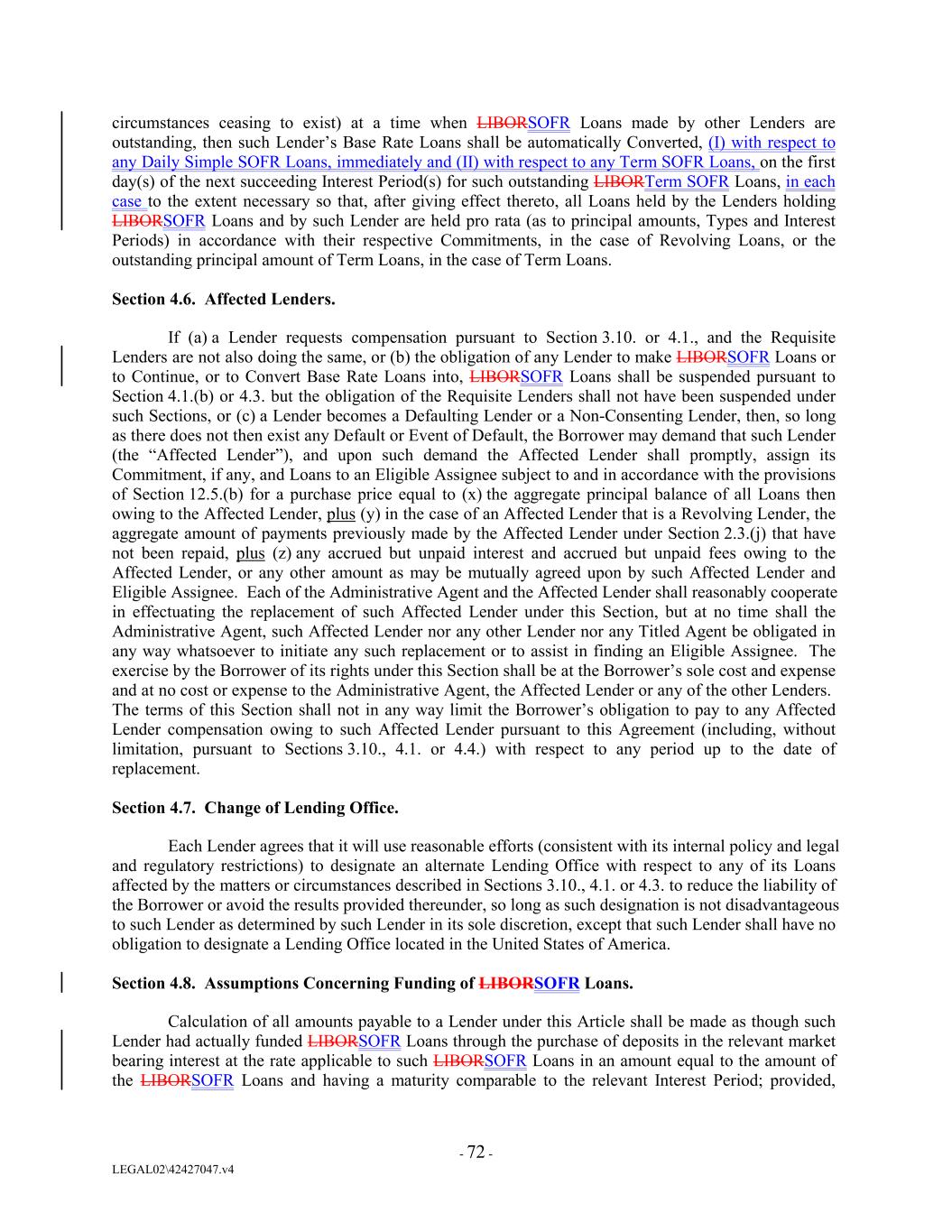 circumstances ceasing to exist) at a time when LIBORSOFR Loans made by other Lenders are outstanding, then such Lender’s Base Rate Loans shall be automatically Converted, (I) with respect to any Daily Simple SOFR Loans, immediately and (II) with respect to any Term SOFR Loans, on the first day(s) of the next succeeding Interest Period(s) for such outstanding LIBORTerm SOFR Loans, in each case to the extent necessary so that, after giving effect thereto, all Loans held by the Lenders holding LIBORSOFR Loans and by such Lender are held pro rata (as to principal amounts, Types and Interest Periods) in accordance with their respective Commitments, in the case of Revolving Loans, or the outstanding principal amount of Term Loans, in the case of Term Loans. Section 4.6. Affected Lenders. If (a) a Lender requests compensation pursuant to Section 3.10. or 4.1., and the Requisite Lenders are not also doing the same, or (b) the obligation of any Lender to make LIBORSOFR Loans or to Continue, or to Convert Base Rate Loans into, LIBORSOFR Loans shall be suspended pursuant to Section 4.1.(b) or 4.3. but the obligation of the Requisite Lenders shall not have been suspended under such Sections, or (c) a Lender becomes a Defaulting Lender or a Non-Consenting Lender, then, so long as there does not then exist any Default or Event of Default, the Borrower may demand that such Lender (the “Affected Lender”), and upon such demand the Affected Lender shall promptly, assign its Commitment, if any, and Loans to an Eligible Assignee subject to and in accordance with the provisions of Section 12.5.(b) for a purchase price equal to (x) the aggregate principal balance of all Loans then owing to the Affected Lender, plus (y) in the case of an Affected Lender that is a Revolving Lender, the aggregate amount of payments previously made by the Affected Lender under Section 2.3.(j) that have not been repaid, plus (z) any accrued but unpaid interest and accrued but unpaid fees owing to the Affected Lender, or any other amount as may be mutually agreed upon by such Affected Lender and Eligible Assignee. Each of the Administrative Agent and the Affected Lender shall reasonably cooperate in effectuating the replacement of such Affected Lender under this Section, but at no time shall the Administrative Agent, such Affected Lender nor any other Lender nor any Titled Agent be obligated in any way whatsoever to initiate any such replacement or to assist in finding an Eligible Assignee. The exercise by the Borrower of its rights under this Section shall be at the Borrower’s sole cost and expense and at no cost or expense to the Administrative Agent, the Affected Lender or any of the other Lenders. The terms of this Section shall not in any way limit the Borrower’s obligation to pay to any Affected Lender compensation owing to such Affected Lender pursuant to this Agreement (including, without limitation, pursuant to Sections 3.10., 4.1. or 4.4.) with respect to any period up to the date of replacement. Section 4.7. Change of Lending Office. Each Lender agrees that it will use reasonable efforts (consistent with its internal policy and legal and regulatory restrictions) to designate an alternate Lending Office with respect to any of its Loans affected by the matters or circumstances described in Sections 3.10., 4.1. or 4.3. to reduce the liability of the Borrower or avoid the results provided thereunder, so long as such designation is not disadvantageous to such Lender as determined by such Lender in its sole discretion, except that such Lender shall have no obligation to designate a Lending Office located in the United States of America. Section 4.8. Assumptions Concerning Funding of LIBORSOFR Loans. Calculation of all amounts payable to a Lender under this Article shall be made as though such Lender had actually funded LIBORSOFR Loans through the purchase of deposits in the relevant market bearing interest at the rate applicable to such LIBORSOFR Loans in an amount equal to the amount of the LIBORSOFR Loans and having a maturity comparable to the relevant Interest Period; provided, - 72 - LEGAL02\42427047.v4