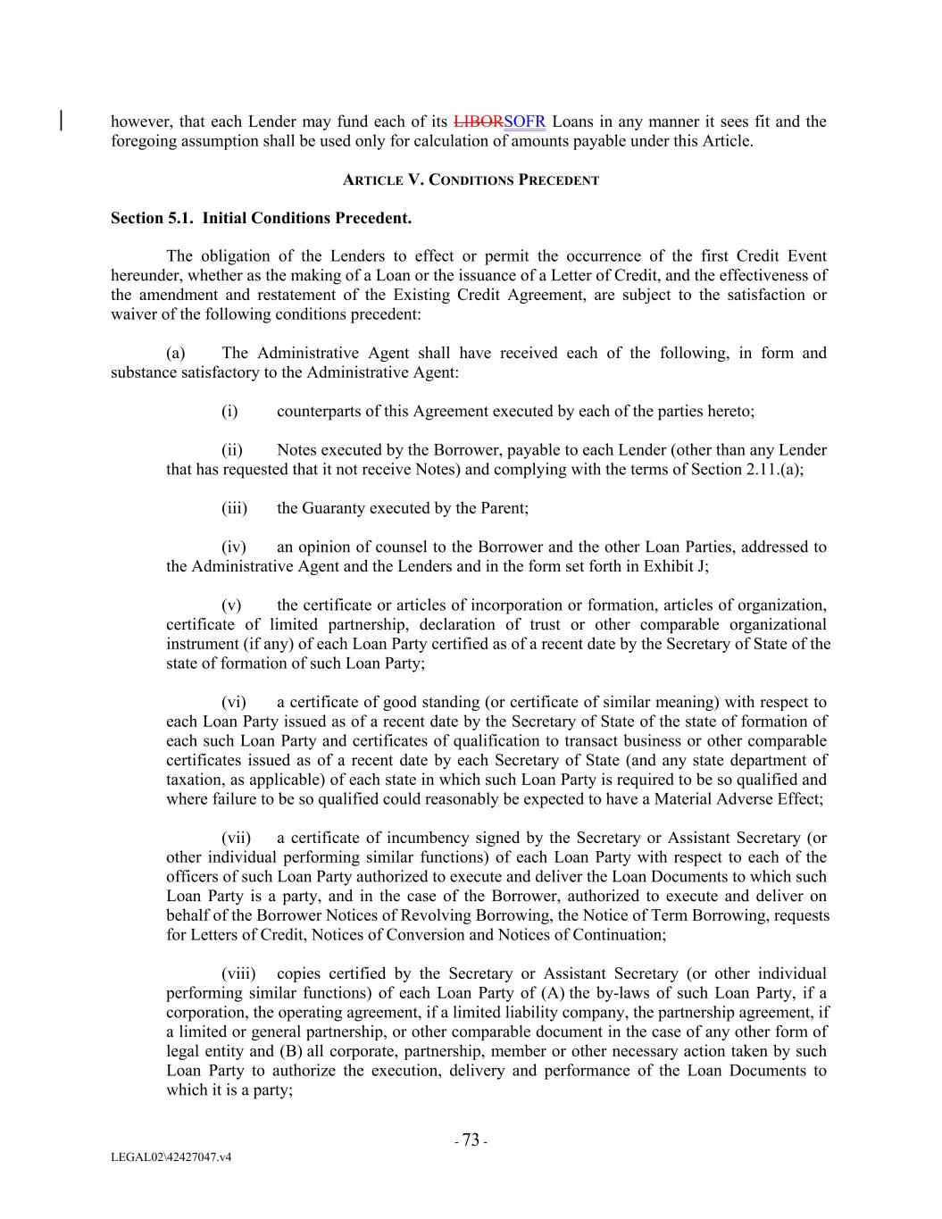 however, that each Lender may fund each of its LIBORSOFR Loans in any manner it sees fit and the foregoing assumption shall be used only for calculation of amounts payable under this Article. ARTICLE V. CONDITIONS PRECEDENT Section 5.1. Initial Conditions Precedent. The obligation of the Lenders to effect or permit the occurrence of the first Credit Event hereunder, whether as the making of a Loan or the issuance of a Letter of Credit, and the effectiveness of the amendment and restatement of the Existing Credit Agreement, are subject to the satisfaction or waiver of the following conditions precedent: (a) The Administrative Agent shall have received each of the following, in form and substance satisfactory to the Administrative Agent: (i) counterparts of this Agreement executed by each of the parties hereto; (ii) Notes executed by the Borrower, payable to each Lender (other than any Lender that has requested that it not receive Notes) and complying with the terms of Section 2.11.(a); (iii) the Guaranty executed by the Parent; (iv) an opinion of counsel to the Borrower and the other Loan Parties, addressed to the Administrative Agent and the Lenders and in the form set forth in Exhibit J; (v) the certificate or articles of incorporation or formation, articles of organization, certificate of limited partnership, declaration of trust or other comparable organizational instrument (if any) of each Loan Party certified as of a recent date by the Secretary of State of the state of formation of such Loan Party; (vi) a certificate of good standing (or certificate of similar meaning) with respect to each Loan Party issued as of a recent date by the Secretary of State of the state of formation of each such Loan Party and certificates of qualification to transact business or other comparable certificates issued as of a recent date by each Secretary of State (and any state department of taxation, as applicable) of each state in which such Loan Party is required to be so qualified and where failure to be so qualified could reasonably be expected to have a Material Adverse Effect; (vii) a certificate of incumbency signed by the Secretary or Assistant Secretary (or other individual performing similar functions) of each Loan Party with respect to each of the officers of such Loan Party authorized to execute and deliver the Loan Documents to which such Loan Party is a party, and in the case of the Borrower, authorized to execute and deliver on behalf of the Borrower Notices of Revolving Borrowing, the Notice of Term Borrowing, requests for Letters of Credit, Notices of Conversion and Notices of Continuation; (viii) copies certified by the Secretary or Assistant Secretary (or other individual performing similar functions) of each Loan Party of (A) the by-laws of such Loan Party, if a corporation, the operating agreement, if a limited liability company, the partnership agreement, if a limited or general partnership, or other comparable document in the case of any other form of legal entity and (B) all corporate, partnership, member or other necessary action taken by such Loan Party to authorize the execution, delivery and performance of the Loan Documents to which it is a party; - 73 - LEGAL02\42427047.v4