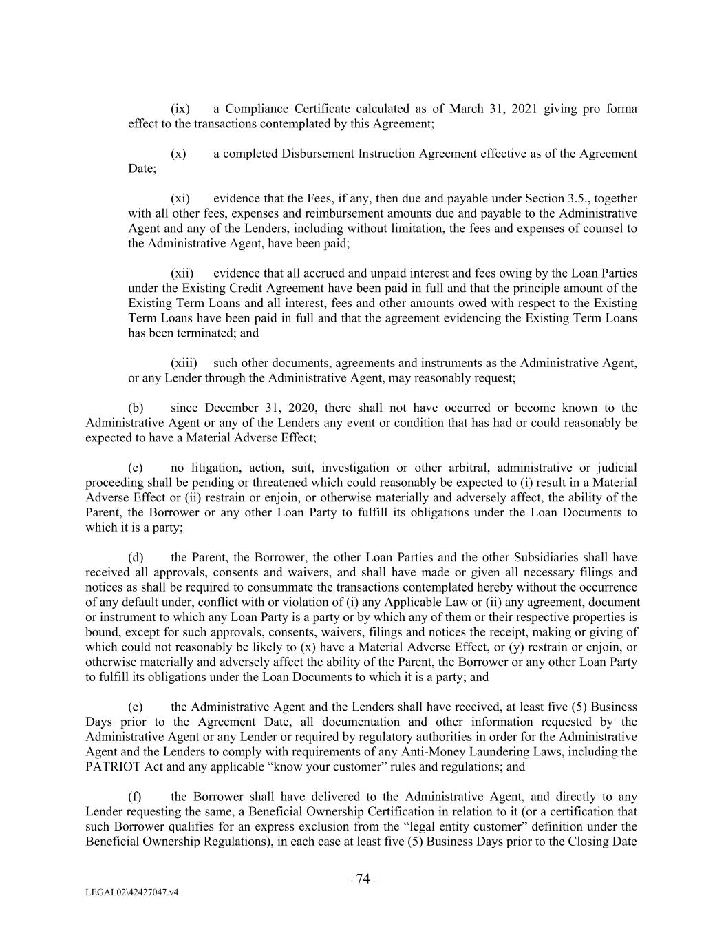 (ix) a Compliance Certificate calculated as of March 31, 2021 giving pro forma effect to the transactions contemplated by this Agreement; (x) a completed Disbursement Instruction Agreement effective as of the Agreement Date; (xi) evidence that the Fees, if any, then due and payable under Section 3.5., together with all other fees, expenses and reimbursement amounts due and payable to the Administrative Agent and any of the Lenders, including without limitation, the fees and expenses of counsel to the Administrative Agent, have been paid; (xii) evidence that all accrued and unpaid interest and fees owing by the Loan Parties under the Existing Credit Agreement have been paid in full and that the principle amount of the Existing Term Loans and all interest, fees and other amounts owed with respect to the Existing Term Loans have been paid in full and that the agreement evidencing the Existing Term Loans has been terminated; and (xiii) such other documents, agreements and instruments as the Administrative Agent, or any Lender through the Administrative Agent, may reasonably request; (b) since December 31, 2020, there shall not have occurred or become known to the Administrative Agent or any of the Lenders any event or condition that has had or could reasonably be expected to have a Material Adverse Effect; (c) no litigation, action, suit, investigation or other arbitral, administrative or judicial proceeding shall be pending or threatened which could reasonably be expected to (i) result in a Material Adverse Effect or (ii) restrain or enjoin, or otherwise materially and adversely affect, the ability of the Parent, the Borrower or any other Loan Party to fulfill its obligations under the Loan Documents to which it is a party; (d) the Parent, the Borrower, the other Loan Parties and the other Subsidiaries shall have received all approvals, consents and waivers, and shall have made or given all necessary filings and notices as shall be required to consummate the transactions contemplated hereby without the occurrence of any default under, conflict with or violation of (i) any Applicable Law or (ii) any agreement, document or instrument to which any Loan Party is a party or by which any of them or their respective properties is bound, except for such approvals, consents, waivers, filings and notices the receipt, making or giving of which could not reasonably be likely to (x) have a Material Adverse Effect, or (y) restrain or enjoin, or otherwise materially and adversely affect the ability of the Parent, the Borrower or any other Loan Party to fulfill its obligations under the Loan Documents to which it is a party; and (e) the Administrative Agent and the Lenders shall have received, at least five (5) Business Days prior to the Agreement Date, all documentation and other information requested by the Administrative Agent or any Lender or required by regulatory authorities in order for the Administrative Agent and the Lenders to comply with requirements of any Anti-Money Laundering Laws, including the PATRIOT Act and any applicable “know your customer” rules and regulations; and (f) the Borrower shall have delivered to the Administrative Agent, and directly to any Lender requesting the same, a Beneficial Ownership Certification in relation to it (or a certification that such Borrower qualifies for an express exclusion from the “legal entity customer” definition under the Beneficial Ownership Regulations), in each case at least five (5) Business Days prior to the Closing Date - 74 - LEGAL02\42427047.v4
