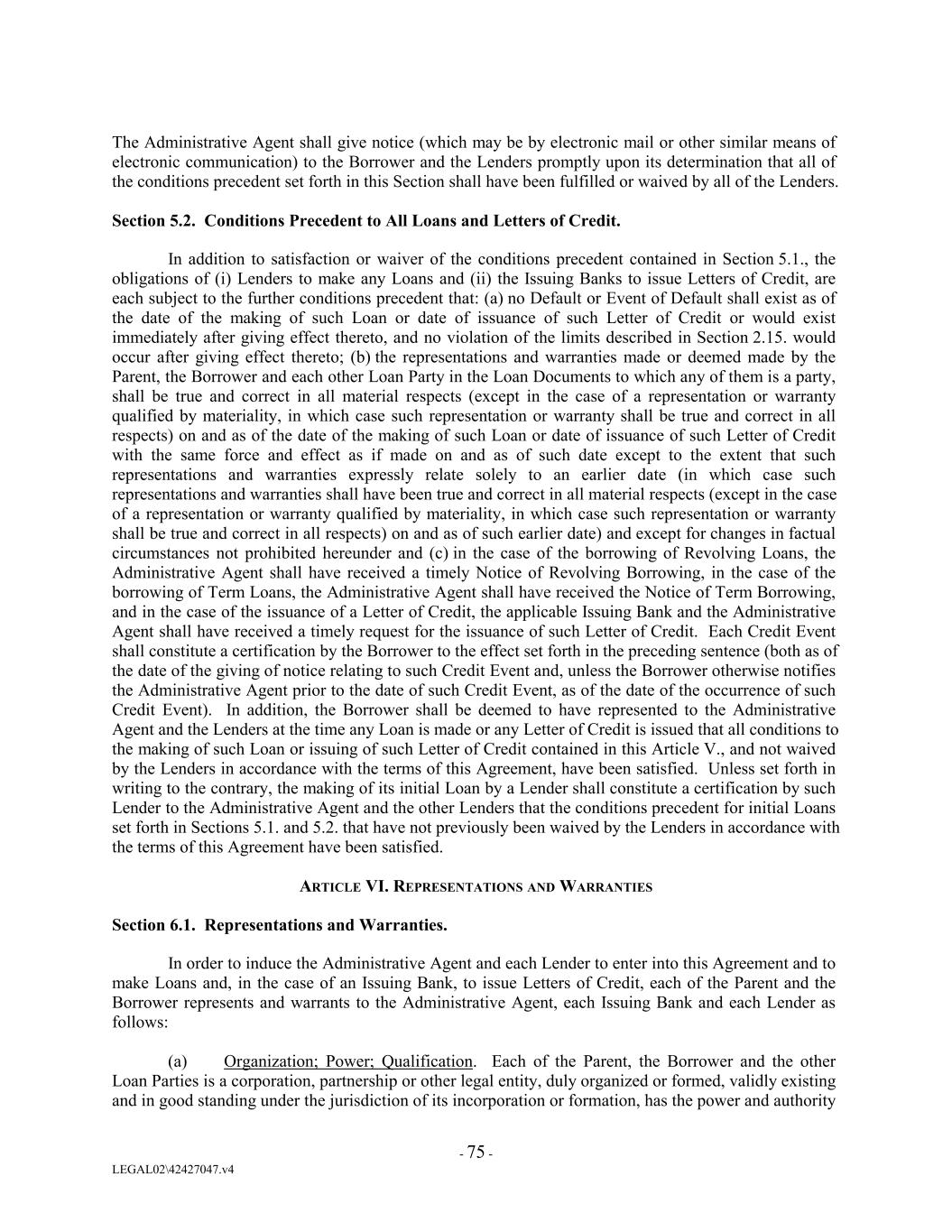 The Administrative Agent shall give notice (which may be by electronic mail or other similar means of electronic communication) to the Borrower and the Lenders promptly upon its determination that all of the conditions precedent set forth in this Section shall have been fulfilled or waived by all of the Lenders. Section 5.2. Conditions Precedent to All Loans and Letters of Credit. In addition to satisfaction or waiver of the conditions precedent contained in Section 5.1., the obligations of (i) Lenders to make any Loans and (ii) the Issuing Banks to issue Letters of Credit, are each subject to the further conditions precedent that: (a) no Default or Event of Default shall exist as of the date of the making of such Loan or date of issuance of such Letter of Credit or would exist immediately after giving effect thereto, and no violation of the limits described in Section 2.15. would occur after giving effect thereto; (b) the representations and warranties made or deemed made by the Parent, the Borrower and each other Loan Party in the Loan Documents to which any of them is a party, shall be true and correct in all material respects (except in the case of a representation or warranty qualified by materiality, in which case such representation or warranty shall be true and correct in all respects) on and as of the date of the making of such Loan or date of issuance of such Letter of Credit with the same force and effect as if made on and as of such date except to the extent that such representations and warranties expressly relate solely to an earlier date (in which case such representations and warranties shall have been true and correct in all material respects (except in the case of a representation or warranty qualified by materiality, in which case such representation or warranty shall be true and correct in all respects) on and as of such earlier date) and except for changes in factual circumstances not prohibited hereunder and (c) in the case of the borrowing of Revolving Loans, the Administrative Agent shall have received a timely Notice of Revolving Borrowing, in the case of the borrowing of Term Loans, the Administrative Agent shall have received the Notice of Term Borrowing, and in the case of the issuance of a Letter of Credit, the applicable Issuing Bank and the Administrative Agent shall have received a timely request for the issuance of such Letter of Credit. Each Credit Event shall constitute a certification by the Borrower to the effect set forth in the preceding sentence (both as of the date of the giving of notice relating to such Credit Event and, unless the Borrower otherwise notifies the Administrative Agent prior to the date of such Credit Event, as of the date of the occurrence of such Credit Event). In addition, the Borrower shall be deemed to have represented to the Administrative Agent and the Lenders at the time any Loan is made or any Letter of Credit is issued that all conditions to the making of such Loan or issuing of such Letter of Credit contained in this Article V., and not waived by the Lenders in accordance with the terms of this Agreement, have been satisfied. Unless set forth in writing to the contrary, the making of its initial Loan by a Lender shall constitute a certification by such Lender to the Administrative Agent and the other Lenders that the conditions precedent for initial Loans set forth in Sections 5.1. and 5.2. that have not previously been waived by the Lenders in accordance with the terms of this Agreement have been satisfied. ARTICLE VI. REPRESENTATIONS AND WARRANTIES Section 6.1. Representations and Warranties. In order to induce the Administrative Agent and each Lender to enter into this Agreement and to make Loans and, in the case of an Issuing Bank, to issue Letters of Credit, each of the Parent and the Borrower represents and warrants to the Administrative Agent, each Issuing Bank and each Lender as follows: (a) Organization; Power; Qualification. Each of the Parent, the Borrower and the other Loan Parties is a corporation, partnership or other legal entity, duly organized or formed, validly existing and in good standing under the jurisdiction of its incorporation or formation, has the power and authority - 75 - LEGAL02\42427047.v4
