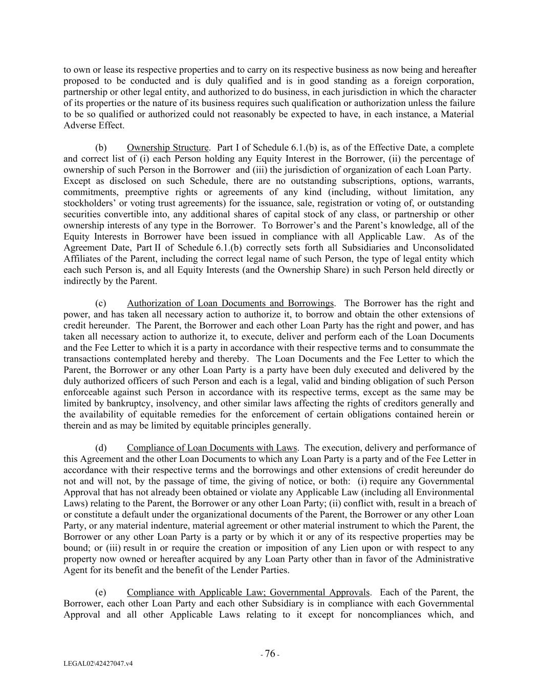 to own or lease its respective properties and to carry on its respective business as now being and hereafter proposed to be conducted and is duly qualified and is in good standing as a foreign corporation, partnership or other legal entity, and authorized to do business, in each jurisdiction in which the character of its properties or the nature of its business requires such qualification or authorization unless the failure to be so qualified or authorized could not reasonably be expected to have, in each instance, a Material Adverse Effect. (b) Ownership Structure. Part I of Schedule 6.1.(b) is, as of the Effective Date, a complete and correct list of (i) each Person holding any Equity Interest in the Borrower, (ii) the percentage of ownership of such Person in the Borrower and (iii) the jurisdiction of organization of each Loan Party. Except as disclosed on such Schedule, there are no outstanding subscriptions, options, warrants, commitments, preemptive rights or agreements of any kind (including, without limitation, any stockholders’ or voting trust agreements) for the issuance, sale, registration or voting of, or outstanding securities convertible into, any additional shares of capital stock of any class, or partnership or other ownership interests of any type in the Borrower. To Borrower’s and the Parent’s knowledge, all of the Equity Interests in Borrower have been issued in compliance with all Applicable Law. As of the Agreement Date, Part II of Schedule 6.1.(b) correctly sets forth all Subsidiaries and Unconsolidated Affiliates of the Parent, including the correct legal name of such Person, the type of legal entity which each such Person is, and all Equity Interests (and the Ownership Share) in such Person held directly or indirectly by the Parent. (c) Authorization of Loan Documents and Borrowings. The Borrower has the right and power, and has taken all necessary action to authorize it, to borrow and obtain the other extensions of credit hereunder. The Parent, the Borrower and each other Loan Party has the right and power, and has taken all necessary action to authorize it, to execute, deliver and perform each of the Loan Documents and the Fee Letter to which it is a party in accordance with their respective terms and to consummate the transactions contemplated hereby and thereby. The Loan Documents and the Fee Letter to which the Parent, the Borrower or any other Loan Party is a party have been duly executed and delivered by the duly authorized officers of such Person and each is a legal, valid and binding obligation of such Person enforceable against such Person in accordance with its respective terms, except as the same may be limited by bankruptcy, insolvency, and other similar laws affecting the rights of creditors generally and the availability of equitable remedies for the enforcement of certain obligations contained herein or therein and as may be limited by equitable principles generally. (d) Compliance of Loan Documents with Laws. The execution, delivery and performance of this Agreement and the other Loan Documents to which any Loan Party is a party and of the Fee Letter in accordance with their respective terms and the borrowings and other extensions of credit hereunder do not and will not, by the passage of time, the giving of notice, or both: (i) require any Governmental Approval that has not already been obtained or violate any Applicable Law (including all Environmental Laws) relating to the Parent, the Borrower or any other Loan Party; (ii) conflict with, result in a breach of or constitute a default under the organizational documents of the Parent, the Borrower or any other Loan Party, or any material indenture, material agreement or other material instrument to which the Parent, the Borrower or any other Loan Party is a party or by which it or any of its respective properties may be bound; or (iii) result in or require the creation or imposition of any Lien upon or with respect to any property now owned or hereafter acquired by any Loan Party other than in favor of the Administrative Agent for its benefit and the benefit of the Lender Parties. (e) Compliance with Applicable Law; Governmental Approvals. Each of the Parent, the Borrower, each other Loan Party and each other Subsidiary is in compliance with each Governmental Approval and all other Applicable Laws relating to it except for noncompliances which, and - 76 - LEGAL02\42427047.v4
