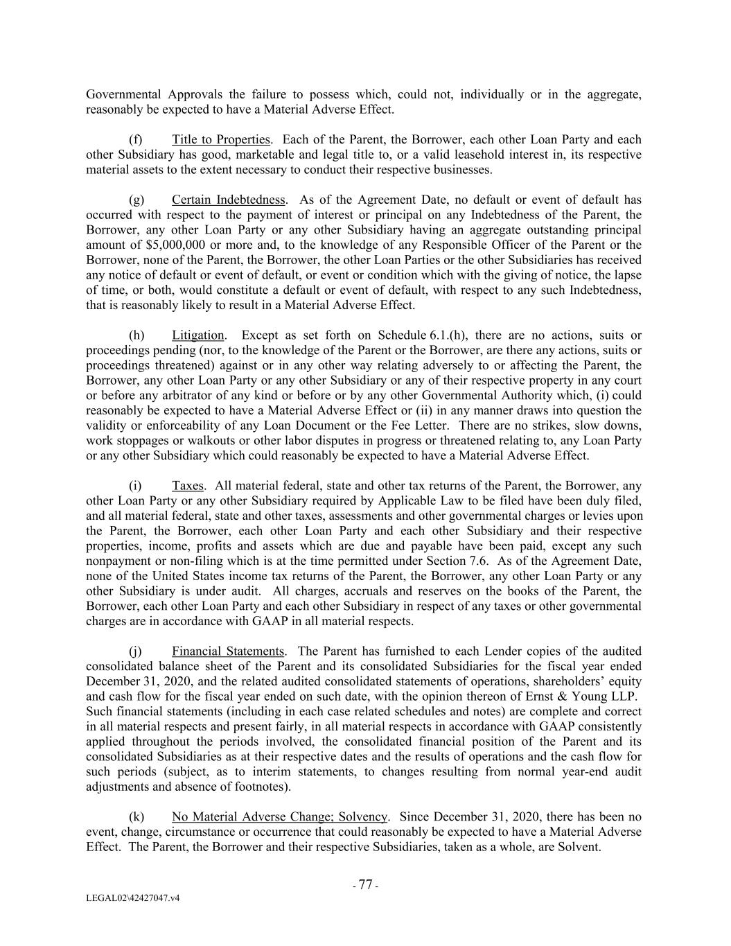Governmental Approvals the failure to possess which, could not, individually or in the aggregate, reasonably be expected to have a Material Adverse Effect. (f) Title to Properties. Each of the Parent, the Borrower, each other Loan Party and each other Subsidiary has good, marketable and legal title to, or a valid leasehold interest in, its respective material assets to the extent necessary to conduct their respective businesses. (g) Certain Indebtedness. As of the Agreement Date, no default or event of default has occurred with respect to the payment of interest or principal on any Indebtedness of the Parent, the Borrower, any other Loan Party or any other Subsidiary having an aggregate outstanding principal amount of $5,000,000 or more and, to the knowledge of any Responsible Officer of the Parent or the Borrower, none of the Parent, the Borrower, the other Loan Parties or the other Subsidiaries has received any notice of default or event of default, or event or condition which with the giving of notice, the lapse of time, or both, would constitute a default or event of default, with respect to any such Indebtedness, that is reasonably likely to result in a Material Adverse Effect. (h) Litigation. Except as set forth on Schedule 6.1.(h), there are no actions, suits or proceedings pending (nor, to the knowledge of the Parent or the Borrower, are there any actions, suits or proceedings threatened) against or in any other way relating adversely to or affecting the Parent, the Borrower, any other Loan Party or any other Subsidiary or any of their respective property in any court or before any arbitrator of any kind or before or by any other Governmental Authority which, (i) could reasonably be expected to have a Material Adverse Effect or (ii) in any manner draws into question the validity or enforceability of any Loan Document or the Fee Letter. There are no strikes, slow downs, work stoppages or walkouts or other labor disputes in progress or threatened relating to, any Loan Party or any other Subsidiary which could reasonably be expected to have a Material Adverse Effect. (i) Taxes. All material federal, state and other tax returns of the Parent, the Borrower, any other Loan Party or any other Subsidiary required by Applicable Law to be filed have been duly filed, and all material federal, state and other taxes, assessments and other governmental charges or levies upon the Parent, the Borrower, each other Loan Party and each other Subsidiary and their respective properties, income, profits and assets which are due and payable have been paid, except any such nonpayment or non-filing which is at the time permitted under Section 7.6. As of the Agreement Date, none of the United States income tax returns of the Parent, the Borrower, any other Loan Party or any other Subsidiary is under audit. All charges, accruals and reserves on the books of the Parent, the Borrower, each other Loan Party and each other Subsidiary in respect of any taxes or other governmental charges are in accordance with GAAP in all material respects. (j) Financial Statements. The Parent has furnished to each Lender copies of the audited consolidated balance sheet of the Parent and its consolidated Subsidiaries for the fiscal year ended December 31, 2020, and the related audited consolidated statements of operations, shareholders’ equity and cash flow for the fiscal year ended on such date, with the opinion thereon of Ernst & Young LLP. Such financial statements (including in each case related schedules and notes) are complete and correct in all material respects and present fairly, in all material respects in accordance with GAAP consistently applied throughout the periods involved, the consolidated financial position of the Parent and its consolidated Subsidiaries as at their respective dates and the results of operations and the cash flow for such periods (subject, as to interim statements, to changes resulting from normal year-end audit adjustments and absence of footnotes). (k) No Material Adverse Change; Solvency. Since December 31, 2020, there has been no event, change, circumstance or occurrence that could reasonably be expected to have a Material Adverse Effect. The Parent, the Borrower and their respective Subsidiaries, taken as a whole, are Solvent. - 77 - LEGAL02\42427047.v4