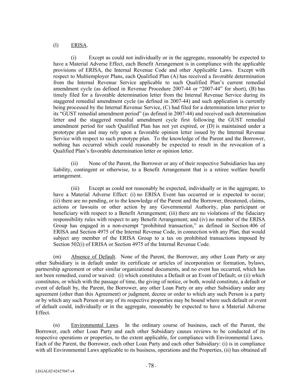 (l) ERISA. (i) Except as could not individually or in the aggregate, reasonably be expected to have a Material Adverse Effect, each Benefit Arrangement is in compliance with the applicable provisions of ERISA, the Internal Revenue Code and other Applicable Laws. Except with respect to Multiemployer Plans, each Qualified Plan (A) has received a favorable determination from the Internal Revenue Service applicable to such Qualified Plan’s current remedial amendment cycle (as defined in Revenue Procedure 2007-44 or “2007-44” for short), (B) has timely filed for a favorable determination letter from the Internal Revenue Service during its staggered remedial amendment cycle (as defined in 2007-44) and such application is currently being processed by the Internal Revenue Service, (C) had filed for a determination letter prior to its “GUST remedial amendment period” (as defined in 2007-44) and received such determination letter and the staggered remedial amendment cycle first following the GUST remedial amendment period for such Qualified Plan has not yet expired, or (D) is maintained under a prototype plan and may rely upon a favorable opinion letter issued by the Internal Revenue Service with respect to such prototype plan. To the knowledge of the Parent and the Borrower, nothing has occurred which could reasonably be expected to result in the revocation of a Qualified Plan’s favorable determination letter or opinion letter. (ii) None of the Parent, the Borrower or any of their respective Subsidiaries has any liability, contingent or otherwise, to a Benefit Arrangement that is a retiree welfare benefit arrangement. (iii) Except as could not reasonably be expected, individually or in the aggregate, to have a Material Adverse Effect: (i) no ERISA Event has occurred or is expected to occur; (ii) there are no pending, or to the knowledge of the Parent and the Borrower, threatened, claims, actions or lawsuits or other action by any Governmental Authority, plan participant or beneficiary with respect to a Benefit Arrangement; (iii) there are no violations of the fiduciary responsibility rules with respect to any Benefit Arrangement; and (iv) no member of the ERISA Group has engaged in a non-exempt “prohibited transaction,” as defined in Section 406 of ERISA and Section 4975 of the Internal Revenue Code, in connection with any Plan, that would subject any member of the ERISA Group to a tax on prohibited transactions imposed by Section 502(i) of ERISA or Section 4975 of the Internal Revenue Code. (m) Absence of Default. None of the Parent, the Borrower, any other Loan Party or any other Subsidiary is in default under its certificate or articles of incorporation or formation, bylaws, partnership agreement or other similar organizational documents, and no event has occurred, which has not been remedied, cured or waived: (i) which constitutes a Default or an Event of Default; or (ii) which constitutes, or which with the passage of time, the giving of notice, or both, would constitute, a default or event of default by, the Parent, the Borrower, any other Loan Party or any other Subsidiary under any agreement (other than this Agreement) or judgment, decree or order to which any such Person is a party or by which any such Person or any of its respective properties may be bound where such default or event of default could, individually or in the aggregate, reasonably be expected to have a Material Adverse Effect. (n) Environmental Laws. In the ordinary course of business, each of the Parent, the Borrower, each other Loan Party and each other Subsidiary causes reviews to be conducted of its respective operations or properties, to the extent applicable, for compliance with Environmental Laws. Each of the Parent, the Borrower, each other Loan Party and each other Subsidiary: (i) is in compliance with all Environmental Laws applicable to its business, operations and the Properties, (ii) has obtained all - 78 - LEGAL02\42427047.v4