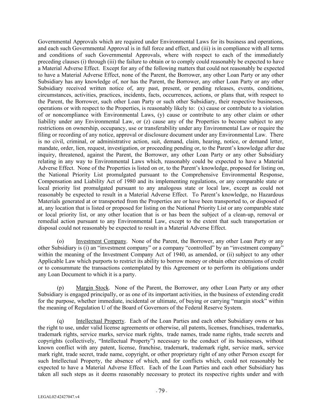 Governmental Approvals which are required under Environmental Laws for its business and operations, and each such Governmental Approval is in full force and effect, and (iii) is in compliance with all terms and conditions of such Governmental Approvals, where with respect to each of the immediately preceding clauses (i) through (iii) the failure to obtain or to comply could reasonably be expected to have a Material Adverse Effect. Except for any of the following matters that could not reasonably be expected to have a Material Adverse Effect, none of the Parent, the Borrower, any other Loan Party or any other Subsidiary has any knowledge of, nor has the Parent, the Borrower, any other Loan Party or any other Subsidiary received written notice of, any past, present, or pending releases, events, conditions, circumstances, activities, practices, incidents, facts, occurrences, actions, or plans that, with respect to the Parent, the Borrower, such other Loan Party or such other Subsidiary, their respective businesses, operations or with respect to the Properties, is reasonably likely to: (x) cause or contribute to a violation of or noncompliance with Environmental Laws, (y) cause or contribute to any other claim or other liability under any Environmental Law, or (z) cause any of the Properties to become subject to any restrictions on ownership, occupancy, use or transferability under any Environmental Law or require the filing or recording of any notice, approval or disclosure document under any Environmental Law. There is no civil, criminal, or administrative action, suit, demand, claim, hearing, notice, or demand letter, mandate, order, lien, request, investigation, or proceeding pending or, to the Parent’s knowledge after due inquiry, threatened, against the Parent, the Borrower, any other Loan Party or any other Subsidiary relating in any way to Environmental Laws which, reasonably could be expected to have a Material Adverse Effect. None of the Properties is listed on or, to the Parent’s knowledge, proposed for listing on, the National Priority List promulgated pursuant to the Comprehensive Environmental Response, Compensation and Liability Act of 1980 and its implementing regulations, or any comparable state or local priority list promulgated pursuant to any analogous state or local law, except as could not reasonably be expected to result in a Material Adverse Effect. To Parent’s knowledge, no Hazardous Materials generated at or transported from the Properties are or have been transported to, or disposed of at, any location that is listed or proposed for listing on the National Priority List or any comparable state or local priority list, or any other location that is or has been the subject of a clean-up, removal or remedial action pursuant to any Environmental Law, except to the extent that such transportation or disposal could not reasonably be expected to result in a Material Adverse Effect. (o) Investment Company. None of the Parent, the Borrower, any other Loan Party or any other Subsidiary is (i) an “investment company” or a company “controlled” by an “investment company” within the meaning of the Investment Company Act of 1940, as amended, or (ii) subject to any other Applicable Law which purports to restrict its ability to borrow money or obtain other extensions of credit or to consummate the transactions contemplated by this Agreement or to perform its obligations under any Loan Document to which it is a party. (p) Margin Stock. None of the Parent, the Borrower, any other Loan Party or any other Subsidiary is engaged principally, or as one of its important activities, in the business of extending credit for the purpose, whether immediate, incidental or ultimate, of buying or carrying “margin stock” within the meaning of Regulation U of the Board of Governors of the Federal Reserve System. (q) Intellectual Property. Each of the Loan Parties and each other Subsidiary owns or has the right to use, under valid license agreements or otherwise, all patents, licenses, franchises, trademarks, trademark rights, service marks, service mark rights, trade names, trade name rights, trade secrets and copyrights (collectively, “Intellectual Property”) necessary to the conduct of its businesses, without known conflict with any patent, license, franchise, trademark, trademark right, service mark, service mark right, trade secret, trade name, copyright, or other proprietary right of any other Person except for such Intellectual Property, the absence of which, and for conflicts which, could not reasonably be expected to have a Material Adverse Effect. Each of the Loan Parties and each other Subsidiary has taken all such steps as it deems reasonably necessary to protect its respective rights under and with - 79 - LEGAL02\42427047.v4