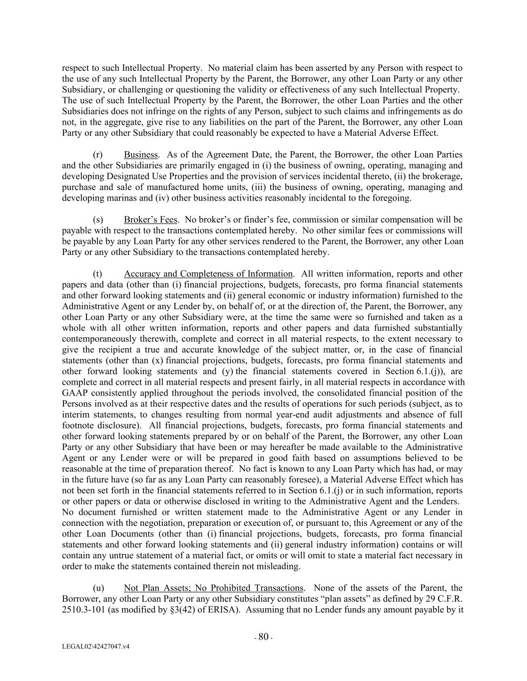 respect to such Intellectual Property. No material claim has been asserted by any Person with respect to the use of any such Intellectual Property by the Parent, the Borrower, any other Loan Party or any other Subsidiary, or challenging or questioning the validity or effectiveness of any such Intellectual Property. The use of such Intellectual Property by the Parent, the Borrower, the other Loan Parties and the other Subsidiaries does not infringe on the rights of any Person, subject to such claims and infringements as do not, in the aggregate, give rise to any liabilities on the part of the Parent, the Borrower, any other Loan Party or any other Subsidiary that could reasonably be expected to have a Material Adverse Effect. (r) Business. As of the Agreement Date, the Parent, the Borrower, the other Loan Parties and the other Subsidiaries are primarily engaged in (i) the business of owning, operating, managing and developing Designated Use Properties and the provision of services incidental thereto, (ii) the brokerage, purchase and sale of manufactured home units, (iii) the business of owning, operating, managing and developing marinas and (iv) other business activities reasonably incidental to the foregoing. (s) Broker’s Fees. No broker’s or finder’s fee, commission or similar compensation will be payable with respect to the transactions contemplated hereby. No other similar fees or commissions will be payable by any Loan Party for any other services rendered to the Parent, the Borrower, any other Loan Party or any other Subsidiary to the transactions contemplated hereby. (t) Accuracy and Completeness of Information. All written information, reports and other papers and data (other than (i) financial projections, budgets, forecasts, pro forma financial statements and other forward looking statements and (ii) general economic or industry information) furnished to the Administrative Agent or any Lender by, on behalf of, or at the direction of, the Parent, the Borrower, any other Loan Party or any other Subsidiary were, at the time the same were so furnished and taken as a whole with all other written information, reports and other papers and data furnished substantially contemporaneously therewith, complete and correct in all material respects, to the extent necessary to give the recipient a true and accurate knowledge of the subject matter, or, in the case of financial statements (other than (x) financial projections, budgets, forecasts, pro forma financial statements and other forward looking statements and (y) the financial statements covered in Section 6.1.(j)), are complete and correct in all material respects and present fairly, in all material respects in accordance with GAAP consistently applied throughout the periods involved, the consolidated financial position of the Persons involved as at their respective dates and the results of operations for such periods (subject, as to interim statements, to changes resulting from normal year-end audit adjustments and absence of full footnote disclosure). All financial projections, budgets, forecasts, pro forma financial statements and other forward looking statements prepared by or on behalf of the Parent, the Borrower, any other Loan Party or any other Subsidiary that have been or may hereafter be made available to the Administrative Agent or any Lender were or will be prepared in good faith based on assumptions believed to be reasonable at the time of preparation thereof. No fact is known to any Loan Party which has had, or may in the future have (so far as any Loan Party can reasonably foresee), a Material Adverse Effect which has not been set forth in the financial statements referred to in Section 6.1.(j) or in such information, reports or other papers or data or otherwise disclosed in writing to the Administrative Agent and the Lenders. No document furnished or written statement made to the Administrative Agent or any Lender in connection with the negotiation, preparation or execution of, or pursuant to, this Agreement or any of the other Loan Documents (other than (i) financial projections, budgets, forecasts, pro forma financial statements and other forward looking statements and (ii) general industry information) contains or will contain any untrue statement of a material fact, or omits or will omit to state a material fact necessary in order to make the statements contained therein not misleading. (u) Not Plan Assets; No Prohibited Transactions. None of the assets of the Parent, the Borrower, any other Loan Party or any other Subsidiary constitutes “plan assets” as defined by 29 C.F.R. 2510.3-101 (as modified by §3(42) of ERISA). Assuming that no Lender funds any amount payable by it - 80 - LEGAL02\42427047.v4