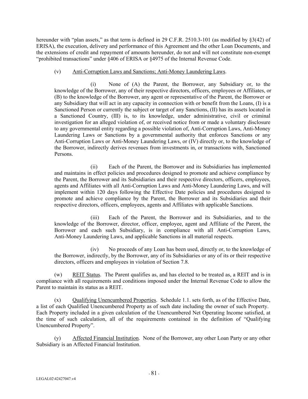 hereunder with “plan assets,” as that term is defined in 29 C.F.R. 2510.3-101 (as modified by §3(42) of ERISA), the execution, delivery and performance of this Agreement and the other Loan Documents, and the extensions of credit and repayment of amounts hereunder, do not and will not constitute non-exempt “prohibited transactions” under §406 of ERISA or §4975 of the Internal Revenue Code. (v) Anti-Corruption Laws and Sanctions; Anti-Money Laundering Laws. (i) None of (A) the Parent, the Borrower, any Subsidiary or, to the knowledge of the Borrower, any of their respective directors, officers, employees or Affiliates, or (B) to the knowledge of the Borrower, any agent or representative of the Parent, the Borrower or any Subsidiary that will act in any capacity in connection with or benefit from the Loans, (I) is a Sanctioned Person or currently the subject or target of any Sanctions, (II) has its assets located in a Sanctioned Country, (III) is, to its knowledge, under administrative, civil or criminal investigation for an alleged violation of, or received notice from or made a voluntary disclosure to any governmental entity regarding a possible violation of, Anti-Corruption Laws, Anti-Money Laundering Laws or Sanctions by a governmental authority that enforces Sanctions or any Anti-Corruption Laws or Anti-Money Laundering Laws, or (IV) directly or, to the knowledge of the Borrower, indirectly derives revenues from investments in, or transactions with, Sanctioned Persons. (ii) Each of the Parent, the Borrower and its Subsidiaries has implemented and maintains in effect policies and procedures designed to promote and achieve compliance by the Parent, the Borrower and its Subsidiaries and their respective directors, officers, employees, agents and Affiliates with all Anti-Corruption Laws and Anti-Money Laundering Laws, and will implement within 120 days following the Effective Date policies and procedures designed to promote and achieve compliance by the Parent, the Borrower and its Subsidiaries and their respective directors, officers, employees, agents and Affiliates with applicable Sanctions. (iii) Each of the Parent, the Borrower and its Subsidiaries, and to the knowledge of the Borrower, director, officer, employee, agent and Affiliate of the Parent, the Borrower and each such Subsidiary, is in compliance with all Anti-Corruption Laws, Anti-Money Laundering Laws, and applicable Sanctions in all material respects. (iv) No proceeds of any Loan has been used, directly or, to the knowledge of the Borrower, indirectly, by the Borrower, any of its Subsidiaries or any of its or their respective directors, officers and employees in violation of Section 7.8. (w) REIT Status. The Parent qualifies as, and has elected to be treated as, a REIT and is in compliance with all requirements and conditions imposed under the Internal Revenue Code to allow the Parent to maintain its status as a REIT. (x) Qualifying Unencumbered Properties. Schedule 1.1. sets forth, as of the Effective Date, a list of each Qualified Unencumbered Property as of such date including the owner of such Property. Each Property included in a given calculation of the Unencumbered Net Operating Income satisfied, at the time of such calculation, all of the requirements contained in the definition of “Qualifying Unencumbered Property”. (y) Affected Financial Institution. None of the Borrower, any other Loan Party or any other Subsidiary is an Affected Financial Institution. - 81 - LEGAL02\42427047.v4