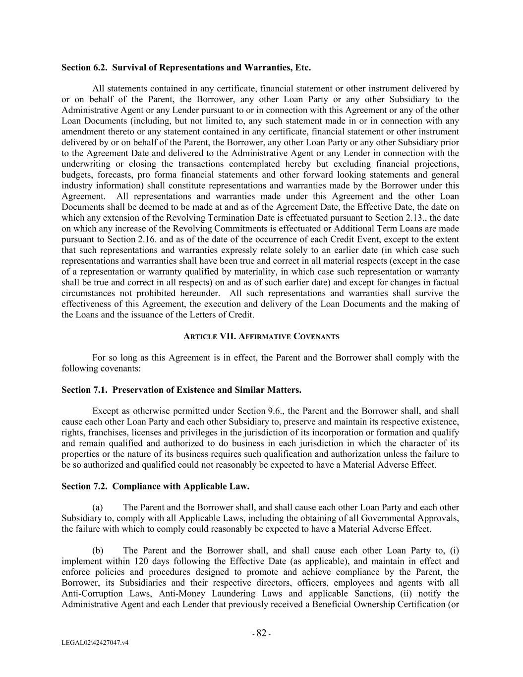 Section 6.2. Survival of Representations and Warranties, Etc. All statements contained in any certificate, financial statement or other instrument delivered by or on behalf of the Parent, the Borrower, any other Loan Party or any other Subsidiary to the Administrative Agent or any Lender pursuant to or in connection with this Agreement or any of the other Loan Documents (including, but not limited to, any such statement made in or in connection with any amendment thereto or any statement contained in any certificate, financial statement or other instrument delivered by or on behalf of the Parent, the Borrower, any other Loan Party or any other Subsidiary prior to the Agreement Date and delivered to the Administrative Agent or any Lender in connection with the underwriting or closing the transactions contemplated hereby but excluding financial projections, budgets, forecasts, pro forma financial statements and other forward looking statements and general industry information) shall constitute representations and warranties made by the Borrower under this Agreement. All representations and warranties made under this Agreement and the other Loan Documents shall be deemed to be made at and as of the Agreement Date, the Effective Date, the date on which any extension of the Revolving Termination Date is effectuated pursuant to Section 2.13., the date on which any increase of the Revolving Commitments is effectuated or Additional Term Loans are made pursuant to Section 2.16. and as of the date of the occurrence of each Credit Event, except to the extent that such representations and warranties expressly relate solely to an earlier date (in which case such representations and warranties shall have been true and correct in all material respects (except in the case of a representation or warranty qualified by materiality, in which case such representation or warranty shall be true and correct in all respects) on and as of such earlier date) and except for changes in factual circumstances not prohibited hereunder. All such representations and warranties shall survive the effectiveness of this Agreement, the execution and delivery of the Loan Documents and the making of the Loans and the issuance of the Letters of Credit. ARTICLE VII. AFFIRMATIVE COVENANTS For so long as this Agreement is in effect, the Parent and the Borrower shall comply with the following covenants: Section 7.1. Preservation of Existence and Similar Matters. Except as otherwise permitted under Section 9.6., the Parent and the Borrower shall, and shall cause each other Loan Party and each other Subsidiary to, preserve and maintain its respective existence, rights, franchises, licenses and privileges in the jurisdiction of its incorporation or formation and qualify and remain qualified and authorized to do business in each jurisdiction in which the character of its properties or the nature of its business requires such qualification and authorization unless the failure to be so authorized and qualified could not reasonably be expected to have a Material Adverse Effect. Section 7.2. Compliance with Applicable Law. (a) The Parent and the Borrower shall, and shall cause each other Loan Party and each other Subsidiary to, comply with all Applicable Laws, including the obtaining of all Governmental Approvals, the failure with which to comply could reasonably be expected to have a Material Adverse Effect. (b) The Parent and the Borrower shall, and shall cause each other Loan Party to, (i) implement within 120 days following the Effective Date (as applicable), and maintain in effect and enforce policies and procedures designed to promote and achieve compliance by the Parent, the Borrower, its Subsidiaries and their respective directors, officers, employees and agents with all Anti-Corruption Laws, Anti-Money Laundering Laws and applicable Sanctions, (ii) notify the Administrative Agent and each Lender that previously received a Beneficial Ownership Certification (or - 82 - LEGAL02\42427047.v4