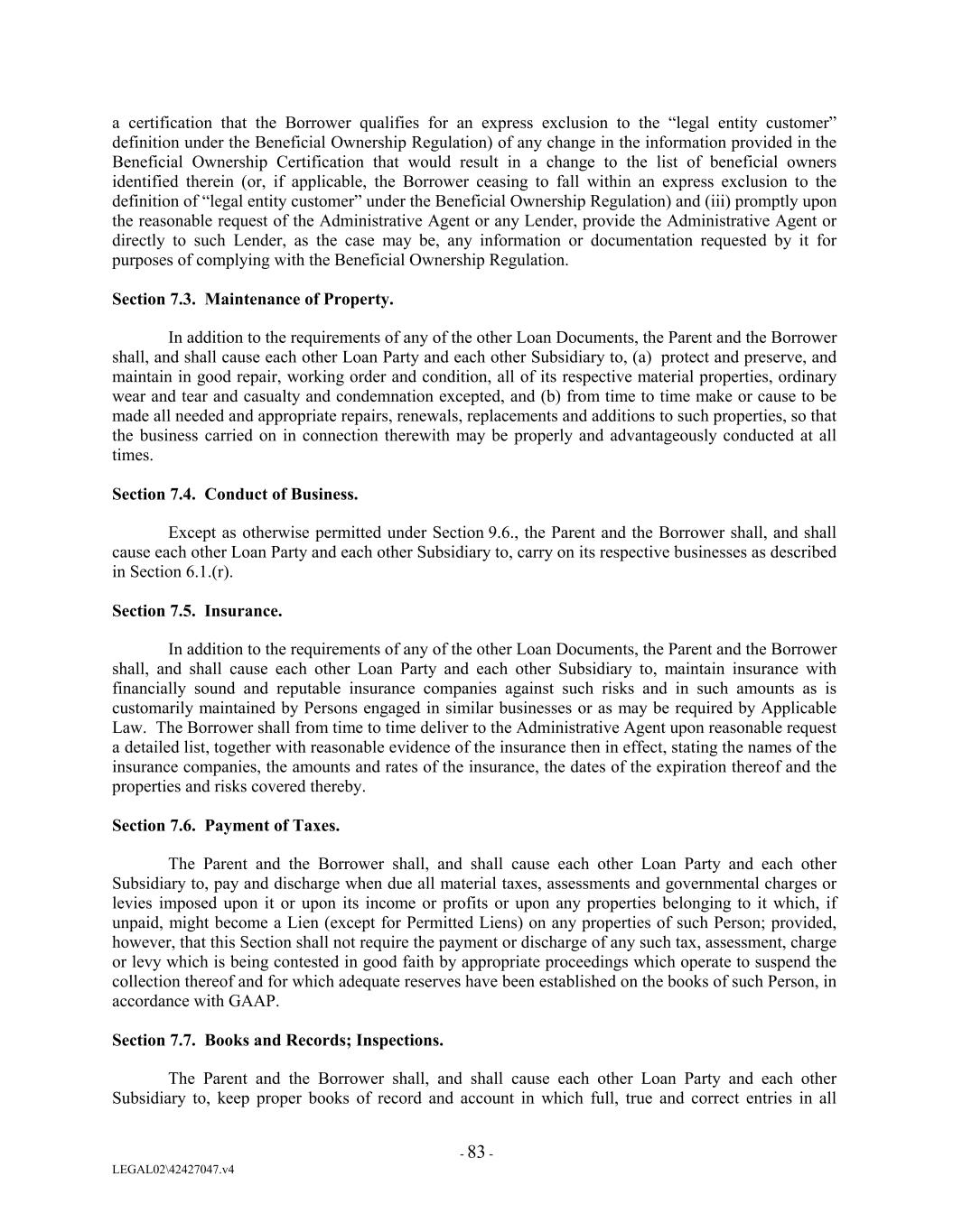 a certification that the Borrower qualifies for an express exclusion to the “legal entity customer” definition under the Beneficial Ownership Regulation) of any change in the information provided in the Beneficial Ownership Certification that would result in a change to the list of beneficial owners identified therein (or, if applicable, the Borrower ceasing to fall within an express exclusion to the definition of “legal entity customer” under the Beneficial Ownership Regulation) and (iii) promptly upon the reasonable request of the Administrative Agent or any Lender, provide the Administrative Agent or directly to such Lender, as the case may be, any information or documentation requested by it for purposes of complying with the Beneficial Ownership Regulation. Section 7.3. Maintenance of Property. In addition to the requirements of any of the other Loan Documents, the Parent and the Borrower shall, and shall cause each other Loan Party and each other Subsidiary to, (a) protect and preserve, and maintain in good repair, working order and condition, all of its respective material properties, ordinary wear and tear and casualty and condemnation excepted, and (b) from time to time make or cause to be made all needed and appropriate repairs, renewals, replacements and additions to such properties, so that the business carried on in connection therewith may be properly and advantageously conducted at all times. Section 7.4. Conduct of Business. Except as otherwise permitted under Section 9.6., the Parent and the Borrower shall, and shall cause each other Loan Party and each other Subsidiary to, carry on its respective businesses as described in Section 6.1.(r). Section 7.5. Insurance. In addition to the requirements of any of the other Loan Documents, the Parent and the Borrower shall, and shall cause each other Loan Party and each other Subsidiary to, maintain insurance with financially sound and reputable insurance companies against such risks and in such amounts as is customarily maintained by Persons engaged in similar businesses or as may be required by Applicable Law. The Borrower shall from time to time deliver to the Administrative Agent upon reasonable request a detailed list, together with reasonable evidence of the insurance then in effect, stating the names of the insurance companies, the amounts and rates of the insurance, the dates of the expiration thereof and the properties and risks covered thereby. Section 7.6. Payment of Taxes. The Parent and the Borrower shall, and shall cause each other Loan Party and each other Subsidiary to, pay and discharge when due all material taxes, assessments and governmental charges or levies imposed upon it or upon its income or profits or upon any properties belonging to it which, if unpaid, might become a Lien (except for Permitted Liens) on any properties of such Person; provided, however, that this Section shall not require the payment or discharge of any such tax, assessment, charge or levy which is being contested in good faith by appropriate proceedings which operate to suspend the collection thereof and for which adequate reserves have been established on the books of such Person, in accordance with GAAP. Section 7.7. Books and Records; Inspections. The Parent and the Borrower shall, and shall cause each other Loan Party and each other Subsidiary to, keep proper books of record and account in which full, true and correct entries in all - 83 - LEGAL02\42427047.v4