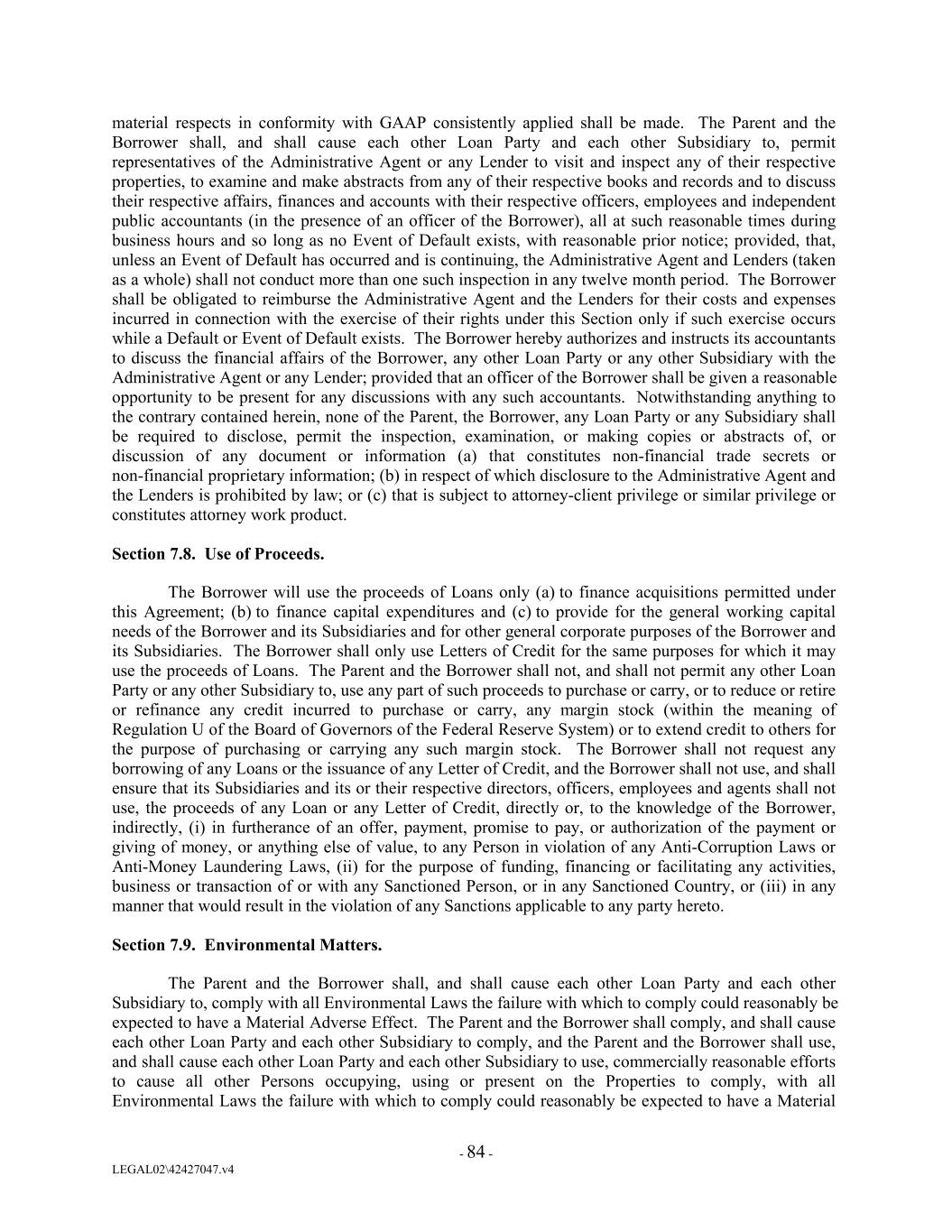 material respects in conformity with GAAP consistently applied shall be made. The Parent and the Borrower shall, and shall cause each other Loan Party and each other Subsidiary to, permit representatives of the Administrative Agent or any Lender to visit and inspect any of their respective properties, to examine and make abstracts from any of their respective books and records and to discuss their respective affairs, finances and accounts with their respective officers, employees and independent public accountants (in the presence of an officer of the Borrower), all at such reasonable times during business hours and so long as no Event of Default exists, with reasonable prior notice; provided, that, unless an Event of Default has occurred and is continuing, the Administrative Agent and Lenders (taken as a whole) shall not conduct more than one such inspection in any twelve month period. The Borrower shall be obligated to reimburse the Administrative Agent and the Lenders for their costs and expenses incurred in connection with the exercise of their rights under this Section only if such exercise occurs while a Default or Event of Default exists. The Borrower hereby authorizes and instructs its accountants to discuss the financial affairs of the Borrower, any other Loan Party or any other Subsidiary with the Administrative Agent or any Lender; provided that an officer of the Borrower shall be given a reasonable opportunity to be present for any discussions with any such accountants. Notwithstanding anything to the contrary contained herein, none of the Parent, the Borrower, any Loan Party or any Subsidiary shall be required to disclose, permit the inspection, examination, or making copies or abstracts of, or discussion of any document or information (a) that constitutes non-financial trade secrets or non-financial proprietary information; (b) in respect of which disclosure to the Administrative Agent and the Lenders is prohibited by law; or (c) that is subject to attorney-client privilege or similar privilege or constitutes attorney work product. Section 7.8. Use of Proceeds. The Borrower will use the proceeds of Loans only (a) to finance acquisitions permitted under this Agreement; (b) to finance capital expenditures and (c) to provide for the general working capital needs of the Borrower and its Subsidiaries and for other general corporate purposes of the Borrower and its Subsidiaries. The Borrower shall only use Letters of Credit for the same purposes for which it may use the proceeds of Loans. The Parent and the Borrower shall not, and shall not permit any other Loan Party or any other Subsidiary to, use any part of such proceeds to purchase or carry, or to reduce or retire or refinance any credit incurred to purchase or carry, any margin stock (within the meaning of Regulation U of the Board of Governors of the Federal Reserve System) or to extend credit to others for the purpose of purchasing or carrying any such margin stock. The Borrower shall not request any borrowing of any Loans or the issuance of any Letter of Credit, and the Borrower shall not use, and shall ensure that its Subsidiaries and its or their respective directors, officers, employees and agents shall not use, the proceeds of any Loan or any Letter of Credit, directly or, to the knowledge of the Borrower, indirectly, (i) in furtherance of an offer, payment, promise to pay, or authorization of the payment or giving of money, or anything else of value, to any Person in violation of any Anti-Corruption Laws or Anti-Money Laundering Laws, (ii) for the purpose of funding, financing or facilitating any activities, business or transaction of or with any Sanctioned Person, or in any Sanctioned Country, or (iii) in any manner that would result in the violation of any Sanctions applicable to any party hereto. Section 7.9. Environmental Matters. The Parent and the Borrower shall, and shall cause each other Loan Party and each other Subsidiary to, comply with all Environmental Laws the failure with which to comply could reasonably be expected to have a Material Adverse Effect. The Parent and the Borrower shall comply, and shall cause each other Loan Party and each other Subsidiary to comply, and the Parent and the Borrower shall use, and shall cause each other Loan Party and each other Subsidiary to use, commercially reasonable efforts to cause all other Persons occupying, using or present on the Properties to comply, with all Environmental Laws the failure with which to comply could reasonably be expected to have a Material - 84 - LEGAL02\42427047.v4
