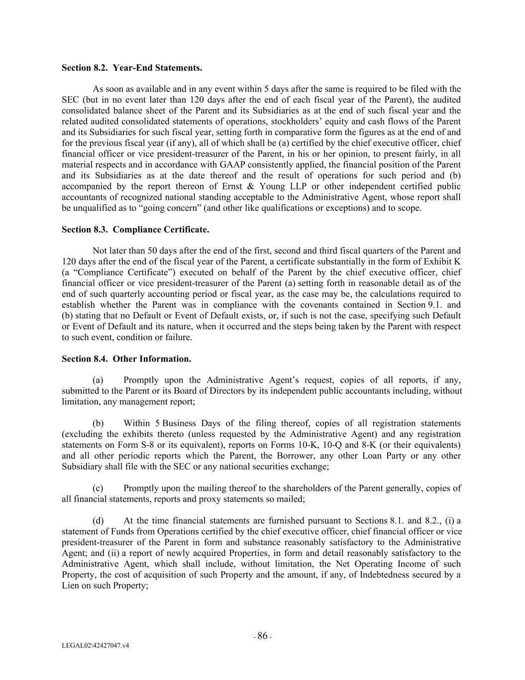 Section 8.2. Year-End Statements. As soon as available and in any event within 5 days after the same is required to be filed with the SEC (but in no event later than 120 days after the end of each fiscal year of the Parent), the audited consolidated balance sheet of the Parent and its Subsidiaries as at the end of such fiscal year and the related audited consolidated statements of operations, stockholders’ equity and cash flows of the Parent and its Subsidiaries for such fiscal year, setting forth in comparative form the figures as at the end of and for the previous fiscal year (if any), all of which shall be (a) certified by the chief executive officer, chief financial officer or vice president-treasurer of the Parent, in his or her opinion, to present fairly, in all material respects and in accordance with GAAP consistently applied, the financial position of the Parent and its Subsidiaries as at the date thereof and the result of operations for such period and (b) accompanied by the report thereon of Ernst & Young LLP or other independent certified public accountants of recognized national standing acceptable to the Administrative Agent, whose report shall be unqualified as to “going concern” (and other like qualifications or exceptions) and to scope. Section 8.3. Compliance Certificate. Not later than 50 days after the end of the first, second and third fiscal quarters of the Parent and 120 days after the end of the fiscal year of the Parent, a certificate substantially in the form of Exhibit K (a “Compliance Certificate”) executed on behalf of the Parent by the chief executive officer, chief financial officer or vice president-treasurer of the Parent (a) setting forth in reasonable detail as of the end of such quarterly accounting period or fiscal year, as the case may be, the calculations required to establish whether the Parent was in compliance with the covenants contained in Section 9.1. and (b) stating that no Default or Event of Default exists, or, if such is not the case, specifying such Default or Event of Default and its nature, when it occurred and the steps being taken by the Parent with respect to such event, condition or failure. Section 8.4. Other Information. (a) Promptly upon the Administrative Agent’s request, copies of all reports, if any, submitted to the Parent or its Board of Directors by its independent public accountants including, without limitation, any management report; (b) Within 5 Business Days of the filing thereof, copies of all registration statements (excluding the exhibits thereto (unless requested by the Administrative Agent) and any registration statements on Form S-8 or its equivalent), reports on Forms 10-K, 10-Q and 8-K (or their equivalents) and all other periodic reports which the Parent, the Borrower, any other Loan Party or any other Subsidiary shall file with the SEC or any national securities exchange; (c) Promptly upon the mailing thereof to the shareholders of the Parent generally, copies of all financial statements, reports and proxy statements so mailed; (d) At the time financial statements are furnished pursuant to Sections 8.1. and 8.2., (i) a statement of Funds from Operations certified by the chief executive officer, chief financial officer or vice president-treasurer of the Parent in form and substance reasonably satisfactory to the Administrative Agent; and (ii) a report of newly acquired Properties, in form and detail reasonably satisfactory to the Administrative Agent, which shall include, without limitation, the Net Operating Income of such Property, the cost of acquisition of such Property and the amount, if any, of Indebtedness secured by a Lien on such Property; - 86 - LEGAL02\42427047.v4