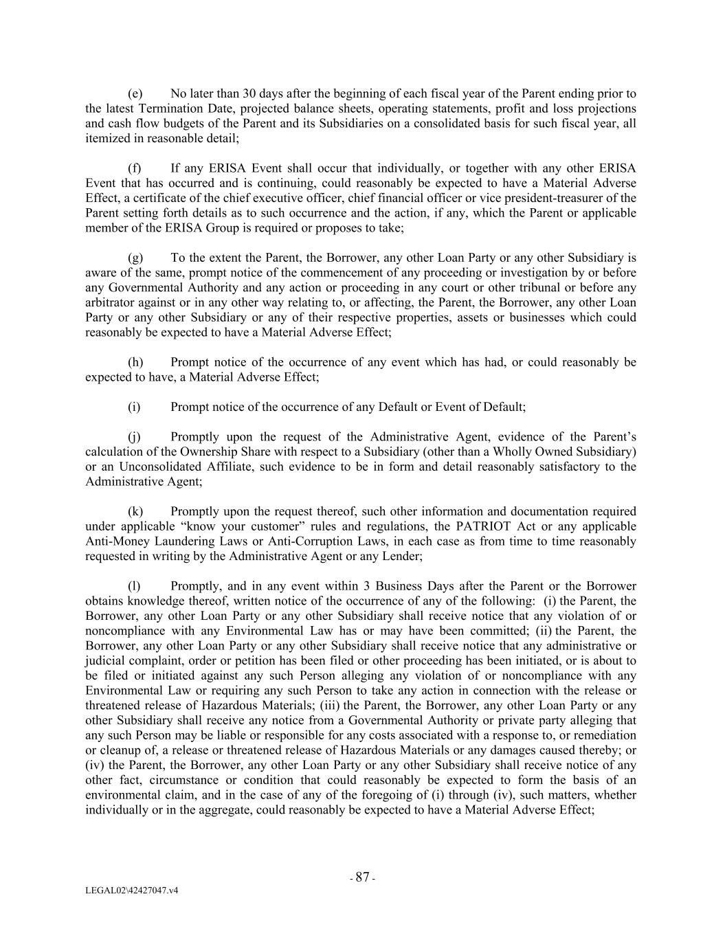 (e) No later than 30 days after the beginning of each fiscal year of the Parent ending prior to the latest Termination Date, projected balance sheets, operating statements, profit and loss projections and cash flow budgets of the Parent and its Subsidiaries on a consolidated basis for such fiscal year, all itemized in reasonable detail; (f) If any ERISA Event shall occur that individually, or together with any other ERISA Event that has occurred and is continuing, could reasonably be expected to have a Material Adverse Effect, a certificate of the chief executive officer, chief financial officer or vice president-treasurer of the Parent setting forth details as to such occurrence and the action, if any, which the Parent or applicable member of the ERISA Group is required or proposes to take; (g) To the extent the Parent, the Borrower, any other Loan Party or any other Subsidiary is aware of the same, prompt notice of the commencement of any proceeding or investigation by or before any Governmental Authority and any action or proceeding in any court or other tribunal or before any arbitrator against or in any other way relating to, or affecting, the Parent, the Borrower, any other Loan Party or any other Subsidiary or any of their respective properties, assets or businesses which could reasonably be expected to have a Material Adverse Effect; (h) Prompt notice of the occurrence of any event which has had, or could reasonably be expected to have, a Material Adverse Effect; (i) Prompt notice of the occurrence of any Default or Event of Default; (j) Promptly upon the request of the Administrative Agent, evidence of the Parent’s calculation of the Ownership Share with respect to a Subsidiary (other than a Wholly Owned Subsidiary) or an Unconsolidated Affiliate, such evidence to be in form and detail reasonably satisfactory to the Administrative Agent; (k) Promptly upon the request thereof, such other information and documentation required under applicable “know your customer” rules and regulations, the PATRIOT Act or any applicable Anti-Money Laundering Laws or Anti-Corruption Laws, in each case as from time to time reasonably requested in writing by the Administrative Agent or any Lender; (l) Promptly, and in any event within 3 Business Days after the Parent or the Borrower obtains knowledge thereof, written notice of the occurrence of any of the following: (i) the Parent, the Borrower, any other Loan Party or any other Subsidiary shall receive notice that any violation of or noncompliance with any Environmental Law has or may have been committed; (ii) the Parent, the Borrower, any other Loan Party or any other Subsidiary shall receive notice that any administrative or judicial complaint, order or petition has been filed or other proceeding has been initiated, or is about to be filed or initiated against any such Person alleging any violation of or noncompliance with any Environmental Law or requiring any such Person to take any action in connection with the release or threatened release of Hazardous Materials; (iii) the Parent, the Borrower, any other Loan Party or any other Subsidiary shall receive any notice from a Governmental Authority or private party alleging that any such Person may be liable or responsible for any costs associated with a response to, or remediation or cleanup of, a release or threatened release of Hazardous Materials or any damages caused thereby; or (iv) the Parent, the Borrower, any other Loan Party or any other Subsidiary shall receive notice of any other fact, circumstance or condition that could reasonably be expected to form the basis of an environmental claim, and in the case of any of the foregoing of (i) through (iv), such matters, whether individually or in the aggregate, could reasonably be expected to have a Material Adverse Effect; - 87 - LEGAL02\42427047.v4