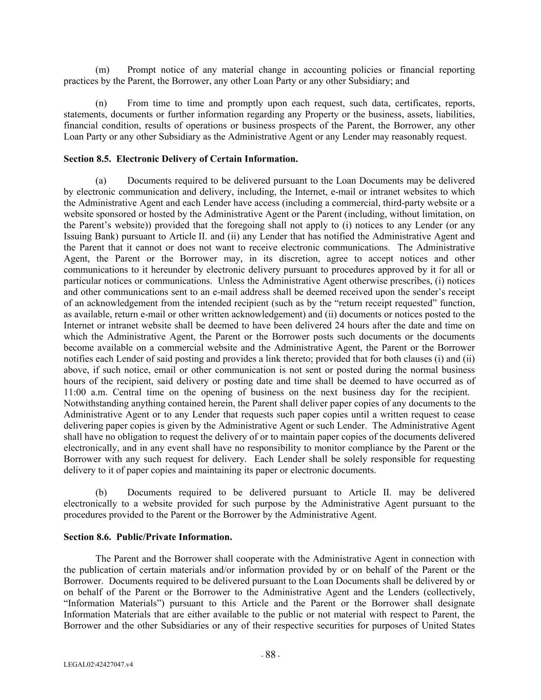 (m) Prompt notice of any material change in accounting policies or financial reporting practices by the Parent, the Borrower, any other Loan Party or any other Subsidiary; and (n) From time to time and promptly upon each request, such data, certificates, reports, statements, documents or further information regarding any Property or the business, assets, liabilities, financial condition, results of operations or business prospects of the Parent, the Borrower, any other Loan Party or any other Subsidiary as the Administrative Agent or any Lender may reasonably request. Section 8.5. Electronic Delivery of Certain Information. (a) Documents required to be delivered pursuant to the Loan Documents may be delivered by electronic communication and delivery, including, the Internet, e-mail or intranet websites to which the Administrative Agent and each Lender have access (including a commercial, third-party website or a website sponsored or hosted by the Administrative Agent or the Parent (including, without limitation, on the Parent’s website)) provided that the foregoing shall not apply to (i) notices to any Lender (or any Issuing Bank) pursuant to Article II. and (ii) any Lender that has notified the Administrative Agent and the Parent that it cannot or does not want to receive electronic communications. The Administrative Agent, the Parent or the Borrower may, in its discretion, agree to accept notices and other communications to it hereunder by electronic delivery pursuant to procedures approved by it for all or particular notices or communications. Unless the Administrative Agent otherwise prescribes, (i) notices and other communications sent to an e-mail address shall be deemed received upon the sender’s receipt of an acknowledgement from the intended recipient (such as by the “return receipt requested” function, as available, return e-mail or other written acknowledgement) and (ii) documents or notices posted to the Internet or intranet website shall be deemed to have been delivered 24 hours after the date and time on which the Administrative Agent, the Parent or the Borrower posts such documents or the documents become available on a commercial website and the Administrative Agent, the Parent or the Borrower notifies each Lender of said posting and provides a link thereto; provided that for both clauses (i) and (ii) above, if such notice, email or other communication is not sent or posted during the normal business hours of the recipient, said delivery or posting date and time shall be deemed to have occurred as of 11:00 a.m. Central time on the opening of business on the next business day for the recipient. Notwithstanding anything contained herein, the Parent shall deliver paper copies of any documents to the Administrative Agent or to any Lender that requests such paper copies until a written request to cease delivering paper copies is given by the Administrative Agent or such Lender. The Administrative Agent shall have no obligation to request the delivery of or to maintain paper copies of the documents delivered electronically, and in any event shall have no responsibility to monitor compliance by the Parent or the Borrower with any such request for delivery. Each Lender shall be solely responsible for requesting delivery to it of paper copies and maintaining its paper or electronic documents. (b) Documents required to be delivered pursuant to Article II. may be delivered electronically to a website provided for such purpose by the Administrative Agent pursuant to the procedures provided to the Parent or the Borrower by the Administrative Agent. Section 8.6. Public/Private Information. The Parent and the Borrower shall cooperate with the Administrative Agent in connection with the publication of certain materials and/or information provided by or on behalf of the Parent or the Borrower. Documents required to be delivered pursuant to the Loan Documents shall be delivered by or on behalf of the Parent or the Borrower to the Administrative Agent and the Lenders (collectively, “Information Materials”) pursuant to this Article and the Parent or the Borrower shall designate Information Materials that are either available to the public or not material with respect to Parent, the Borrower and the other Subsidiaries or any of their respective securities for purposes of United States - 88 - LEGAL02\42427047.v4