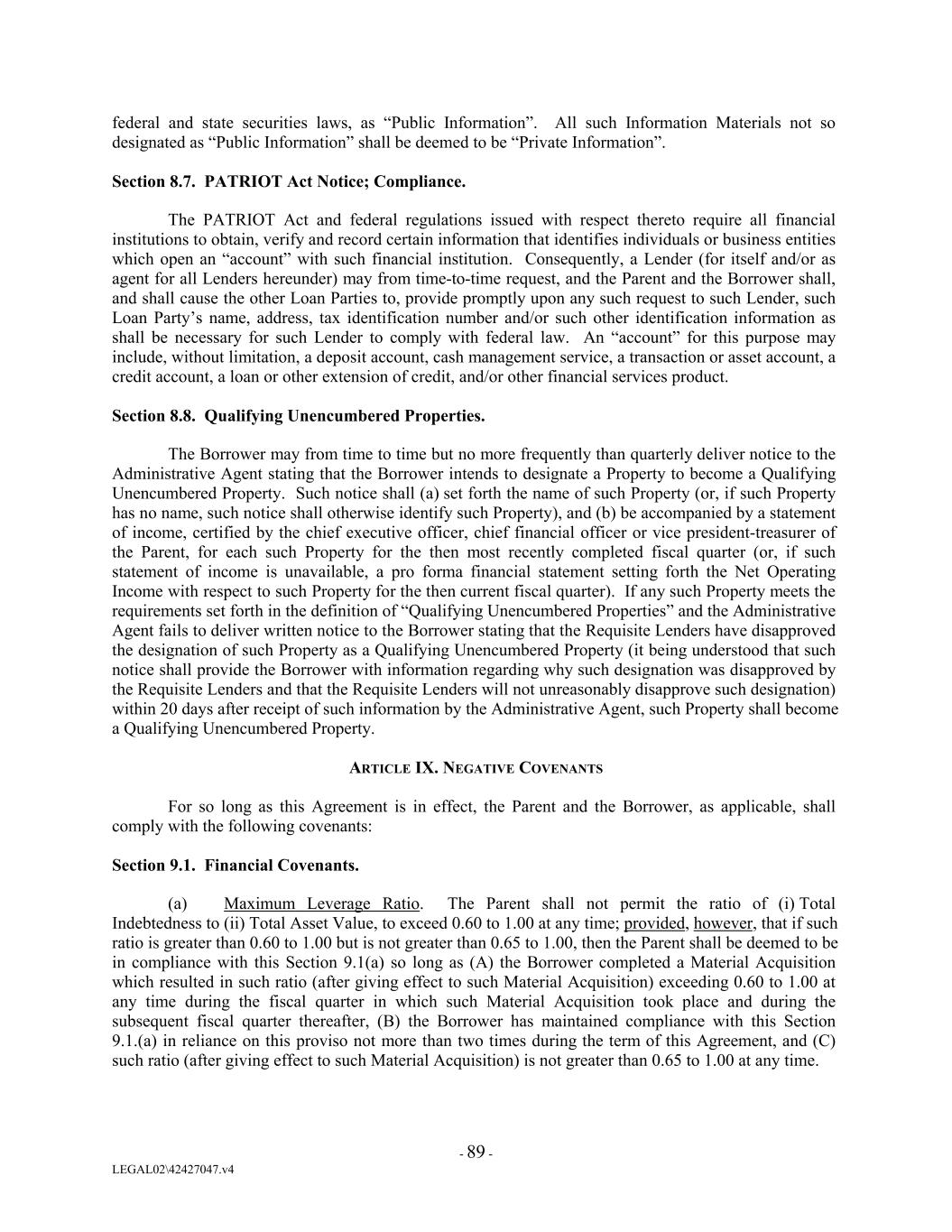 federal and state securities laws, as “Public Information”. All such Information Materials not so designated as “Public Information” shall be deemed to be “Private Information”. Section 8.7. PATRIOT Act Notice; Compliance. The PATRIOT Act and federal regulations issued with respect thereto require all financial institutions to obtain, verify and record certain information that identifies individuals or business entities which open an “account” with such financial institution. Consequently, a Lender (for itself and/or as agent for all Lenders hereunder) may from time-to-time request, and the Parent and the Borrower shall, and shall cause the other Loan Parties to, provide promptly upon any such request to such Lender, such Loan Party’s name, address, tax identification number and/or such other identification information as shall be necessary for such Lender to comply with federal law. An “account” for this purpose may include, without limitation, a deposit account, cash management service, a transaction or asset account, a credit account, a loan or other extension of credit, and/or other financial services product. Section 8.8. Qualifying Unencumbered Properties. The Borrower may from time to time but no more frequently than quarterly deliver notice to the Administrative Agent stating that the Borrower intends to designate a Property to become a Qualifying Unencumbered Property. Such notice shall (a) set forth the name of such Property (or, if such Property has no name, such notice shall otherwise identify such Property), and (b) be accompanied by a statement of income, certified by the chief executive officer, chief financial officer or vice president-treasurer of the Parent, for each such Property for the then most recently completed fiscal quarter (or, if such statement of income is unavailable, a pro forma financial statement setting forth the Net Operating Income with respect to such Property for the then current fiscal quarter). If any such Property meets the requirements set forth in the definition of “Qualifying Unencumbered Properties” and the Administrative Agent fails to deliver written notice to the Borrower stating that the Requisite Lenders have disapproved the designation of such Property as a Qualifying Unencumbered Property (it being understood that such notice shall provide the Borrower with information regarding why such designation was disapproved by the Requisite Lenders and that the Requisite Lenders will not unreasonably disapprove such designation) within 20 days after receipt of such information by the Administrative Agent, such Property shall become a Qualifying Unencumbered Property. ARTICLE IX. NEGATIVE COVENANTS For so long as this Agreement is in effect, the Parent and the Borrower, as applicable, shall comply with the following covenants: Section 9.1. Financial Covenants. (a) Maximum Leverage Ratio. The Parent shall not permit the ratio of (i) Total Indebtedness to (ii) Total Asset Value, to exceed 0.60 to 1.00 at any time; provided, however, that if such ratio is greater than 0.60 to 1.00 but is not greater than 0.65 to 1.00, then the Parent shall be deemed to be in compliance with this Section 9.1(a) so long as (A) the Borrower completed a Material Acquisition which resulted in such ratio (after giving effect to such Material Acquisition) exceeding 0.60 to 1.00 at any time during the fiscal quarter in which such Material Acquisition took place and during the subsequent fiscal quarter thereafter, (B) the Borrower has maintained compliance with this Section 9.1.(a) in reliance on this proviso not more than two times during the term of this Agreement, and (C) such ratio (after giving effect to such Material Acquisition) is not greater than 0.65 to 1.00 at any time. - 89 - LEGAL02\42427047.v4