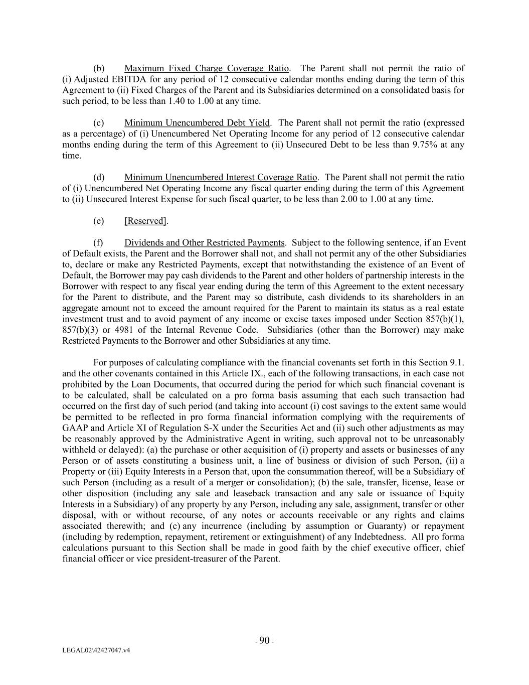 (b) Maximum Fixed Charge Coverage Ratio. The Parent shall not permit the ratio of (i) Adjusted EBITDA for any period of 12 consecutive calendar months ending during the term of this Agreement to (ii) Fixed Charges of the Parent and its Subsidiaries determined on a consolidated basis for such period, to be less than 1.40 to 1.00 at any time. (c) Minimum Unencumbered Debt Yield. The Parent shall not permit the ratio (expressed as a percentage) of (i) Unencumbered Net Operating Income for any period of 12 consecutive calendar months ending during the term of this Agreement to (ii) Unsecured Debt to be less than 9.75% at any time. (d) Minimum Unencumbered Interest Coverage Ratio. The Parent shall not permit the ratio of (i) Unencumbered Net Operating Income any fiscal quarter ending during the term of this Agreement to (ii) Unsecured Interest Expense for such fiscal quarter, to be less than 2.00 to 1.00 at any time. (e) [Reserved]. (f) Dividends and Other Restricted Payments. Subject to the following sentence, if an Event of Default exists, the Parent and the Borrower shall not, and shall not permit any of the other Subsidiaries to, declare or make any Restricted Payments, except that notwithstanding the existence of an Event of Default, the Borrower may pay cash dividends to the Parent and other holders of partnership interests in the Borrower with respect to any fiscal year ending during the term of this Agreement to the extent necessary for the Parent to distribute, and the Parent may so distribute, cash dividends to its shareholders in an aggregate amount not to exceed the amount required for the Parent to maintain its status as a real estate investment trust and to avoid payment of any income or excise taxes imposed under Section 857(b)(1), 857(b)(3) or 4981 of the Internal Revenue Code. Subsidiaries (other than the Borrower) may make Restricted Payments to the Borrower and other Subsidiaries at any time. For purposes of calculating compliance with the financial covenants set forth in this Section 9.1. and the other covenants contained in this Article IX., each of the following transactions, in each case not prohibited by the Loan Documents, that occurred during the period for which such financial covenant is to be calculated, shall be calculated on a pro forma basis assuming that each such transaction had occurred on the first day of such period (and taking into account (i) cost savings to the extent same would be permitted to be reflected in pro forma financial information complying with the requirements of GAAP and Article XI of Regulation S-X under the Securities Act and (ii) such other adjustments as may be reasonably approved by the Administrative Agent in writing, such approval not to be unreasonably withheld or delayed): (a) the purchase or other acquisition of (i) property and assets or businesses of any Person or of assets constituting a business unit, a line of business or division of such Person, (ii) a Property or (iii) Equity Interests in a Person that, upon the consummation thereof, will be a Subsidiary of such Person (including as a result of a merger or consolidation); (b) the sale, transfer, license, lease or other disposition (including any sale and leaseback transaction and any sale or issuance of Equity Interests in a Subsidiary) of any property by any Person, including any sale, assignment, transfer or other disposal, with or without recourse, of any notes or accounts receivable or any rights and claims associated therewith; and (c) any incurrence (including by assumption or Guaranty) or repayment (including by redemption, repayment, retirement or extinguishment) of any Indebtedness. All pro forma calculations pursuant to this Section shall be made in good faith by the chief executive officer, chief financial officer or vice president-treasurer of the Parent. - 90 - LEGAL02\42427047.v4
