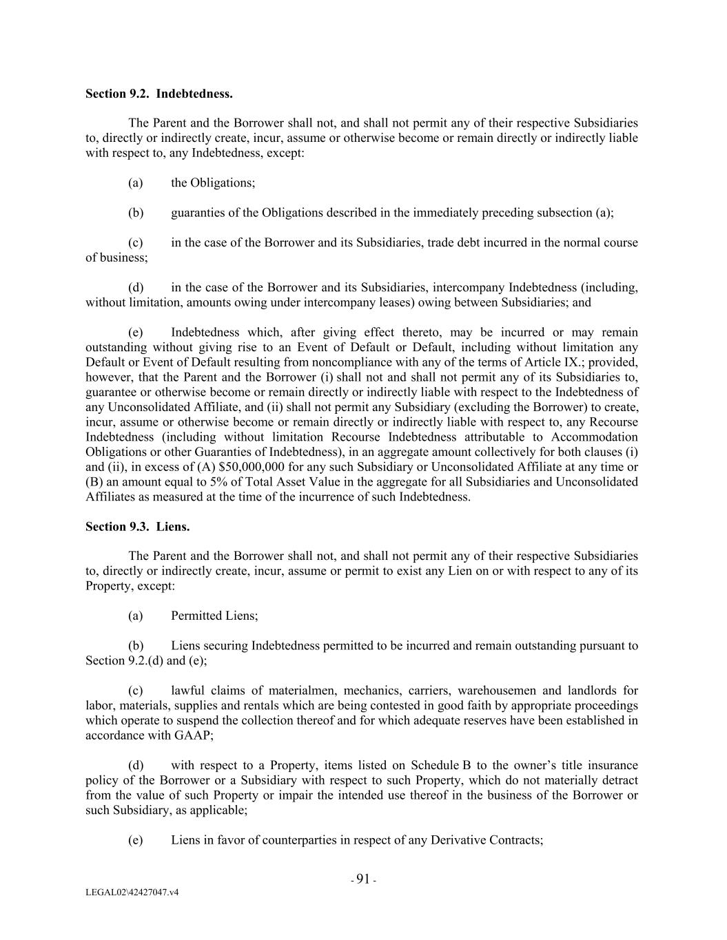 Section 9.2. Indebtedness. The Parent and the Borrower shall not, and shall not permit any of their respective Subsidiaries to, directly or indirectly create, incur, assume or otherwise become or remain directly or indirectly liable with respect to, any Indebtedness, except: (a) the Obligations; (b) guaranties of the Obligations described in the immediately preceding subsection (a); (c) in the case of the Borrower and its Subsidiaries, trade debt incurred in the normal course of business; (d) in the case of the Borrower and its Subsidiaries, intercompany Indebtedness (including, without limitation, amounts owing under intercompany leases) owing between Subsidiaries; and (e) Indebtedness which, after giving effect thereto, may be incurred or may remain outstanding without giving rise to an Event of Default or Default, including without limitation any Default or Event of Default resulting from noncompliance with any of the terms of Article IX.; provided, however, that the Parent and the Borrower (i) shall not and shall not permit any of its Subsidiaries to, guarantee or otherwise become or remain directly or indirectly liable with respect to the Indebtedness of any Unconsolidated Affiliate, and (ii) shall not permit any Subsidiary (excluding the Borrower) to create, incur, assume or otherwise become or remain directly or indirectly liable with respect to, any Recourse Indebtedness (including without limitation Recourse Indebtedness attributable to Accommodation Obligations or other Guaranties of Indebtedness), in an aggregate amount collectively for both clauses (i) and (ii), in excess of (A) $50,000,000 for any such Subsidiary or Unconsolidated Affiliate at any time or (B) an amount equal to 5% of Total Asset Value in the aggregate for all Subsidiaries and Unconsolidated Affiliates as measured at the time of the incurrence of such Indebtedness. Section 9.3. Liens. The Parent and the Borrower shall not, and shall not permit any of their respective Subsidiaries to, directly or indirectly create, incur, assume or permit to exist any Lien on or with respect to any of its Property, except: (a) Permitted Liens; (b) Liens securing Indebtedness permitted to be incurred and remain outstanding pursuant to Section 9.2.(d) and (e); (c) lawful claims of materialmen, mechanics, carriers, warehousemen and landlords for labor, materials, supplies and rentals which are being contested in good faith by appropriate proceedings which operate to suspend the collection thereof and for which adequate reserves have been established in accordance with GAAP; (d) with respect to a Property, items listed on Schedule B to the owner’s title insurance policy of the Borrower or a Subsidiary with respect to such Property, which do not materially detract from the value of such Property or impair the intended use thereof in the business of the Borrower or such Subsidiary, as applicable; (e) Liens in favor of counterparties in respect of any Derivative Contracts; - 91 - LEGAL02\42427047.v4