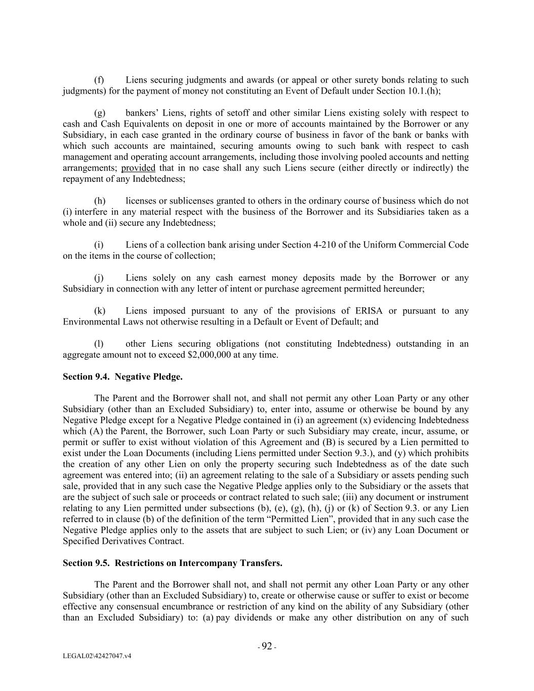 (f) Liens securing judgments and awards (or appeal or other surety bonds relating to such judgments) for the payment of money not constituting an Event of Default under Section 10.1.(h); (g) bankers’ Liens, rights of setoff and other similar Liens existing solely with respect to cash and Cash Equivalents on deposit in one or more of accounts maintained by the Borrower or any Subsidiary, in each case granted in the ordinary course of business in favor of the bank or banks with which such accounts are maintained, securing amounts owing to such bank with respect to cash management and operating account arrangements, including those involving pooled accounts and netting arrangements; provided that in no case shall any such Liens secure (either directly or indirectly) the repayment of any Indebtedness; (h) licenses or sublicenses granted to others in the ordinary course of business which do not (i) interfere in any material respect with the business of the Borrower and its Subsidiaries taken as a whole and (ii) secure any Indebtedness; (i) Liens of a collection bank arising under Section 4-210 of the Uniform Commercial Code on the items in the course of collection; (j) Liens solely on any cash earnest money deposits made by the Borrower or any Subsidiary in connection with any letter of intent or purchase agreement permitted hereunder; (k) Liens imposed pursuant to any of the provisions of ERISA or pursuant to any Environmental Laws not otherwise resulting in a Default or Event of Default; and (l) other Liens securing obligations (not constituting Indebtedness) outstanding in an aggregate amount not to exceed $2,000,000 at any time. Section 9.4. Negative Pledge. The Parent and the Borrower shall not, and shall not permit any other Loan Party or any other Subsidiary (other than an Excluded Subsidiary) to, enter into, assume or otherwise be bound by any Negative Pledge except for a Negative Pledge contained in (i) an agreement (x) evidencing Indebtedness which (A) the Parent, the Borrower, such Loan Party or such Subsidiary may create, incur, assume, or permit or suffer to exist without violation of this Agreement and (B) is secured by a Lien permitted to exist under the Loan Documents (including Liens permitted under Section 9.3.), and (y) which prohibits the creation of any other Lien on only the property securing such Indebtedness as of the date such agreement was entered into; (ii) an agreement relating to the sale of a Subsidiary or assets pending such sale, provided that in any such case the Negative Pledge applies only to the Subsidiary or the assets that are the subject of such sale or proceeds or contract related to such sale; (iii) any document or instrument relating to any Lien permitted under subsections (b), (e), (g), (h), (j) or (k) of Section 9.3. or any Lien referred to in clause (b) of the definition of the term “Permitted Lien”, provided that in any such case the Negative Pledge applies only to the assets that are subject to such Lien; or (iv) any Loan Document or Specified Derivatives Contract. Section 9.5. Restrictions on Intercompany Transfers. The Parent and the Borrower shall not, and shall not permit any other Loan Party or any other Subsidiary (other than an Excluded Subsidiary) to, create or otherwise cause or suffer to exist or become effective any consensual encumbrance or restriction of any kind on the ability of any Subsidiary (other than an Excluded Subsidiary) to: (a) pay dividends or make any other distribution on any of such - 92 - LEGAL02\42427047.v4