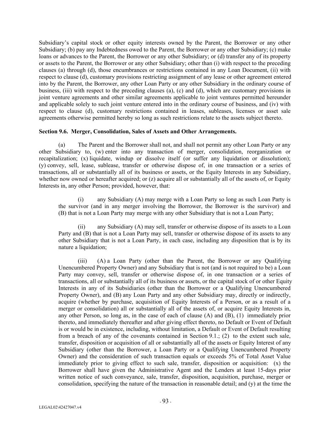 Subsidiary’s capital stock or other equity interests owned by the Parent, the Borrower or any other Subsidiary; (b) pay any Indebtedness owed to the Parent, the Borrower or any other Subsidiary; (c) make loans or advances to the Parent, the Borrower or any other Subsidiary; or (d) transfer any of its property or assets to the Parent, the Borrower or any other Subsidiary; other than (i) with respect to the preceding clauses (a) through (d), those encumbrances or restrictions contained in any Loan Document, (ii) with respect to clause (d), customary provisions restricting assignment of any lease or other agreement entered into by the Parent, the Borrower, any other Loan Party or any other Subsidiary in the ordinary course of business, (iii) with respect to the preceding clauses (a), (c) and (d), which are customary provisions in joint venture agreements and other similar agreements applicable to joint ventures permitted hereunder and applicable solely to such joint venture entered into in the ordinary course of business, and (iv) with respect to clause (d), customary restrictions contained in leases, subleases, licenses or asset sale agreements otherwise permitted hereby so long as such restrictions relate to the assets subject thereto. Section 9.6. Merger, Consolidation, Sales of Assets and Other Arrangements. (a) The Parent and the Borrower shall not, and shall not permit any other Loan Party or any other Subsidiary to, (w) enter into any transaction of merger, consolidation, reorganization or recapitalization; (x) liquidate, windup or dissolve itself (or suffer any liquidation or dissolution); (y) convey, sell, lease, sublease, transfer or otherwise dispose of, in one transaction or a series of transactions, all or substantially all of its business or assets, or the Equity Interests in any Subsidiary, whether now owned or hereafter acquired; or (z) acquire all or substantially all of the assets of, or Equity Interests in, any other Person; provided, however, that: (i) any Subsidiary (A) may merge with a Loan Party so long as such Loan Party is the survivor (and in any merger involving the Borrower, the Borrower is the survivor) and (B) that is not a Loan Party may merge with any other Subsidiary that is not a Loan Party; (ii) any Subsidiary (A) may sell, transfer or otherwise dispose of its assets to a Loan Party and (B) that is not a Loan Party may sell, transfer or otherwise dispose of its assets to any other Subsidiary that is not a Loan Party, in each case, including any disposition that is by its nature a liquidation; (iii) (A) a Loan Party (other than the Parent, the Borrower or any Qualifying Unencumbered Property Owner) and any Subsidiary that is not (and is not required to be) a Loan Party may convey, sell, transfer or otherwise dispose of, in one transaction or a series of transactions, all or substantially all of its business or assets, or the capital stock of or other Equity Interests in any of its Subsidiaries (other than the Borrower or a Qualifying Unencumbered Property Owner), and (B) any Loan Party and any other Subsidiary may, directly or indirectly, acquire (whether by purchase, acquisition of Equity Interests of a Person, or as a result of a merger or consolidation) all or substantially all of the assets of, or acquire Equity Interests in, any other Person, so long as, in the case of each of clause (A) and (B), (1) immediately prior thereto, and immediately thereafter and after giving effect thereto, no Default or Event of Default is or would be in existence, including, without limitation, a Default or Event of Default resulting from a breach of any of the covenants contained in Section 9.1.; (2) to the extent such sale, transfer, disposition or acquisition of all or substantially all of the assets or Equity Interest of any Subsidiary (other than the Borrower, a Loan Party or a Qualifying Unencumbered Property Owner) and the consideration of such transaction equals or exceeds 5% of Total Asset Value immediately prior to giving effect to such sale, transfer, disposition or acquisition: (x) the Borrower shall have given the Administrative Agent and the Lenders at least 15-days prior written notice of such conveyance, sale, transfer, disposition, acquisition, purchase, merger or consolidation, specifying the nature of the transaction in reasonable detail; and (y) at the time the - 93 - LEGAL02\42427047.v4