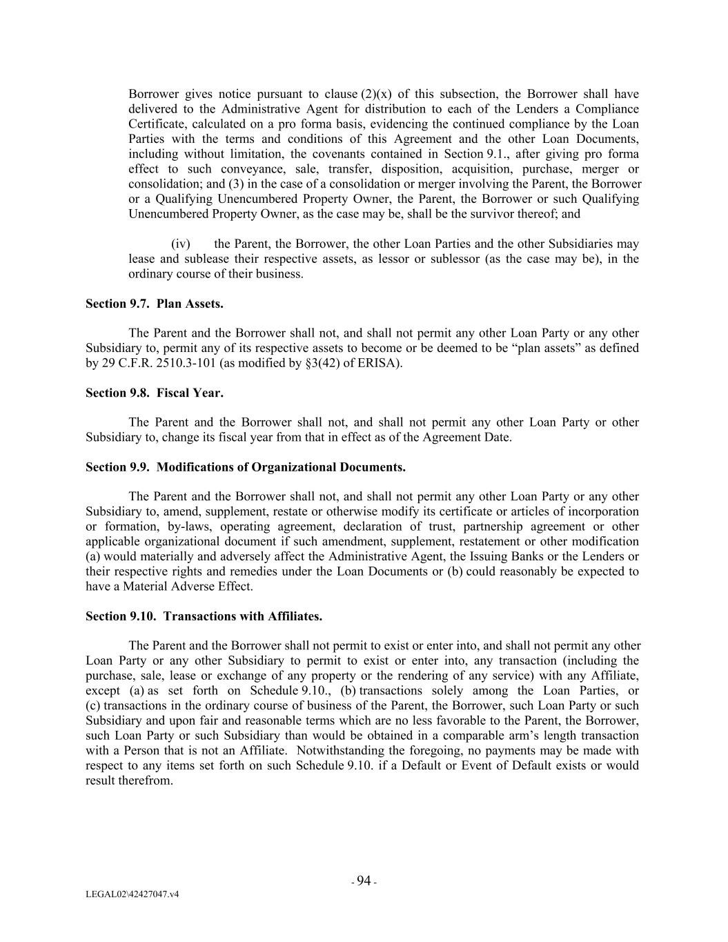 Borrower gives notice pursuant to clause (2)(x) of this subsection, the Borrower shall have delivered to the Administrative Agent for distribution to each of the Lenders a Compliance Certificate, calculated on a pro forma basis, evidencing the continued compliance by the Loan Parties with the terms and conditions of this Agreement and the other Loan Documents, including without limitation, the covenants contained in Section 9.1., after giving pro forma effect to such conveyance, sale, transfer, disposition, acquisition, purchase, merger or consolidation; and (3) in the case of a consolidation or merger involving the Parent, the Borrower or a Qualifying Unencumbered Property Owner, the Parent, the Borrower or such Qualifying Unencumbered Property Owner, as the case may be, shall be the survivor thereof; and (iv) the Parent, the Borrower, the other Loan Parties and the other Subsidiaries may lease and sublease their respective assets, as lessor or sublessor (as the case may be), in the ordinary course of their business. Section 9.7. Plan Assets. The Parent and the Borrower shall not, and shall not permit any other Loan Party or any other Subsidiary to, permit any of its respective assets to become or be deemed to be “plan assets” as defined by 29 C.F.R. 2510.3-101 (as modified by §3(42) of ERISA). Section 9.8. Fiscal Year. The Parent and the Borrower shall not, and shall not permit any other Loan Party or other Subsidiary to, change its fiscal year from that in effect as of the Agreement Date. Section 9.9. Modifications of Organizational Documents. The Parent and the Borrower shall not, and shall not permit any other Loan Party or any other Subsidiary to, amend, supplement, restate or otherwise modify its certificate or articles of incorporation or formation, by-laws, operating agreement, declaration of trust, partnership agreement or other applicable organizational document if such amendment, supplement, restatement or other modification (a) would materially and adversely affect the Administrative Agent, the Issuing Banks or the Lenders or their respective rights and remedies under the Loan Documents or (b) could reasonably be expected to have a Material Adverse Effect. Section 9.10. Transactions with Affiliates. The Parent and the Borrower shall not permit to exist or enter into, and shall not permit any other Loan Party or any other Subsidiary to permit to exist or enter into, any transaction (including the purchase, sale, lease or exchange of any property or the rendering of any service) with any Affiliate, except (a) as set forth on Schedule 9.10., (b) transactions solely among the Loan Parties, or (c) transactions in the ordinary course of business of the Parent, the Borrower, such Loan Party or such Subsidiary and upon fair and reasonable terms which are no less favorable to the Parent, the Borrower, such Loan Party or such Subsidiary than would be obtained in a comparable arm’s length transaction with a Person that is not an Affiliate. Notwithstanding the foregoing, no payments may be made with respect to any items set forth on such Schedule 9.10. if a Default or Event of Default exists or would result therefrom. - 94 - LEGAL02\42427047.v4