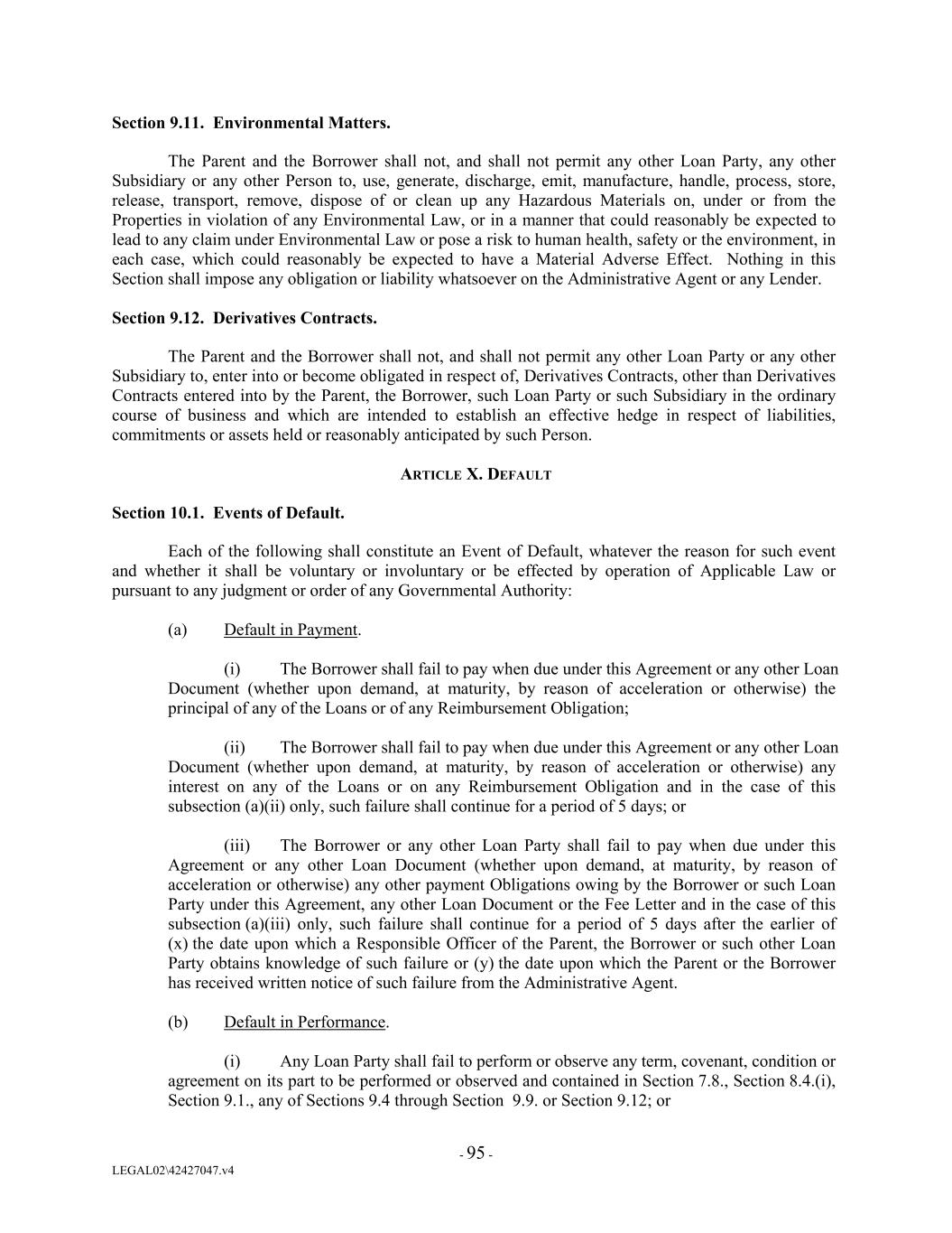 Section 9.11. Environmental Matters. The Parent and the Borrower shall not, and shall not permit any other Loan Party, any other Subsidiary or any other Person to, use, generate, discharge, emit, manufacture, handle, process, store, release, transport, remove, dispose of or clean up any Hazardous Materials on, under or from the Properties in violation of any Environmental Law, or in a manner that could reasonably be expected to lead to any claim under Environmental Law or pose a risk to human health, safety or the environment, in each case, which could reasonably be expected to have a Material Adverse Effect. Nothing in this Section shall impose any obligation or liability whatsoever on the Administrative Agent or any Lender. Section 9.12. Derivatives Contracts. The Parent and the Borrower shall not, and shall not permit any other Loan Party or any other Subsidiary to, enter into or become obligated in respect of, Derivatives Contracts, other than Derivatives Contracts entered into by the Parent, the Borrower, such Loan Party or such Subsidiary in the ordinary course of business and which are intended to establish an effective hedge in respect of liabilities, commitments or assets held or reasonably anticipated by such Person. ARTICLE X. DEFAULT Section 10.1. Events of Default. Each of the following shall constitute an Event of Default, whatever the reason for such event and whether it shall be voluntary or involuntary or be effected by operation of Applicable Law or pursuant to any judgment or order of any Governmental Authority: (a) Default in Payment. (i) The Borrower shall fail to pay when due under this Agreement or any other Loan Document (whether upon demand, at maturity, by reason of acceleration or otherwise) the principal of any of the Loans or of any Reimbursement Obligation; (ii) The Borrower shall fail to pay when due under this Agreement or any other Loan Document (whether upon demand, at maturity, by reason of acceleration or otherwise) any interest on any of the Loans or on any Reimbursement Obligation and in the case of this subsection (a)(ii) only, such failure shall continue for a period of 5 days; or (iii) The Borrower or any other Loan Party shall fail to pay when due under this Agreement or any other Loan Document (whether upon demand, at maturity, by reason of acceleration or otherwise) any other payment Obligations owing by the Borrower or such Loan Party under this Agreement, any other Loan Document or the Fee Letter and in the case of this subsection (a)(iii) only, such failure shall continue for a period of 5 days after the earlier of (x) the date upon which a Responsible Officer of the Parent, the Borrower or such other Loan Party obtains knowledge of such failure or (y) the date upon which the Parent or the Borrower has received written notice of such failure from the Administrative Agent. (b) Default in Performance. (i) Any Loan Party shall fail to perform or observe any term, covenant, condition or agreement on its part to be performed or observed and contained in Section 7.8., Section 8.4.(i), Section 9.1., any of Sections 9.4 through Section 9.9. or Section 9.12; or - 95 - LEGAL02\42427047.v4