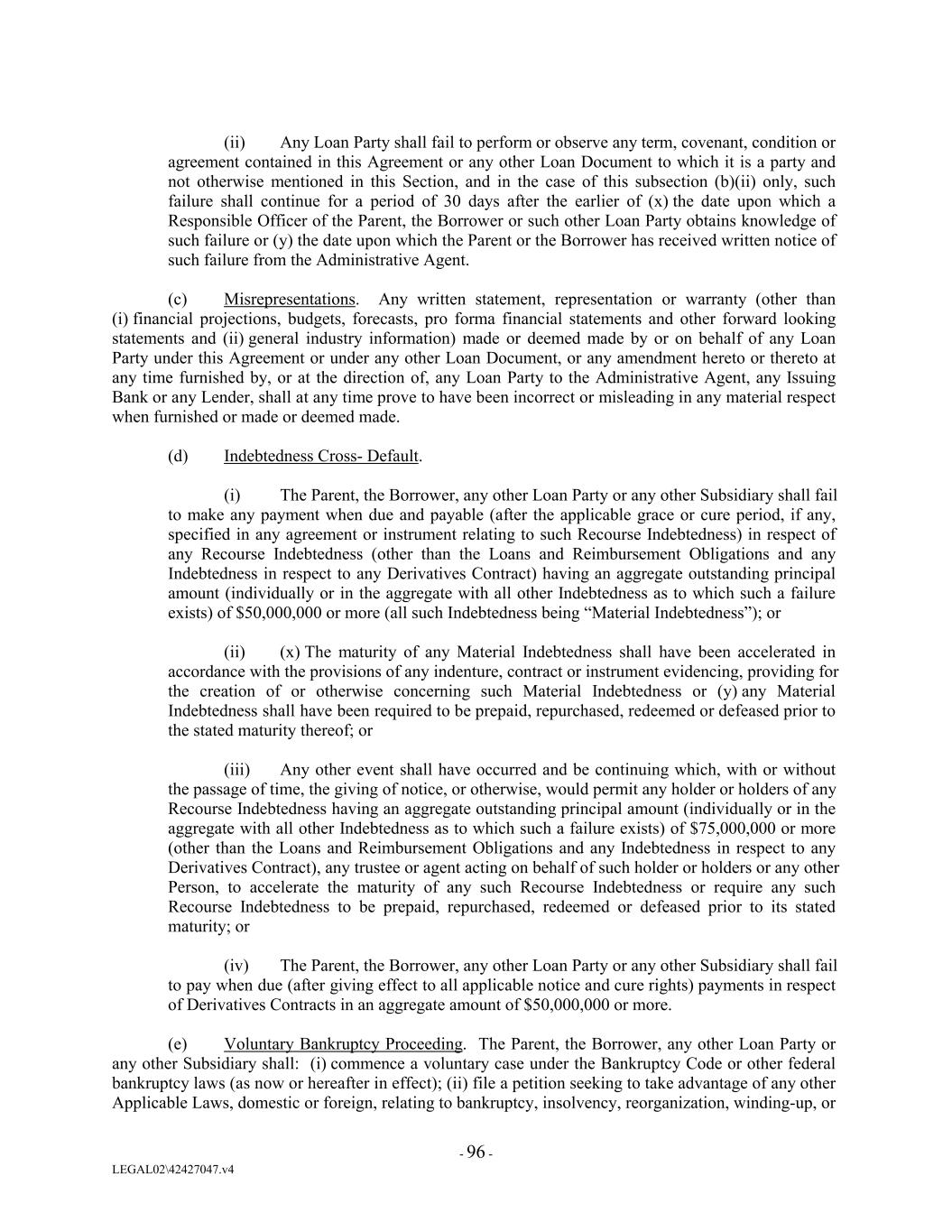 (ii) Any Loan Party shall fail to perform or observe any term, covenant, condition or agreement contained in this Agreement or any other Loan Document to which it is a party and not otherwise mentioned in this Section, and in the case of this subsection (b)(ii) only, such failure shall continue for a period of 30 days after the earlier of (x) the date upon which a Responsible Officer of the Parent, the Borrower or such other Loan Party obtains knowledge of such failure or (y) the date upon which the Parent or the Borrower has received written notice of such failure from the Administrative Agent. (c) Misrepresentations. Any written statement, representation or warranty (other than (i) financial projections, budgets, forecasts, pro forma financial statements and other forward looking statements and (ii) general industry information) made or deemed made by or on behalf of any Loan Party under this Agreement or under any other Loan Document, or any amendment hereto or thereto at any time furnished by, or at the direction of, any Loan Party to the Administrative Agent, any Issuing Bank or any Lender, shall at any time prove to have been incorrect or misleading in any material respect when furnished or made or deemed made. (d) Indebtedness Cross- Default. (i) The Parent, the Borrower, any other Loan Party or any other Subsidiary shall fail to make any payment when due and payable (after the applicable grace or cure period, if any, specified in any agreement or instrument relating to such Recourse Indebtedness) in respect of any Recourse Indebtedness (other than the Loans and Reimbursement Obligations and any Indebtedness in respect to any Derivatives Contract) having an aggregate outstanding principal amount (individually or in the aggregate with all other Indebtedness as to which such a failure exists) of $50,000,000 or more (all such Indebtedness being “Material Indebtedness”); or (ii) (x) The maturity of any Material Indebtedness shall have been accelerated in accordance with the provisions of any indenture, contract or instrument evidencing, providing for the creation of or otherwise concerning such Material Indebtedness or (y) any Material Indebtedness shall have been required to be prepaid, repurchased, redeemed or defeased prior to the stated maturity thereof; or (iii) Any other event shall have occurred and be continuing which, with or without the passage of time, the giving of notice, or otherwise, would permit any holder or holders of any Recourse Indebtedness having an aggregate outstanding principal amount (individually or in the aggregate with all other Indebtedness as to which such a failure exists) of $75,000,000 or more (other than the Loans and Reimbursement Obligations and any Indebtedness in respect to any Derivatives Contract), any trustee or agent acting on behalf of such holder or holders or any other Person, to accelerate the maturity of any such Recourse Indebtedness or require any such Recourse Indebtedness to be prepaid, repurchased, redeemed or defeased prior to its stated maturity; or (iv) The Parent, the Borrower, any other Loan Party or any other Subsidiary shall fail to pay when due (after giving effect to all applicable notice and cure rights) payments in respect of Derivatives Contracts in an aggregate amount of $50,000,000 or more. (e) Voluntary Bankruptcy Proceeding. The Parent, the Borrower, any other Loan Party or any other Subsidiary shall: (i) commence a voluntary case under the Bankruptcy Code or other federal bankruptcy laws (as now or hereafter in effect); (ii) file a petition seeking to take advantage of any other Applicable Laws, domestic or foreign, relating to bankruptcy, insolvency, reorganization, winding-up, or - 96 - LEGAL02\42427047.v4