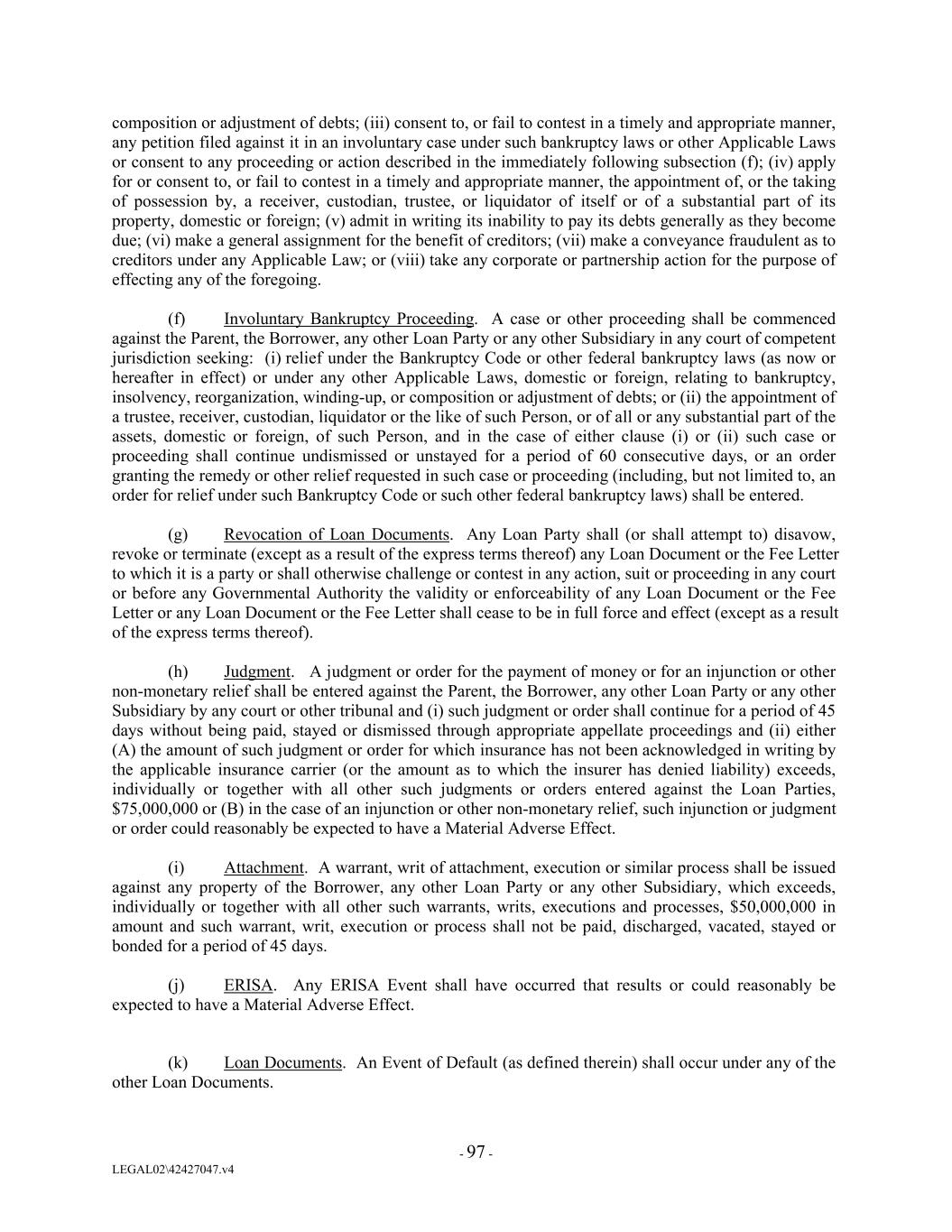composition or adjustment of debts; (iii) consent to, or fail to contest in a timely and appropriate manner, any petition filed against it in an involuntary case under such bankruptcy laws or other Applicable Laws or consent to any proceeding or action described in the immediately following subsection (f); (iv) apply for or consent to, or fail to contest in a timely and appropriate manner, the appointment of, or the taking of possession by, a receiver, custodian, trustee, or liquidator of itself or of a substantial part of its property, domestic or foreign; (v) admit in writing its inability to pay its debts generally as they become due; (vi) make a general assignment for the benefit of creditors; (vii) make a conveyance fraudulent as to creditors under any Applicable Law; or (viii) take any corporate or partnership action for the purpose of effecting any of the foregoing. (f) Involuntary Bankruptcy Proceeding. A case or other proceeding shall be commenced against the Parent, the Borrower, any other Loan Party or any other Subsidiary in any court of competent jurisdiction seeking: (i) relief under the Bankruptcy Code or other federal bankruptcy laws (as now or hereafter in effect) or under any other Applicable Laws, domestic or foreign, relating to bankruptcy, insolvency, reorganization, winding-up, or composition or adjustment of debts; or (ii) the appointment of a trustee, receiver, custodian, liquidator or the like of such Person, or of all or any substantial part of the assets, domestic or foreign, of such Person, and in the case of either clause (i) or (ii) such case or proceeding shall continue undismissed or unstayed for a period of 60 consecutive days, or an order granting the remedy or other relief requested in such case or proceeding (including, but not limited to, an order for relief under such Bankruptcy Code or such other federal bankruptcy laws) shall be entered. (g) Revocation of Loan Documents. Any Loan Party shall (or shall attempt to) disavow, revoke or terminate (except as a result of the express terms thereof) any Loan Document or the Fee Letter to which it is a party or shall otherwise challenge or contest in any action, suit or proceeding in any court or before any Governmental Authority the validity or enforceability of any Loan Document or the Fee Letter or any Loan Document or the Fee Letter shall cease to be in full force and effect (except as a result of the express terms thereof). (h) Judgment. A judgment or order for the payment of money or for an injunction or other non-monetary relief shall be entered against the Parent, the Borrower, any other Loan Party or any other Subsidiary by any court or other tribunal and (i) such judgment or order shall continue for a period of 45 days without being paid, stayed or dismissed through appropriate appellate proceedings and (ii) either (A) the amount of such judgment or order for which insurance has not been acknowledged in writing by the applicable insurance carrier (or the amount as to which the insurer has denied liability) exceeds, individually or together with all other such judgments or orders entered against the Loan Parties, $75,000,000 or (B) in the case of an injunction or other non-monetary relief, such injunction or judgment or order could reasonably be expected to have a Material Adverse Effect. (i) Attachment. A warrant, writ of attachment, execution or similar process shall be issued against any property of the Borrower, any other Loan Party or any other Subsidiary, which exceeds, individually or together with all other such warrants, writs, executions and processes, $50,000,000 in amount and such warrant, writ, execution or process shall not be paid, discharged, vacated, stayed or bonded for a period of 45 days. (j) ERISA. Any ERISA Event shall have occurred that results or could reasonably be expected to have a Material Adverse Effect. (k) Loan Documents. An Event of Default (as defined therein) shall occur under any of the other Loan Documents. - 97 - LEGAL02\42427047.v4