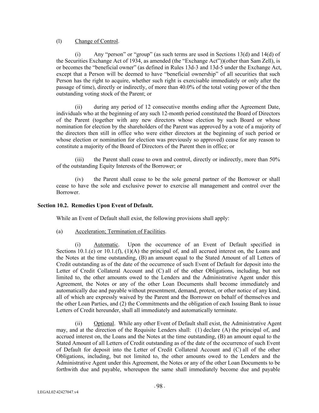 (l) Change of Control. (i) Any “person” or “group” (as such terms are used in Sections 13(d) and 14(d) of the Securities Exchange Act of 1934, as amended (the “Exchange Act”))(other than Sam Zell), is or becomes the “beneficial owner” (as defined in Rules 13d-3 and 13d-5 under the Exchange Act, except that a Person will be deemed to have “beneficial ownership” of all securities that such Person has the right to acquire, whether such right is exercisable immediately or only after the passage of time), directly or indirectly, of more than 40.0% of the total voting power of the then outstanding voting stock of the Parent; or (ii) during any period of 12 consecutive months ending after the Agreement Date, individuals who at the beginning of any such 12-month period constituted the Board of Directors of the Parent (together with any new directors whose election by such Board or whose nomination for election by the shareholders of the Parent was approved by a vote of a majority of the directors then still in office who were either directors at the beginning of such period or whose election or nomination for election was previously so approved) cease for any reason to constitute a majority of the Board of Directors of the Parent then in office; or (iii) the Parent shall cease to own and control, directly or indirectly, more than 50% of the outstanding Equity Interests of the Borrower; or (iv) the Parent shall cease to be the sole general partner of the Borrower or shall cease to have the sole and exclusive power to exercise all management and control over the Borrower. Section 10.2. Remedies Upon Event of Default. While an Event of Default shall exist, the following provisions shall apply: (a) Acceleration; Termination of Facilities. (i) Automatic. Upon the occurrence of an Event of Default specified in Sections 10.1.(e) or 10.1.(f), (1)(A) the principal of, and all accrued interest on, the Loans and the Notes at the time outstanding, (B) an amount equal to the Stated Amount of all Letters of Credit outstanding as of the date of the occurrence of such Event of Default for deposit into the Letter of Credit Collateral Account and (C) all of the other Obligations, including, but not limited to, the other amounts owed to the Lenders and the Administrative Agent under this Agreement, the Notes or any of the other Loan Documents shall become immediately and automatically due and payable without presentment, demand, protest, or other notice of any kind, all of which are expressly waived by the Parent and the Borrower on behalf of themselves and the other Loan Parties, and (2) the Commitments and the obligation of each Issuing Bank to issue Letters of Credit hereunder, shall all immediately and automatically terminate. (ii) Optional. While any other Event of Default shall exist, the Administrative Agent may, and at the direction of the Requisite Lenders shall: (1) declare (A) the principal of, and accrued interest on, the Loans and the Notes at the time outstanding, (B) an amount equal to the Stated Amount of all Letters of Credit outstanding as of the date of the occurrence of such Event of Default for deposit into the Letter of Credit Collateral Account and (C) all of the other Obligations, including, but not limited to, the other amounts owed to the Lenders and the Administrative Agent under this Agreement, the Notes or any of the other Loan Documents to be forthwith due and payable, whereupon the same shall immediately become due and payable - 98 - LEGAL02\42427047.v4