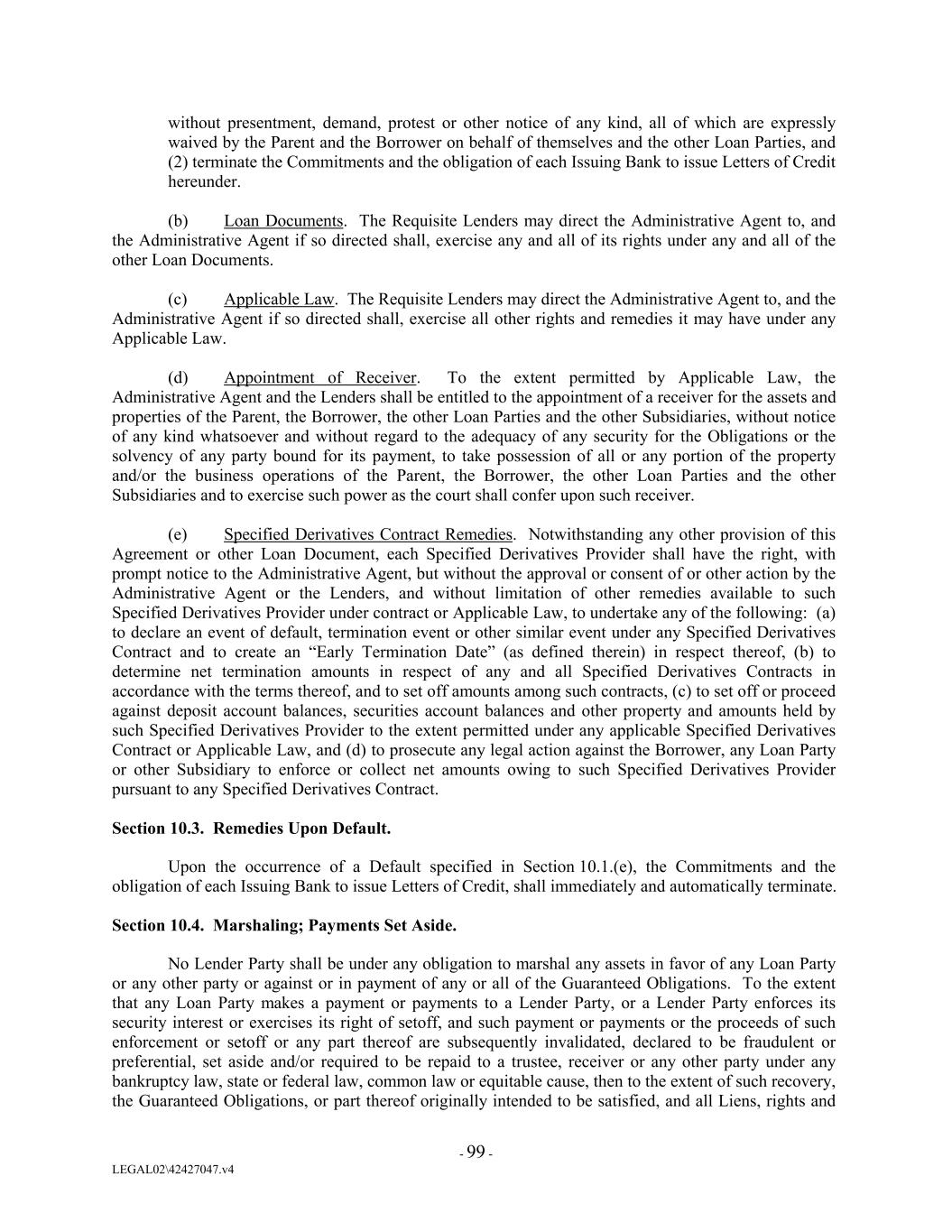 without presentment, demand, protest or other notice of any kind, all of which are expressly waived by the Parent and the Borrower on behalf of themselves and the other Loan Parties, and (2) terminate the Commitments and the obligation of each Issuing Bank to issue Letters of Credit hereunder. (b) Loan Documents. The Requisite Lenders may direct the Administrative Agent to, and the Administrative Agent if so directed shall, exercise any and all of its rights under any and all of the other Loan Documents. (c) Applicable Law. The Requisite Lenders may direct the Administrative Agent to, and the Administrative Agent if so directed shall, exercise all other rights and remedies it may have under any Applicable Law. (d) Appointment of Receiver. To the extent permitted by Applicable Law, the Administrative Agent and the Lenders shall be entitled to the appointment of a receiver for the assets and properties of the Parent, the Borrower, the other Loan Parties and the other Subsidiaries, without notice of any kind whatsoever and without regard to the adequacy of any security for the Obligations or the solvency of any party bound for its payment, to take possession of all or any portion of the property and/or the business operations of the Parent, the Borrower, the other Loan Parties and the other Subsidiaries and to exercise such power as the court shall confer upon such receiver. (e) Specified Derivatives Contract Remedies. Notwithstanding any other provision of this Agreement or other Loan Document, each Specified Derivatives Provider shall have the right, with prompt notice to the Administrative Agent, but without the approval or consent of or other action by the Administrative Agent or the Lenders, and without limitation of other remedies available to such Specified Derivatives Provider under contract or Applicable Law, to undertake any of the following: (a) to declare an event of default, termination event or other similar event under any Specified Derivatives Contract and to create an “Early Termination Date” (as defined therein) in respect thereof, (b) to determine net termination amounts in respect of any and all Specified Derivatives Contracts in accordance with the terms thereof, and to set off amounts among such contracts, (c) to set off or proceed against deposit account balances, securities account balances and other property and amounts held by such Specified Derivatives Provider to the extent permitted under any applicable Specified Derivatives Contract or Applicable Law, and (d) to prosecute any legal action against the Borrower, any Loan Party or other Subsidiary to enforce or collect net amounts owing to such Specified Derivatives Provider pursuant to any Specified Derivatives Contract. Section 10.3. Remedies Upon Default. Upon the occurrence of a Default specified in Section 10.1.(e), the Commitments and the obligation of each Issuing Bank to issue Letters of Credit, shall immediately and automatically terminate. Section 10.4. Marshaling; Payments Set Aside. No Lender Party shall be under any obligation to marshal any assets in favor of any Loan Party or any other party or against or in payment of any or all of the Guaranteed Obligations. To the extent that any Loan Party makes a payment or payments to a Lender Party, or a Lender Party enforces its security interest or exercises its right of setoff, and such payment or payments or the proceeds of such enforcement or setoff or any part thereof are subsequently invalidated, declared to be fraudulent or preferential, set aside and/or required to be repaid to a trustee, receiver or any other party under any bankruptcy law, state or federal law, common law or equitable cause, then to the extent of such recovery, the Guaranteed Obligations, or part thereof originally intended to be satisfied, and all Liens, rights and - 99 - LEGAL02\42427047.v4
