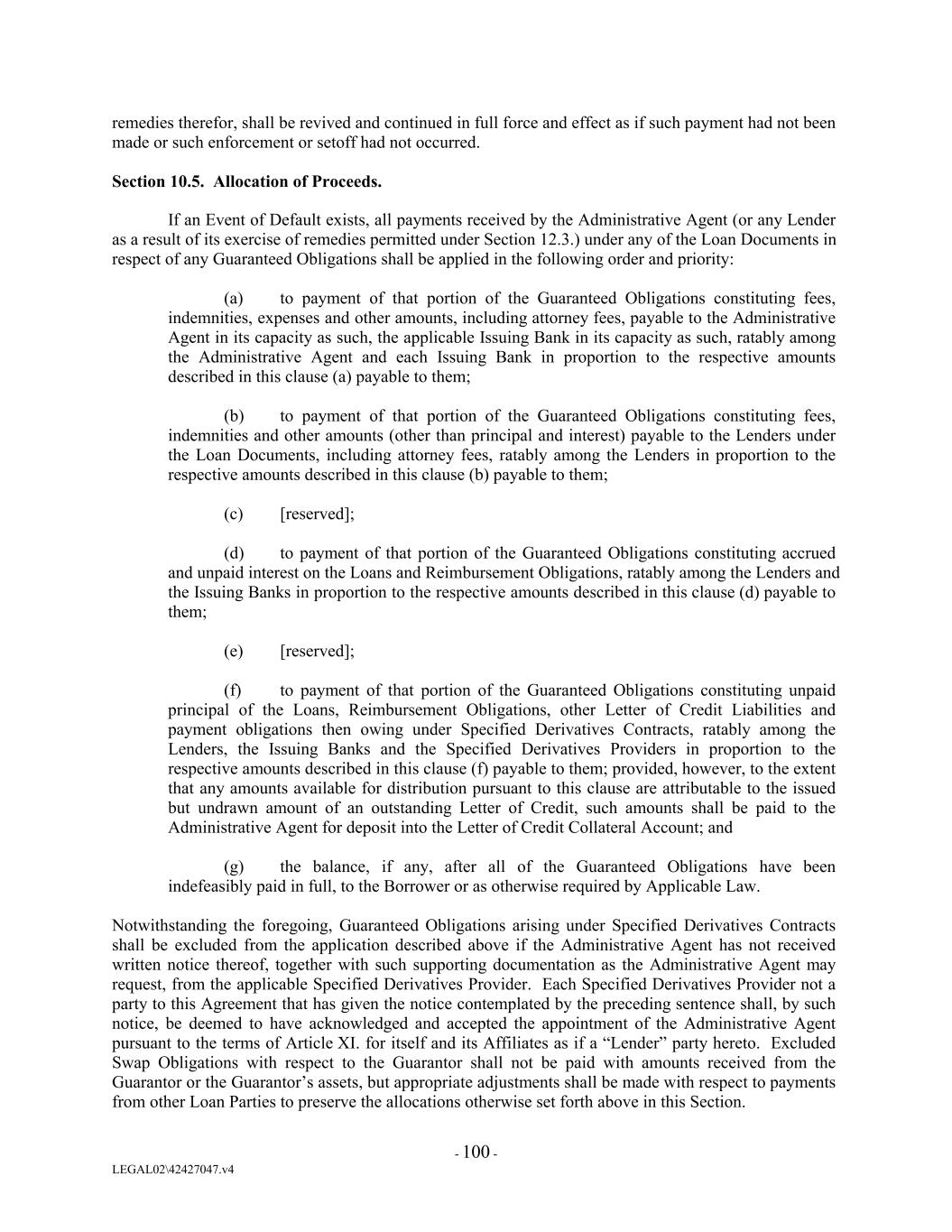 remedies therefor, shall be revived and continued in full force and effect as if such payment had not been made or such enforcement or setoff had not occurred. Section 10.5. Allocation of Proceeds. If an Event of Default exists, all payments received by the Administrative Agent (or any Lender as a result of its exercise of remedies permitted under Section 12.3.) under any of the Loan Documents in respect of any Guaranteed Obligations shall be applied in the following order and priority: (a) to payment of that portion of the Guaranteed Obligations constituting fees, indemnities, expenses and other amounts, including attorney fees, payable to the Administrative Agent in its capacity as such, the applicable Issuing Bank in its capacity as such, ratably among the Administrative Agent and each Issuing Bank in proportion to the respective amounts described in this clause (a) payable to them; (b) to payment of that portion of the Guaranteed Obligations constituting fees, indemnities and other amounts (other than principal and interest) payable to the Lenders under the Loan Documents, including attorney fees, ratably among the Lenders in proportion to the respective amounts described in this clause (b) payable to them; (c) [reserved]; (d) to payment of that portion of the Guaranteed Obligations constituting accrued and unpaid interest on the Loans and Reimbursement Obligations, ratably among the Lenders and the Issuing Banks in proportion to the respective amounts described in this clause (d) payable to them; (e) [reserved]; (f) to payment of that portion of the Guaranteed Obligations constituting unpaid principal of the Loans, Reimbursement Obligations, other Letter of Credit Liabilities and payment obligations then owing under Specified Derivatives Contracts, ratably among the Lenders, the Issuing Banks and the Specified Derivatives Providers in proportion to the respective amounts described in this clause (f) payable to them; provided, however, to the extent that any amounts available for distribution pursuant to this clause are attributable to the issued but undrawn amount of an outstanding Letter of Credit, such amounts shall be paid to the Administrative Agent for deposit into the Letter of Credit Collateral Account; and (g) the balance, if any, after all of the Guaranteed Obligations have been indefeasibly paid in full, to the Borrower or as otherwise required by Applicable Law. Notwithstanding the foregoing, Guaranteed Obligations arising under Specified Derivatives Contracts shall be excluded from the application described above if the Administrative Agent has not received written notice thereof, together with such supporting documentation as the Administrative Agent may request, from the applicable Specified Derivatives Provider. Each Specified Derivatives Provider not a party to this Agreement that has given the notice contemplated by the preceding sentence shall, by such notice, be deemed to have acknowledged and accepted the appointment of the Administrative Agent pursuant to the terms of Article XI. for itself and its Affiliates as if a “Lender” party hereto. Excluded Swap Obligations with respect to the Guarantor shall not be paid with amounts received from the Guarantor or the Guarantor’s assets, but appropriate adjustments shall be made with respect to payments from other Loan Parties to preserve the allocations otherwise set forth above in this Section. - 100 - LEGAL02\42427047.v4