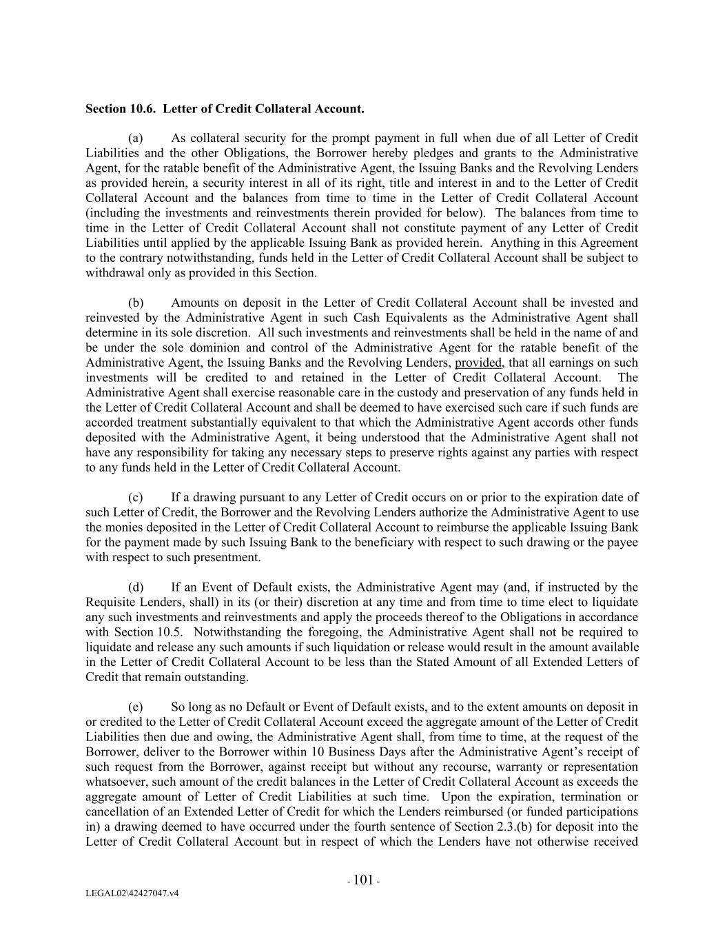 Section 10.6. Letter of Credit Collateral Account. (a) As collateral security for the prompt payment in full when due of all Letter of Credit Liabilities and the other Obligations, the Borrower hereby pledges and grants to the Administrative Agent, for the ratable benefit of the Administrative Agent, the Issuing Banks and the Revolving Lenders as provided herein, a security interest in all of its right, title and interest in and to the Letter of Credit Collateral Account and the balances from time to time in the Letter of Credit Collateral Account (including the investments and reinvestments therein provided for below). The balances from time to time in the Letter of Credit Collateral Account shall not constitute payment of any Letter of Credit Liabilities until applied by the applicable Issuing Bank as provided herein. Anything in this Agreement to the contrary notwithstanding, funds held in the Letter of Credit Collateral Account shall be subject to withdrawal only as provided in this Section. (b) Amounts on deposit in the Letter of Credit Collateral Account shall be invested and reinvested by the Administrative Agent in such Cash Equivalents as the Administrative Agent shall determine in its sole discretion. All such investments and reinvestments shall be held in the name of and be under the sole dominion and control of the Administrative Agent for the ratable benefit of the Administrative Agent, the Issuing Banks and the Revolving Lenders, provided, that all earnings on such investments will be credited to and retained in the Letter of Credit Collateral Account. The Administrative Agent shall exercise reasonable care in the custody and preservation of any funds held in the Letter of Credit Collateral Account and shall be deemed to have exercised such care if such funds are accorded treatment substantially equivalent to that which the Administrative Agent accords other funds deposited with the Administrative Agent, it being understood that the Administrative Agent shall not have any responsibility for taking any necessary steps to preserve rights against any parties with respect to any funds held in the Letter of Credit Collateral Account. (c) If a drawing pursuant to any Letter of Credit occurs on or prior to the expiration date of such Letter of Credit, the Borrower and the Revolving Lenders authorize the Administrative Agent to use the monies deposited in the Letter of Credit Collateral Account to reimburse the applicable Issuing Bank for the payment made by such Issuing Bank to the beneficiary with respect to such drawing or the payee with respect to such presentment. (d) If an Event of Default exists, the Administrative Agent may (and, if instructed by the Requisite Lenders, shall) in its (or their) discretion at any time and from time to time elect to liquidate any such investments and reinvestments and apply the proceeds thereof to the Obligations in accordance with Section 10.5. Notwithstanding the foregoing, the Administrative Agent shall not be required to liquidate and release any such amounts if such liquidation or release would result in the amount available in the Letter of Credit Collateral Account to be less than the Stated Amount of all Extended Letters of Credit that remain outstanding. (e) So long as no Default or Event of Default exists, and to the extent amounts on deposit in or credited to the Letter of Credit Collateral Account exceed the aggregate amount of the Letter of Credit Liabilities then due and owing, the Administrative Agent shall, from time to time, at the request of the Borrower, deliver to the Borrower within 10 Business Days after the Administrative Agent’s receipt of such request from the Borrower, against receipt but without any recourse, warranty or representation whatsoever, such amount of the credit balances in the Letter of Credit Collateral Account as exceeds the aggregate amount of Letter of Credit Liabilities at such time. Upon the expiration, termination or cancellation of an Extended Letter of Credit for which the Lenders reimbursed (or funded participations in) a drawing deemed to have occurred under the fourth sentence of Section 2.3.(b) for deposit into the Letter of Credit Collateral Account but in respect of which the Lenders have not otherwise received - 101 - LEGAL02\42427047.v4