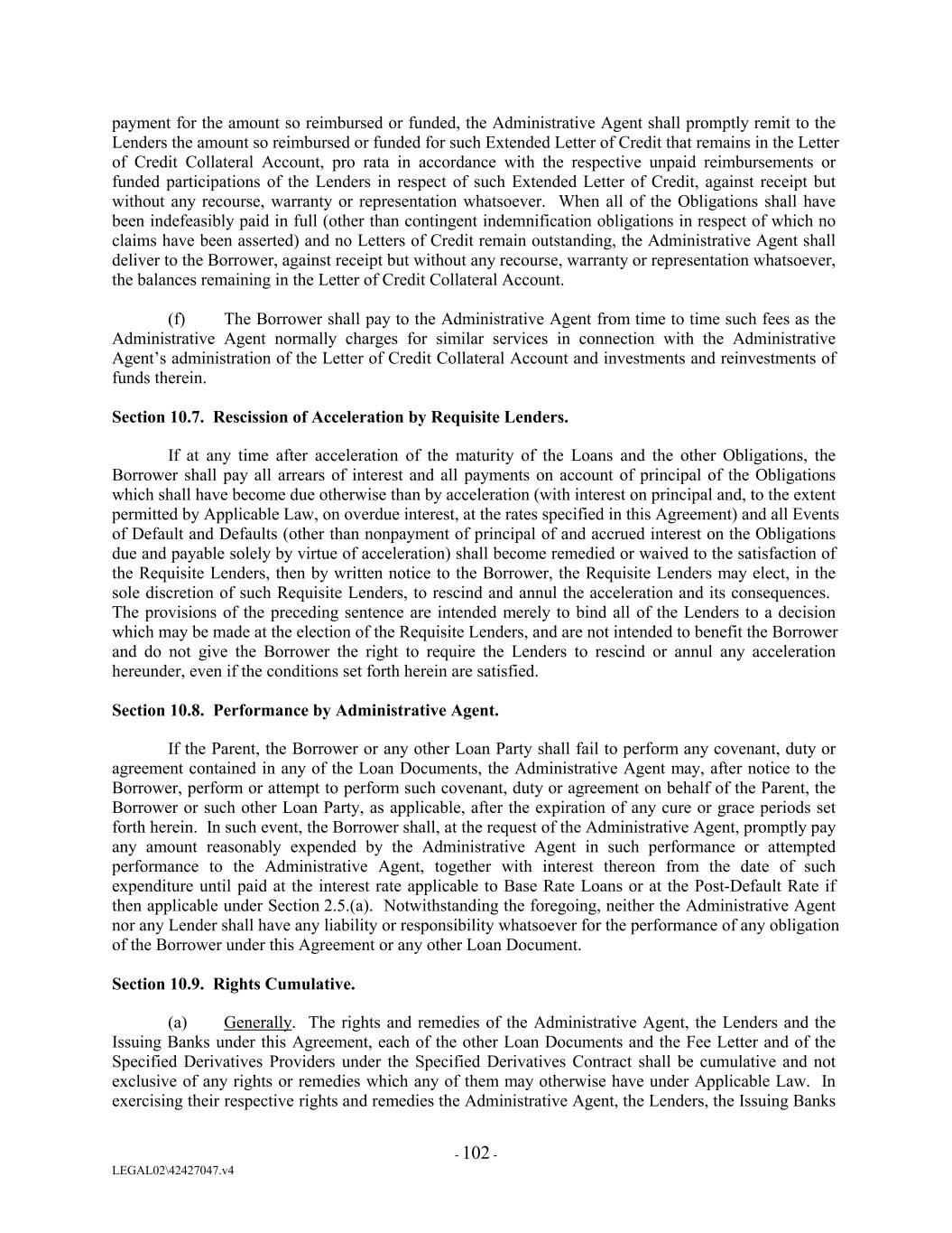 payment for the amount so reimbursed or funded, the Administrative Agent shall promptly remit to the Lenders the amount so reimbursed or funded for such Extended Letter of Credit that remains in the Letter of Credit Collateral Account, pro rata in accordance with the respective unpaid reimbursements or funded participations of the Lenders in respect of such Extended Letter of Credit, against receipt but without any recourse, warranty or representation whatsoever. When all of the Obligations shall have been indefeasibly paid in full (other than contingent indemnification obligations in respect of which no claims have been asserted) and no Letters of Credit remain outstanding, the Administrative Agent shall deliver to the Borrower, against receipt but without any recourse, warranty or representation whatsoever, the balances remaining in the Letter of Credit Collateral Account. (f) The Borrower shall pay to the Administrative Agent from time to time such fees as the Administrative Agent normally charges for similar services in connection with the Administrative Agent’s administration of the Letter of Credit Collateral Account and investments and reinvestments of funds therein. Section 10.7. Rescission of Acceleration by Requisite Lenders. If at any time after acceleration of the maturity of the Loans and the other Obligations, the Borrower shall pay all arrears of interest and all payments on account of principal of the Obligations which shall have become due otherwise than by acceleration (with interest on principal and, to the extent permitted by Applicable Law, on overdue interest, at the rates specified in this Agreement) and all Events of Default and Defaults (other than nonpayment of principal of and accrued interest on the Obligations due and payable solely by virtue of acceleration) shall become remedied or waived to the satisfaction of the Requisite Lenders, then by written notice to the Borrower, the Requisite Lenders may elect, in the sole discretion of such Requisite Lenders, to rescind and annul the acceleration and its consequences. The provisions of the preceding sentence are intended merely to bind all of the Lenders to a decision which may be made at the election of the Requisite Lenders, and are not intended to benefit the Borrower and do not give the Borrower the right to require the Lenders to rescind or annul any acceleration hereunder, even if the conditions set forth herein are satisfied. Section 10.8. Performance by Administrative Agent. If the Parent, the Borrower or any other Loan Party shall fail to perform any covenant, duty or agreement contained in any of the Loan Documents, the Administrative Agent may, after notice to the Borrower, perform or attempt to perform such covenant, duty or agreement on behalf of the Parent, the Borrower or such other Loan Party, as applicable, after the expiration of any cure or grace periods set forth herein. In such event, the Borrower shall, at the request of the Administrative Agent, promptly pay any amount reasonably expended by the Administrative Agent in such performance or attempted performance to the Administrative Agent, together with interest thereon from the date of such expenditure until paid at the interest rate applicable to Base Rate Loans or at the Post-Default Rate if then applicable under Section 2.5.(a). Notwithstanding the foregoing, neither the Administrative Agent nor any Lender shall have any liability or responsibility whatsoever for the performance of any obligation of the Borrower under this Agreement or any other Loan Document. Section 10.9. Rights Cumulative. (a) Generally. The rights and remedies of the Administrative Agent, the Lenders and the Issuing Banks under this Agreement, each of the other Loan Documents and the Fee Letter and of the Specified Derivatives Providers under the Specified Derivatives Contract shall be cumulative and not exclusive of any rights or remedies which any of them may otherwise have under Applicable Law. In exercising their respective rights and remedies the Administrative Agent, the Lenders, the Issuing Banks - 102 - LEGAL02\42427047.v4