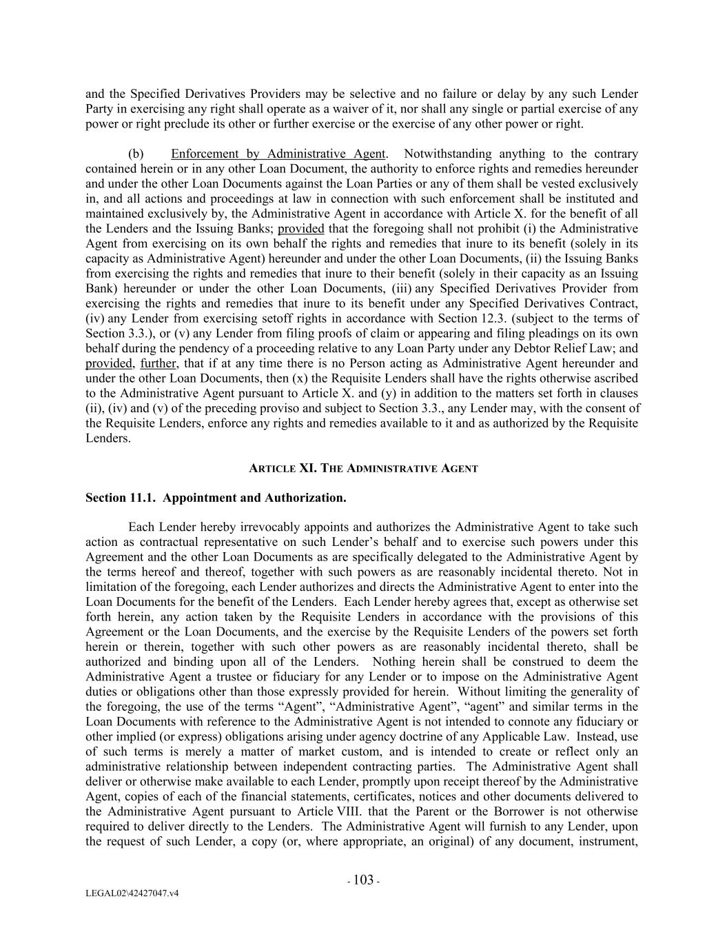and the Specified Derivatives Providers may be selective and no failure or delay by any such Lender Party in exercising any right shall operate as a waiver of it, nor shall any single or partial exercise of any power or right preclude its other or further exercise or the exercise of any other power or right. (b) Enforcement by Administrative Agent. Notwithstanding anything to the contrary contained herein or in any other Loan Document, the authority to enforce rights and remedies hereunder and under the other Loan Documents against the Loan Parties or any of them shall be vested exclusively in, and all actions and proceedings at law in connection with such enforcement shall be instituted and maintained exclusively by, the Administrative Agent in accordance with Article X. for the benefit of all the Lenders and the Issuing Banks; provided that the foregoing shall not prohibit (i) the Administrative Agent from exercising on its own behalf the rights and remedies that inure to its benefit (solely in its capacity as Administrative Agent) hereunder and under the other Loan Documents, (ii) the Issuing Banks from exercising the rights and remedies that inure to their benefit (solely in their capacity as an Issuing Bank) hereunder or under the other Loan Documents, (iii) any Specified Derivatives Provider from exercising the rights and remedies that inure to its benefit under any Specified Derivatives Contract, (iv) any Lender from exercising setoff rights in accordance with Section 12.3. (subject to the terms of Section 3.3.), or (v) any Lender from filing proofs of claim or appearing and filing pleadings on its own behalf during the pendency of a proceeding relative to any Loan Party under any Debtor Relief Law; and provided, further, that if at any time there is no Person acting as Administrative Agent hereunder and under the other Loan Documents, then (x) the Requisite Lenders shall have the rights otherwise ascribed to the Administrative Agent pursuant to Article X. and (y) in addition to the matters set forth in clauses (ii), (iv) and (v) of the preceding proviso and subject to Section 3.3., any Lender may, with the consent of the Requisite Lenders, enforce any rights and remedies available to it and as authorized by the Requisite Lenders. ARTICLE XI. THE ADMINISTRATIVE AGENT Section 11.1. Appointment and Authorization. Each Lender hereby irrevocably appoints and authorizes the Administrative Agent to take such action as contractual representative on such Lender’s behalf and to exercise such powers under this Agreement and the other Loan Documents as are specifically delegated to the Administrative Agent by the terms hereof and thereof, together with such powers as are reasonably incidental thereto. Not in limitation of the foregoing, each Lender authorizes and directs the Administrative Agent to enter into the Loan Documents for the benefit of the Lenders. Each Lender hereby agrees that, except as otherwise set forth herein, any action taken by the Requisite Lenders in accordance with the provisions of this Agreement or the Loan Documents, and the exercise by the Requisite Lenders of the powers set forth herein or therein, together with such other powers as are reasonably incidental thereto, shall be authorized and binding upon all of the Lenders. Nothing herein shall be construed to deem the Administrative Agent a trustee or fiduciary for any Lender or to impose on the Administrative Agent duties or obligations other than those expressly provided for herein. Without limiting the generality of the foregoing, the use of the terms “Agent”, “Administrative Agent”, “agent” and similar terms in the Loan Documents with reference to the Administrative Agent is not intended to connote any fiduciary or other implied (or express) obligations arising under agency doctrine of any Applicable Law. Instead, use of such terms is merely a matter of market custom, and is intended to create or reflect only an administrative relationship between independent contracting parties. The Administrative Agent shall deliver or otherwise make available to each Lender, promptly upon receipt thereof by the Administrative Agent, copies of each of the financial statements, certificates, notices and other documents delivered to the Administrative Agent pursuant to Article VIII. that the Parent or the Borrower is not otherwise required to deliver directly to the Lenders. The Administrative Agent will furnish to any Lender, upon the request of such Lender, a copy (or, where appropriate, an original) of any document, instrument, - 103 - LEGAL02\42427047.v4