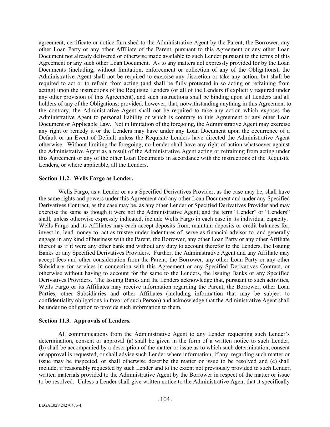 agreement, certificate or notice furnished to the Administrative Agent by the Parent, the Borrower, any other Loan Party or any other Affiliate of the Parent, pursuant to this Agreement or any other Loan Document not already delivered or otherwise made available to such Lender pursuant to the terms of this Agreement or any such other Loan Document. As to any matters not expressly provided for by the Loan Documents (including, without limitation, enforcement or collection of any of the Obligations), the Administrative Agent shall not be required to exercise any discretion or take any action, but shall be required to act or to refrain from acting (and shall be fully protected in so acting or refraining from acting) upon the instructions of the Requisite Lenders (or all of the Lenders if explicitly required under any other provision of this Agreement), and such instructions shall be binding upon all Lenders and all holders of any of the Obligations; provided, however, that, notwithstanding anything in this Agreement to the contrary, the Administrative Agent shall not be required to take any action which exposes the Administrative Agent to personal liability or which is contrary to this Agreement or any other Loan Document or Applicable Law. Not in limitation of the foregoing, the Administrative Agent may exercise any right or remedy it or the Lenders may have under any Loan Document upon the occurrence of a Default or an Event of Default unless the Requisite Lenders have directed the Administrative Agent otherwise. Without limiting the foregoing, no Lender shall have any right of action whatsoever against the Administrative Agent as a result of the Administrative Agent acting or refraining from acting under this Agreement or any of the other Loan Documents in accordance with the instructions of the Requisite Lenders, or where applicable, all the Lenders. Section 11.2. Wells Fargo as Lender. Wells Fargo, as a Lender or as a Specified Derivatives Provider, as the case may be, shall have the same rights and powers under this Agreement and any other Loan Document and under any Specified Derivatives Contract, as the case may be, as any other Lender or Specified Derivatives Provider and may exercise the same as though it were not the Administrative Agent; and the term “Lender” or “Lenders” shall, unless otherwise expressly indicated, include Wells Fargo in each case in its individual capacity. Wells Fargo and its Affiliates may each accept deposits from, maintain deposits or credit balances for, invest in, lend money to, act as trustee under indentures of, serve as financial advisor to, and generally engage in any kind of business with the Parent, the Borrower, any other Loan Party or any other Affiliate thereof as if it were any other bank and without any duty to account therefor to the Lenders, the Issuing Banks or any Specified Derivatives Providers. Further, the Administrative Agent and any Affiliate may accept fees and other consideration from the Parent, the Borrower, any other Loan Party or any other Subsidiary for services in connection with this Agreement or any Specified Derivatives Contract, or otherwise without having to account for the same to the Lenders, the Issuing Banks or any Specified Derivatives Providers. The Issuing Banks and the Lenders acknowledge that, pursuant to such activities, Wells Fargo or its Affiliates may receive information regarding the Parent, the Borrower, other Loan Parties, other Subsidiaries and other Affiliates (including information that may be subject to confidentiality obligations in favor of such Person) and acknowledge that the Administrative Agent shall be under no obligation to provide such information to them. Section 11.3. Approvals of Lenders. All communications from the Administrative Agent to any Lender requesting such Lender’s determination, consent or approval (a) shall be given in the form of a written notice to such Lender, (b) shall be accompanied by a description of the matter or issue as to which such determination, consent or approval is requested, or shall advise such Lender where information, if any, regarding such matter or issue may be inspected, or shall otherwise describe the matter or issue to be resolved and (c) shall include, if reasonably requested by such Lender and to the extent not previously provided to such Lender, written materials provided to the Administrative Agent by the Borrower in respect of the matter or issue to be resolved. Unless a Lender shall give written notice to the Administrative Agent that it specifically - 104 - LEGAL02\42427047.v4