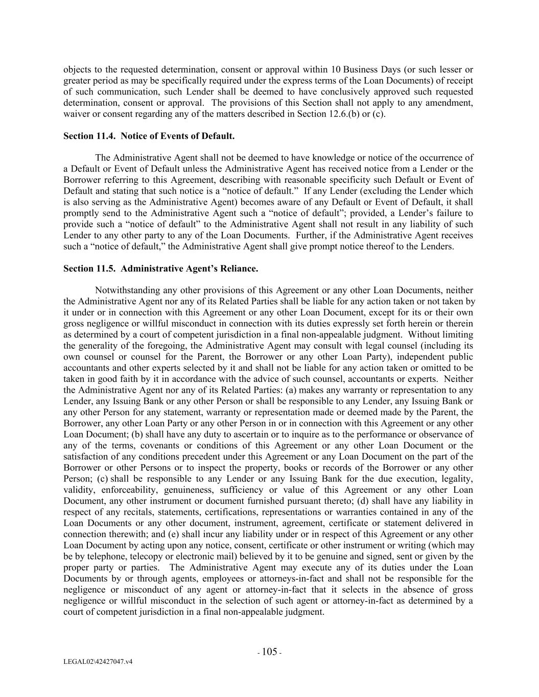 objects to the requested determination, consent or approval within 10 Business Days (or such lesser or greater period as may be specifically required under the express terms of the Loan Documents) of receipt of such communication, such Lender shall be deemed to have conclusively approved such requested determination, consent or approval. The provisions of this Section shall not apply to any amendment, waiver or consent regarding any of the matters described in Section 12.6.(b) or (c). Section 11.4. Notice of Events of Default. The Administrative Agent shall not be deemed to have knowledge or notice of the occurrence of a Default or Event of Default unless the Administrative Agent has received notice from a Lender or the Borrower referring to this Agreement, describing with reasonable specificity such Default or Event of Default and stating that such notice is a “notice of default.” If any Lender (excluding the Lender which is also serving as the Administrative Agent) becomes aware of any Default or Event of Default, it shall promptly send to the Administrative Agent such a “notice of default”; provided, a Lender’s failure to provide such a “notice of default” to the Administrative Agent shall not result in any liability of such Lender to any other party to any of the Loan Documents. Further, if the Administrative Agent receives such a “notice of default,” the Administrative Agent shall give prompt notice thereof to the Lenders. Section 11.5. Administrative Agent’s Reliance. Notwithstanding any other provisions of this Agreement or any other Loan Documents, neither the Administrative Agent nor any of its Related Parties shall be liable for any action taken or not taken by it under or in connection with this Agreement or any other Loan Document, except for its or their own gross negligence or willful misconduct in connection with its duties expressly set forth herein or therein as determined by a court of competent jurisdiction in a final non-appealable judgment. Without limiting the generality of the foregoing, the Administrative Agent may consult with legal counsel (including its own counsel or counsel for the Parent, the Borrower or any other Loan Party), independent public accountants and other experts selected by it and shall not be liable for any action taken or omitted to be taken in good faith by it in accordance with the advice of such counsel, accountants or experts. Neither the Administrative Agent nor any of its Related Parties: (a) makes any warranty or representation to any Lender, any Issuing Bank or any other Person or shall be responsible to any Lender, any Issuing Bank or any other Person for any statement, warranty or representation made or deemed made by the Parent, the Borrower, any other Loan Party or any other Person in or in connection with this Agreement or any other Loan Document; (b) shall have any duty to ascertain or to inquire as to the performance or observance of any of the terms, covenants or conditions of this Agreement or any other Loan Document or the satisfaction of any conditions precedent under this Agreement or any Loan Document on the part of the Borrower or other Persons or to inspect the property, books or records of the Borrower or any other Person; (c) shall be responsible to any Lender or any Issuing Bank for the due execution, legality, validity, enforceability, genuineness, sufficiency or value of this Agreement or any other Loan Document, any other instrument or document furnished pursuant thereto; (d) shall have any liability in respect of any recitals, statements, certifications, representations or warranties contained in any of the Loan Documents or any other document, instrument, agreement, certificate or statement delivered in connection therewith; and (e) shall incur any liability under or in respect of this Agreement or any other Loan Document by acting upon any notice, consent, certificate or other instrument or writing (which may be by telephone, telecopy or electronic mail) believed by it to be genuine and signed, sent or given by the proper party or parties. The Administrative Agent may execute any of its duties under the Loan Documents by or through agents, employees or attorneys-in-fact and shall not be responsible for the negligence or misconduct of any agent or attorney-in-fact that it selects in the absence of gross negligence or willful misconduct in the selection of such agent or attorney-in-fact as determined by a court of competent jurisdiction in a final non-appealable judgment. - 105 - LEGAL02\42427047.v4