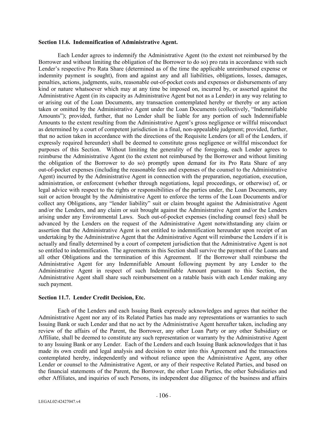 Section 11.6. Indemnification of Administrative Agent. Each Lender agrees to indemnify the Administrative Agent (to the extent not reimbursed by the Borrower and without limiting the obligation of the Borrower to do so) pro rata in accordance with such Lender’s respective Pro Rata Share (determined as of the time the applicable unreimbursed expense or indemnity payment is sought), from and against any and all liabilities, obligations, losses, damages, penalties, actions, judgments, suits, reasonable out-of-pocket costs and expenses or disbursements of any kind or nature whatsoever which may at any time be imposed on, incurred by, or asserted against the Administrative Agent (in its capacity as Administrative Agent but not as a Lender) in any way relating to or arising out of the Loan Documents, any transaction contemplated hereby or thereby or any action taken or omitted by the Administrative Agent under the Loan Documents (collectively, “Indemnifiable Amounts”); provided, further, that no Lender shall be liable for any portion of such Indemnifiable Amounts to the extent resulting from the Administrative Agent’s gross negligence or willful misconduct as determined by a court of competent jurisdiction in a final, non-appealable judgment; provided, further, that no action taken in accordance with the directions of the Requisite Lenders (or all of the Lenders, if expressly required hereunder) shall be deemed to constitute gross negligence or willful misconduct for purposes of this Section. Without limiting the generality of the foregoing, each Lender agrees to reimburse the Administrative Agent (to the extent not reimbursed by the Borrower and without limiting the obligation of the Borrower to do so) promptly upon demand for its Pro Rata Share of any out-of-pocket expenses (including the reasonable fees and expenses of the counsel to the Administrative Agent) incurred by the Administrative Agent in connection with the preparation, negotiation, execution, administration, or enforcement (whether through negotiations, legal proceedings, or otherwise) of, or legal advice with respect to the rights or responsibilities of the parties under, the Loan Documents, any suit or action brought by the Administrative Agent to enforce the terms of the Loan Documents and/or collect any Obligations, any “lender liability” suit or claim brought against the Administrative Agent and/or the Lenders, and any claim or suit brought against the Administrative Agent and/or the Lenders arising under any Environmental Laws. Such out-of-pocket expenses (including counsel fees) shall be advanced by the Lenders on the request of the Administrative Agent notwithstanding any claim or assertion that the Administrative Agent is not entitled to indemnification hereunder upon receipt of an undertaking by the Administrative Agent that the Administrative Agent will reimburse the Lenders if it is actually and finally determined by a court of competent jurisdiction that the Administrative Agent is not so entitled to indemnification. The agreements in this Section shall survive the payment of the Loans and all other Obligations and the termination of this Agreement. If the Borrower shall reimburse the Administrative Agent for any Indemnifiable Amount following payment by any Lender to the Administrative Agent in respect of such Indemnifiable Amount pursuant to this Section, the Administrative Agent shall share such reimbursement on a ratable basis with each Lender making any such payment. Section 11.7. Lender Credit Decision, Etc. Each of the Lenders and each Issuing Bank expressly acknowledges and agrees that neither the Administrative Agent nor any of its Related Parties has made any representations or warranties to such Issuing Bank or such Lender and that no act by the Administrative Agent hereafter taken, including any review of the affairs of the Parent, the Borrower, any other Loan Party or any other Subsidiary or Affiliate, shall be deemed to constitute any such representation or warranty by the Administrative Agent to any Issuing Bank or any Lender. Each of the Lenders and each Issuing Bank acknowledges that it has made its own credit and legal analysis and decision to enter into this Agreement and the transactions contemplated hereby, independently and without reliance upon the Administrative Agent, any other Lender or counsel to the Administrative Agent, or any of their respective Related Parties, and based on the financial statements of the Parent, the Borrower, the other Loan Parties, the other Subsidiaries and other Affiliates, and inquiries of such Persons, its independent due diligence of the business and affairs - 106 - LEGAL02\42427047.v4