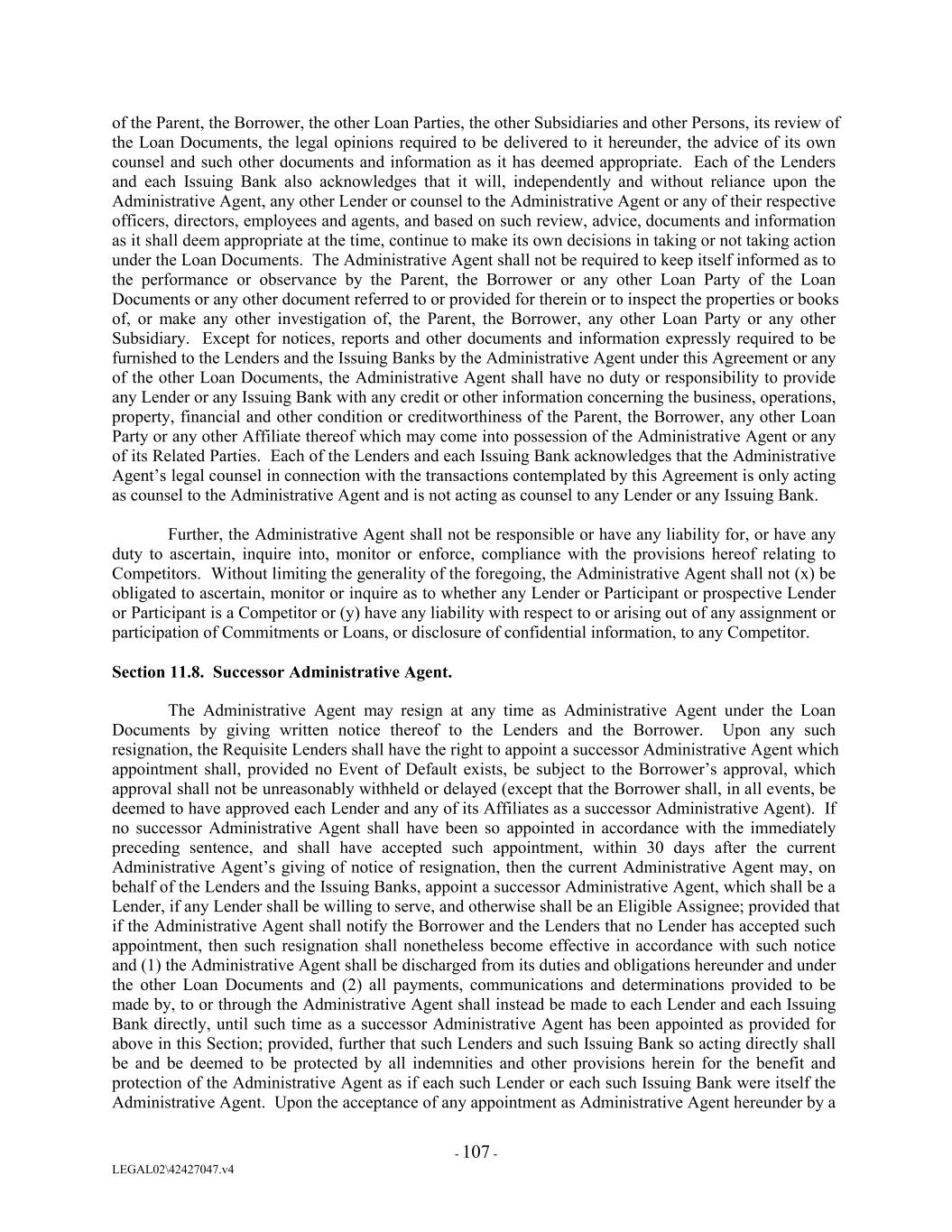 of the Parent, the Borrower, the other Loan Parties, the other Subsidiaries and other Persons, its review of the Loan Documents, the legal opinions required to be delivered to it hereunder, the advice of its own counsel and such other documents and information as it has deemed appropriate. Each of the Lenders and each Issuing Bank also acknowledges that it will, independently and without reliance upon the Administrative Agent, any other Lender or counsel to the Administrative Agent or any of their respective officers, directors, employees and agents, and based on such review, advice, documents and information as it shall deem appropriate at the time, continue to make its own decisions in taking or not taking action under the Loan Documents. The Administrative Agent shall not be required to keep itself informed as to the performance or observance by the Parent, the Borrower or any other Loan Party of the Loan Documents or any other document referred to or provided for therein or to inspect the properties or books of, or make any other investigation of, the Parent, the Borrower, any other Loan Party or any other Subsidiary. Except for notices, reports and other documents and information expressly required to be furnished to the Lenders and the Issuing Banks by the Administrative Agent under this Agreement or any of the other Loan Documents, the Administrative Agent shall have no duty or responsibility to provide any Lender or any Issuing Bank with any credit or other information concerning the business, operations, property, financial and other condition or creditworthiness of the Parent, the Borrower, any other Loan Party or any other Affiliate thereof which may come into possession of the Administrative Agent or any of its Related Parties. Each of the Lenders and each Issuing Bank acknowledges that the Administrative Agent’s legal counsel in connection with the transactions contemplated by this Agreement is only acting as counsel to the Administrative Agent and is not acting as counsel to any Lender or any Issuing Bank. Further, the Administrative Agent shall not be responsible or have any liability for, or have any duty to ascertain, inquire into, monitor or enforce, compliance with the provisions hereof relating to Competitors. Without limiting the generality of the foregoing, the Administrative Agent shall not (x) be obligated to ascertain, monitor or inquire as to whether any Lender or Participant or prospective Lender or Participant is a Competitor or (y) have any liability with respect to or arising out of any assignment or participation of Commitments or Loans, or disclosure of confidential information, to any Competitor. Section 11.8. Successor Administrative Agent. The Administrative Agent may resign at any time as Administrative Agent under the Loan Documents by giving written notice thereof to the Lenders and the Borrower. Upon any such resignation, the Requisite Lenders shall have the right to appoint a successor Administrative Agent which appointment shall, provided no Event of Default exists, be subject to the Borrower’s approval, which approval shall not be unreasonably withheld or delayed (except that the Borrower shall, in all events, be deemed to have approved each Lender and any of its Affiliates as a successor Administrative Agent). If no successor Administrative Agent shall have been so appointed in accordance with the immediately preceding sentence, and shall have accepted such appointment, within 30 days after the current Administrative Agent’s giving of notice of resignation, then the current Administrative Agent may, on behalf of the Lenders and the Issuing Banks, appoint a successor Administrative Agent, which shall be a Lender, if any Lender shall be willing to serve, and otherwise shall be an Eligible Assignee; provided that if the Administrative Agent shall notify the Borrower and the Lenders that no Lender has accepted such appointment, then such resignation shall nonetheless become effective in accordance with such notice and (1) the Administrative Agent shall be discharged from its duties and obligations hereunder and under the other Loan Documents and (2) all payments, communications and determinations provided to be made by, to or through the Administrative Agent shall instead be made to each Lender and each Issuing Bank directly, until such time as a successor Administrative Agent has been appointed as provided for above in this Section; provided, further that such Lenders and such Issuing Bank so acting directly shall be and be deemed to be protected by all indemnities and other provisions herein for the benefit and protection of the Administrative Agent as if each such Lender or each such Issuing Bank were itself the Administrative Agent. Upon the acceptance of any appointment as Administrative Agent hereunder by a - 107 - LEGAL02\42427047.v4